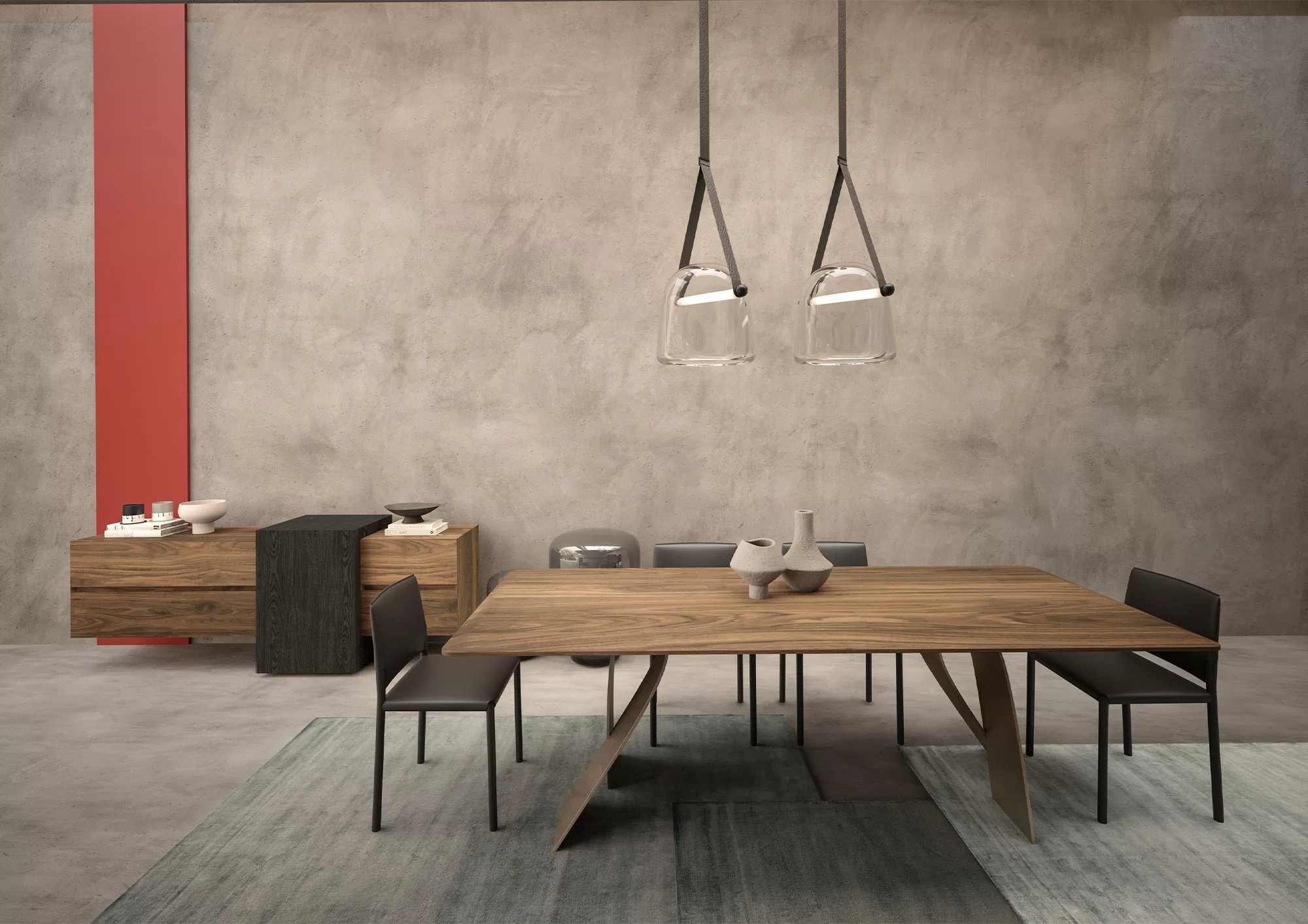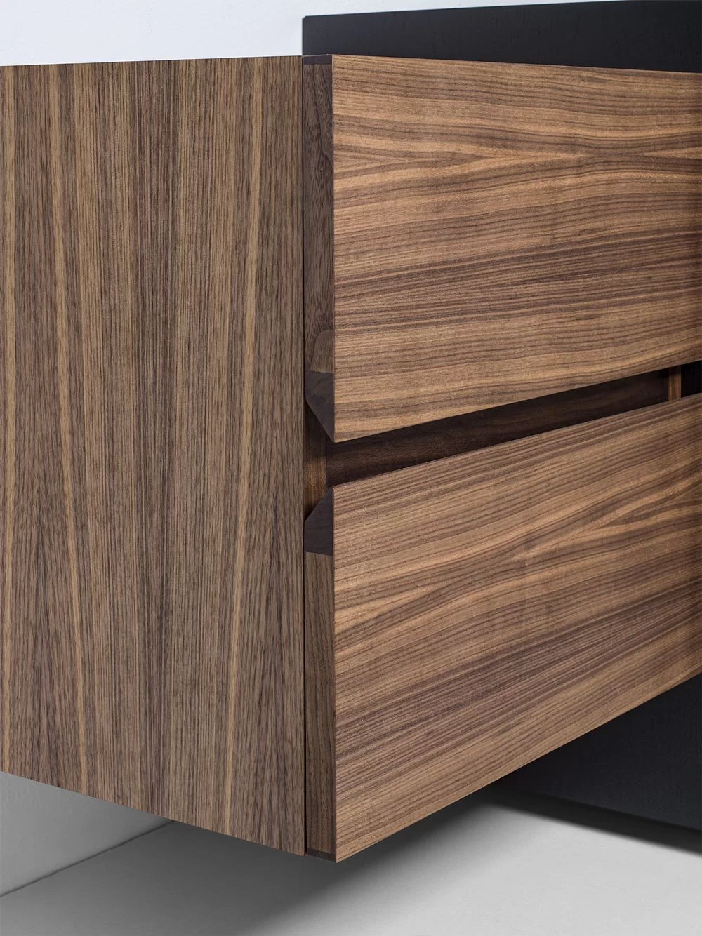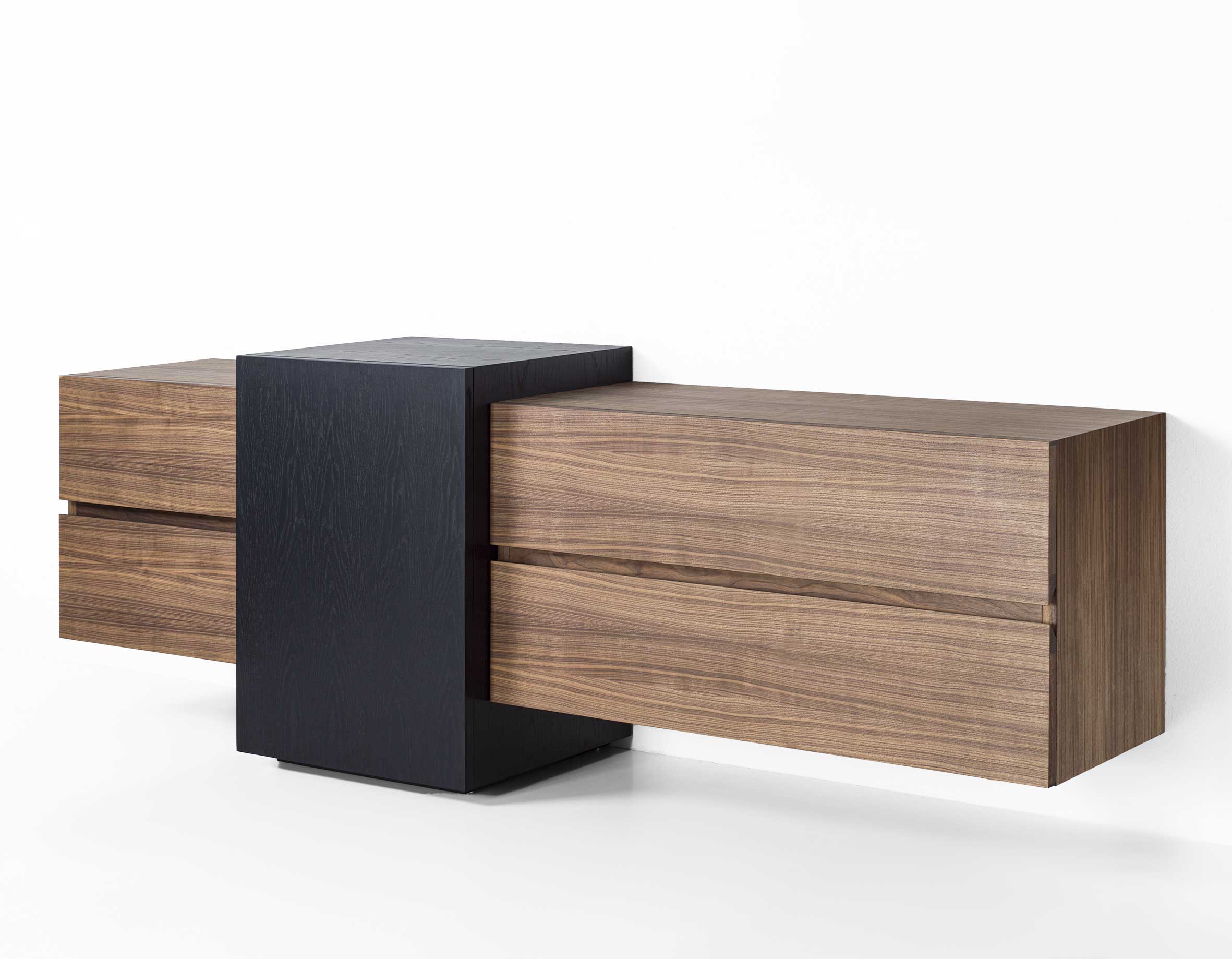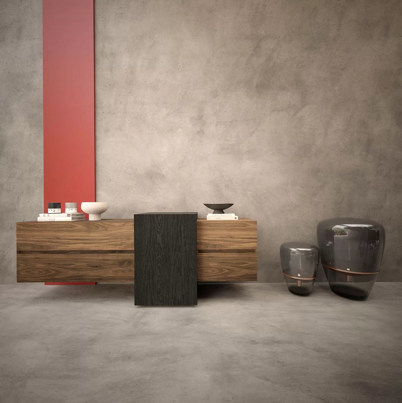 Credenza in legno massello e listellare composta da tre moduli. Il modulo centrale con all’interno due ripiani, è caratterizzato da un’anta contenitiva, con portabottiglie in massello, e sistema di chiusura ammortizzato. I moduli laterali, sospesi, sono costituiti da cassetti con tradizionale incastro a coda di rondine e maniglia fresata.