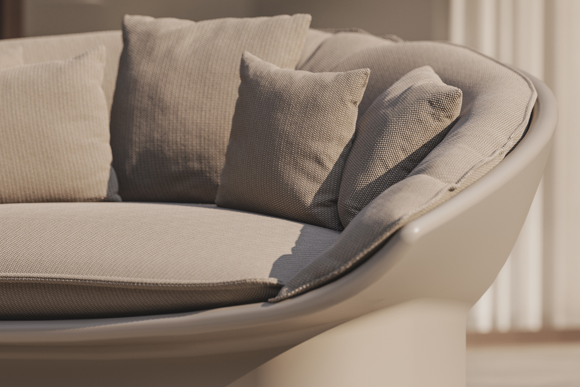 The Luna daybed, designed by Ramón Esteve, combines sustainability and supreme comfort. Made of 100% recyclable polyethylene through rotational moulding, it incorporates polyurethane foam and synthetic fibre cushions, guaranteeing an exceptional rest experience.