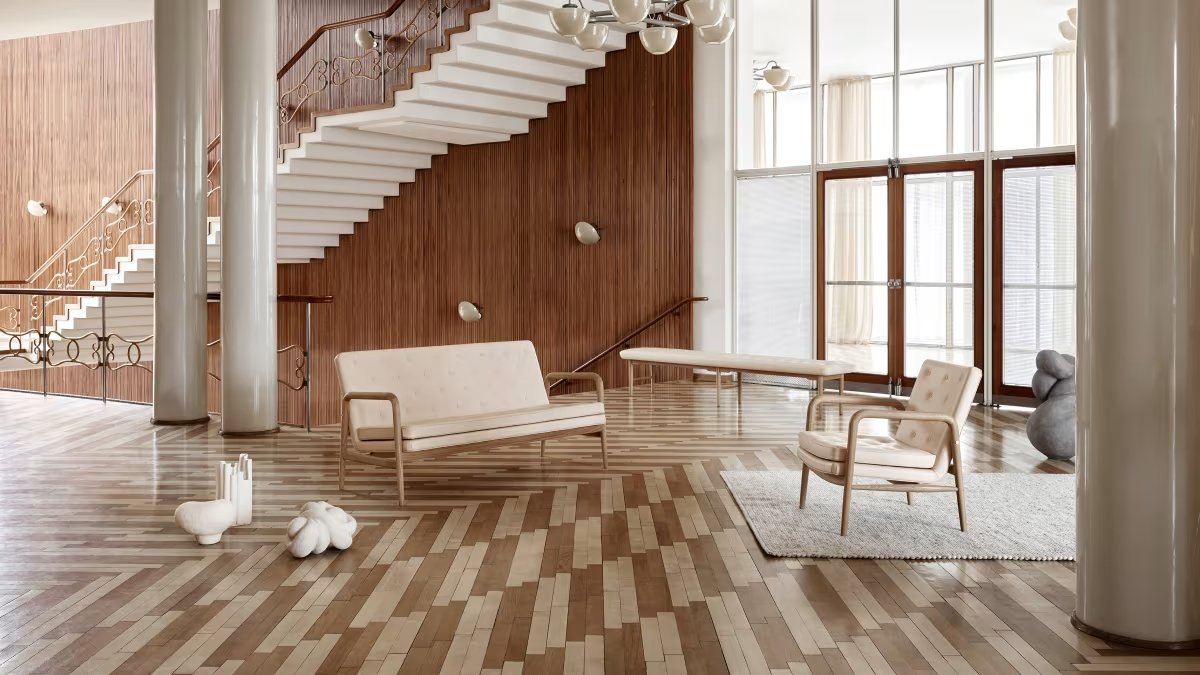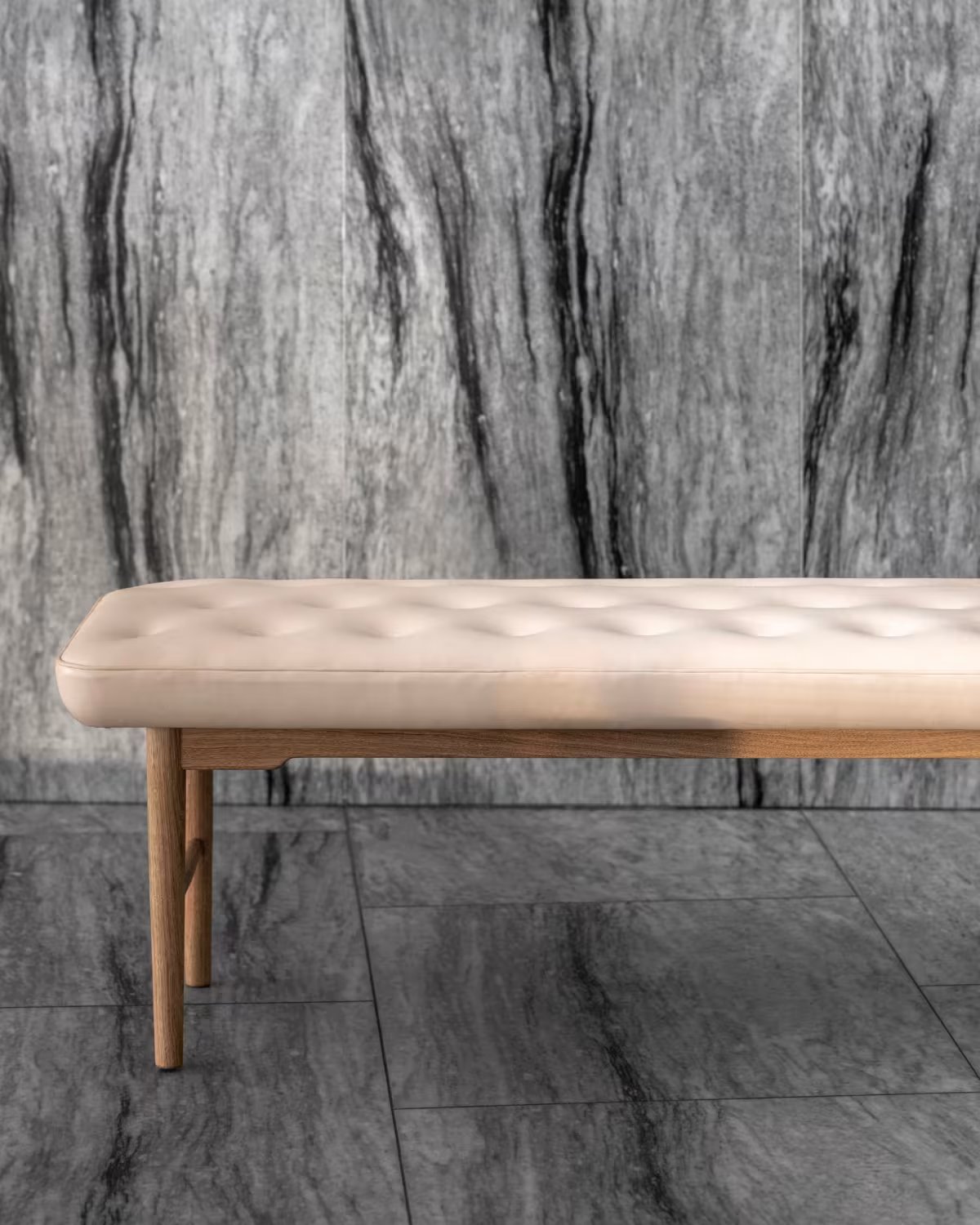 The Foyer Bench has a delicate idiom and is meticulously upholstered with handmade buttons. The Foyer Series was exclusively created by Vilhelm Lauritzen for Radiohuset in Copenhagen in 1945.