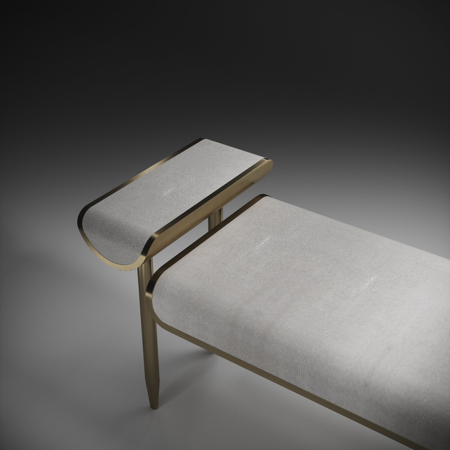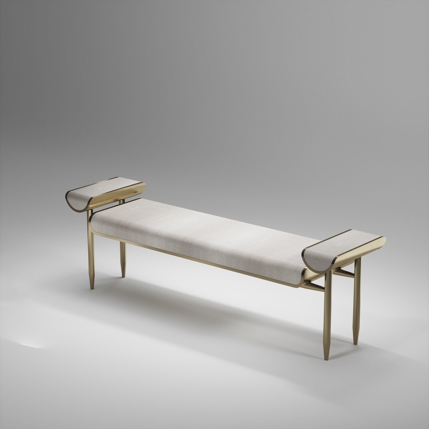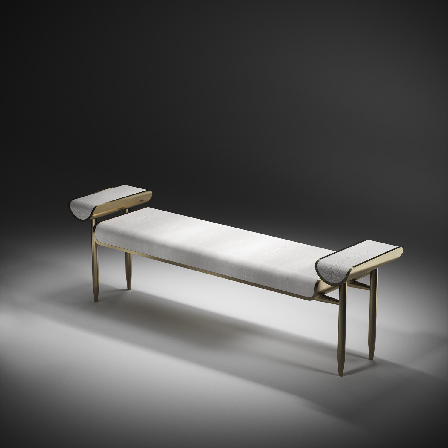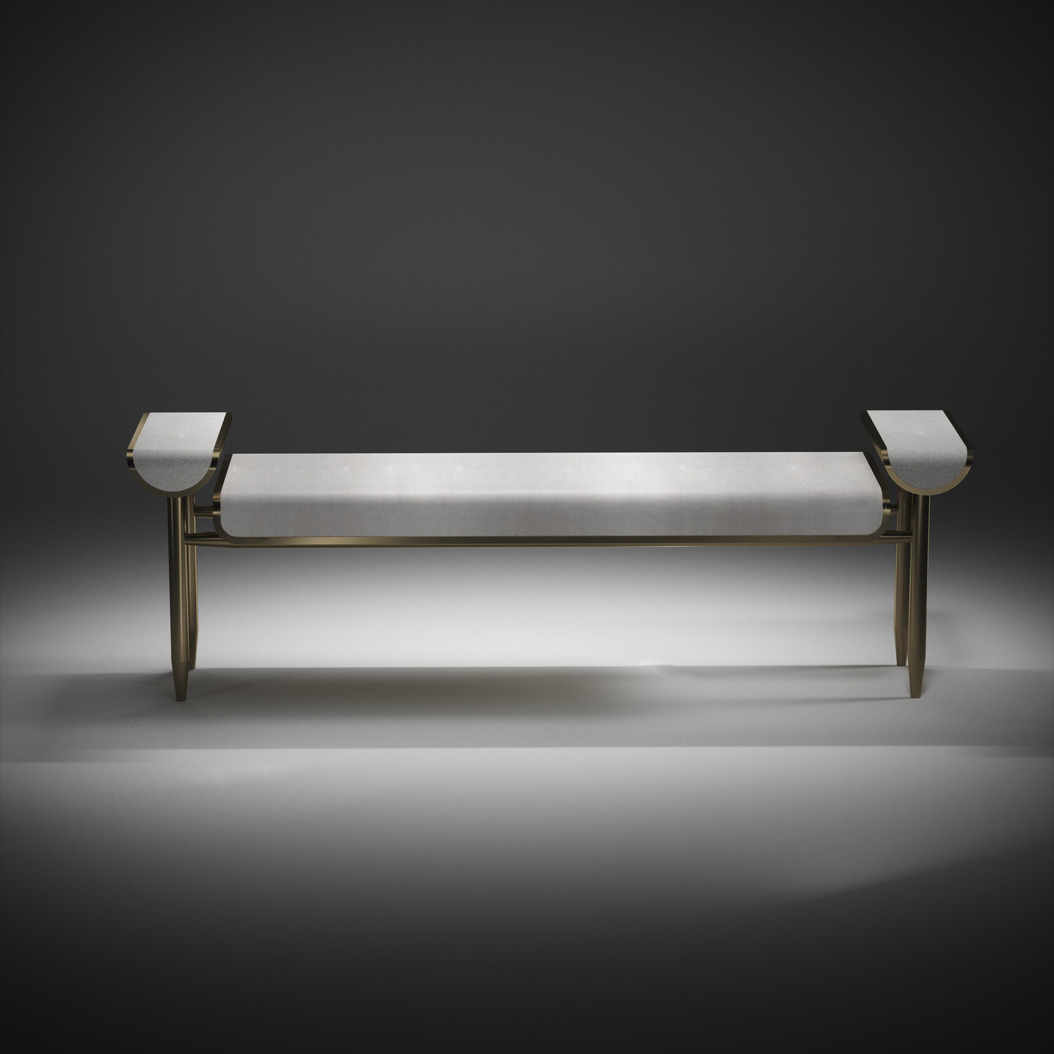 Inspired by the original Dandy bench by KIFU PARIS, the Dandy II Tabletop Bench is the ultimate luxury seating. The seating area is inlaid in cream shagreen and the frame, legs and sides of the bench are completely inlaid in bronze-patina brass. On the left and right side of the bench are flat armrests inlaid in shagreen that act as tabletop parts to rest a drink or small item.