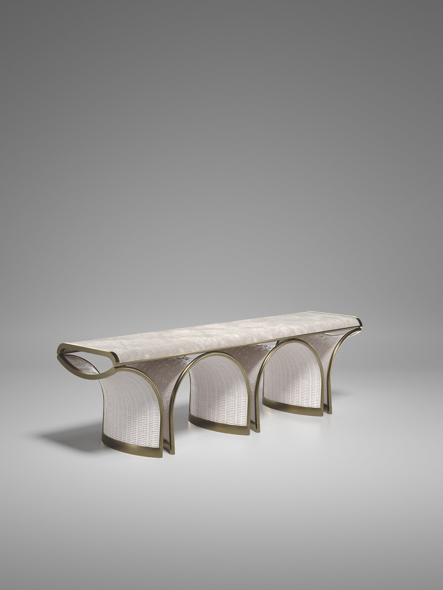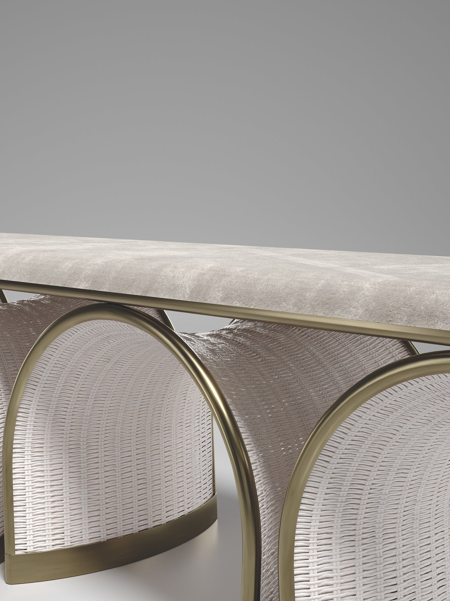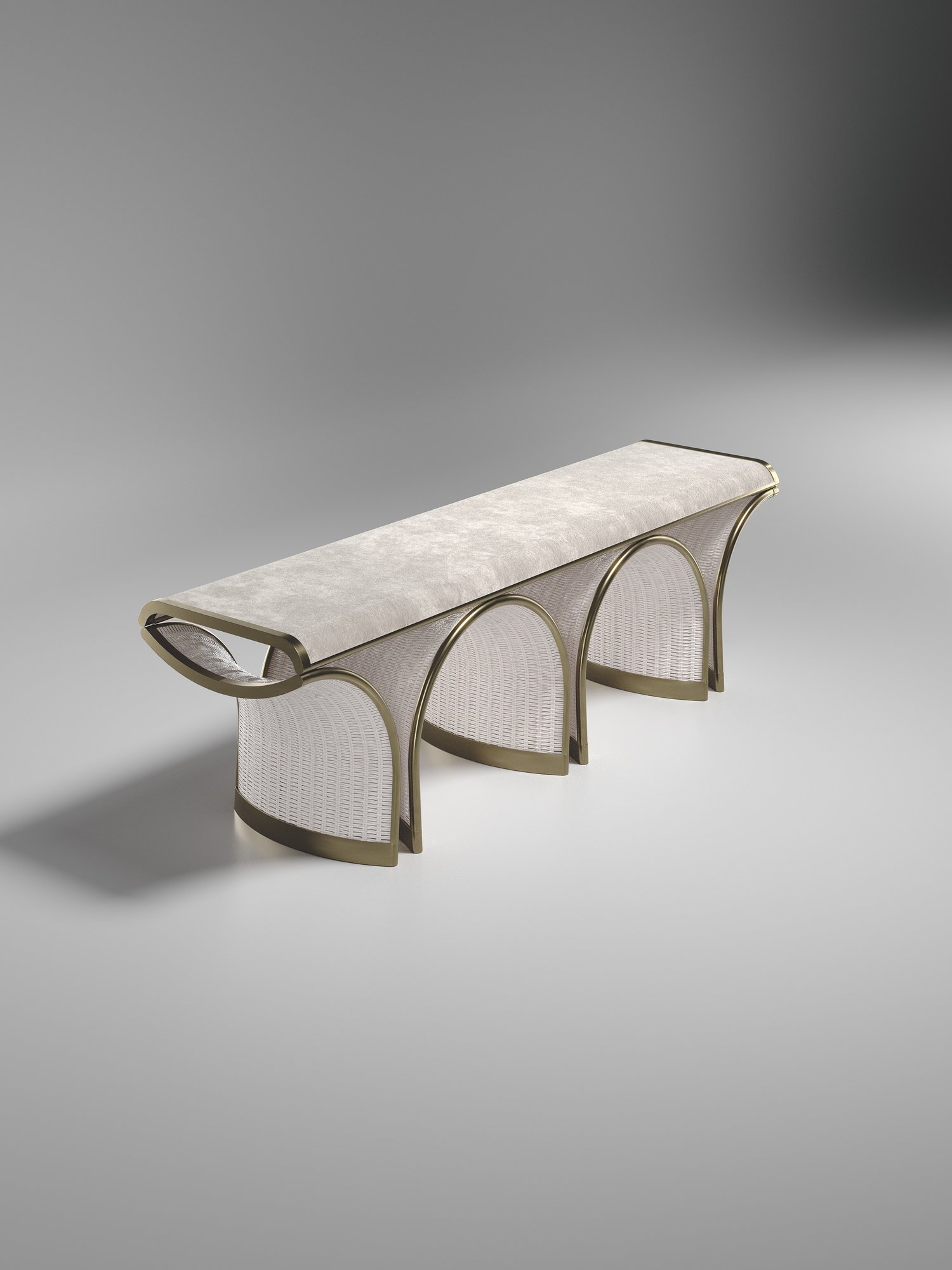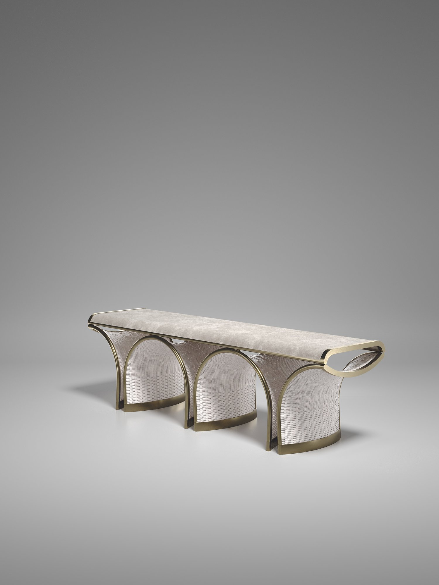 The Nymphea Bench explores the brand's iconic DNA of bringing old world artisanal craft into a contemporary and utterly luxury feel. This seating piece is done either in a rattan finish base, with an inlaid seat or with a bronze patina brass base with an inlaid seat.