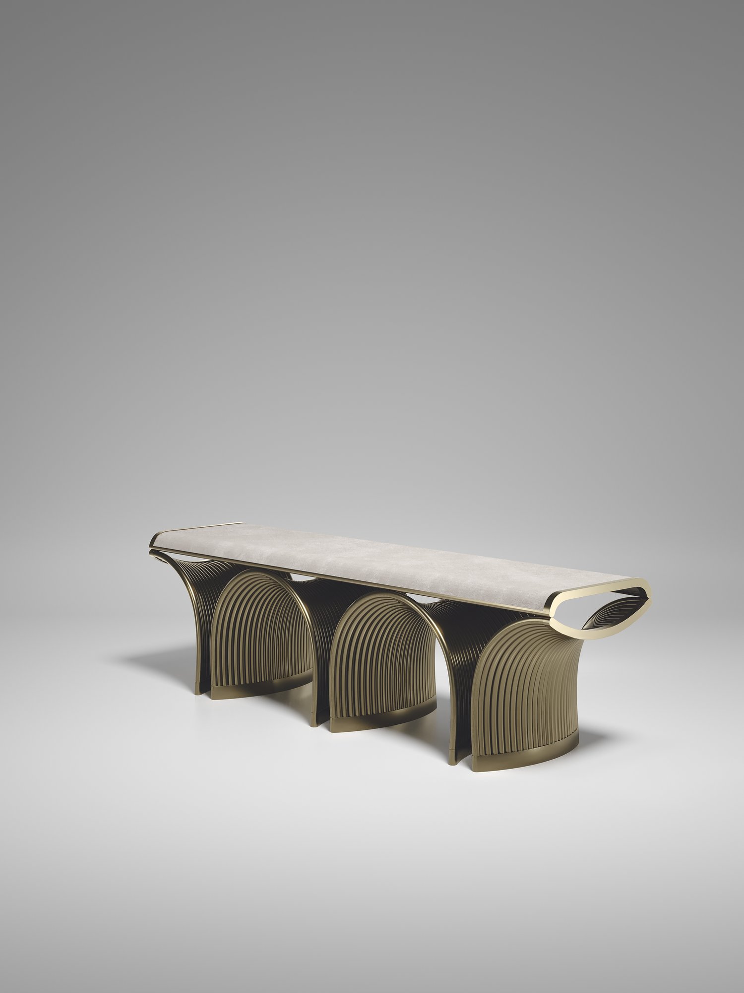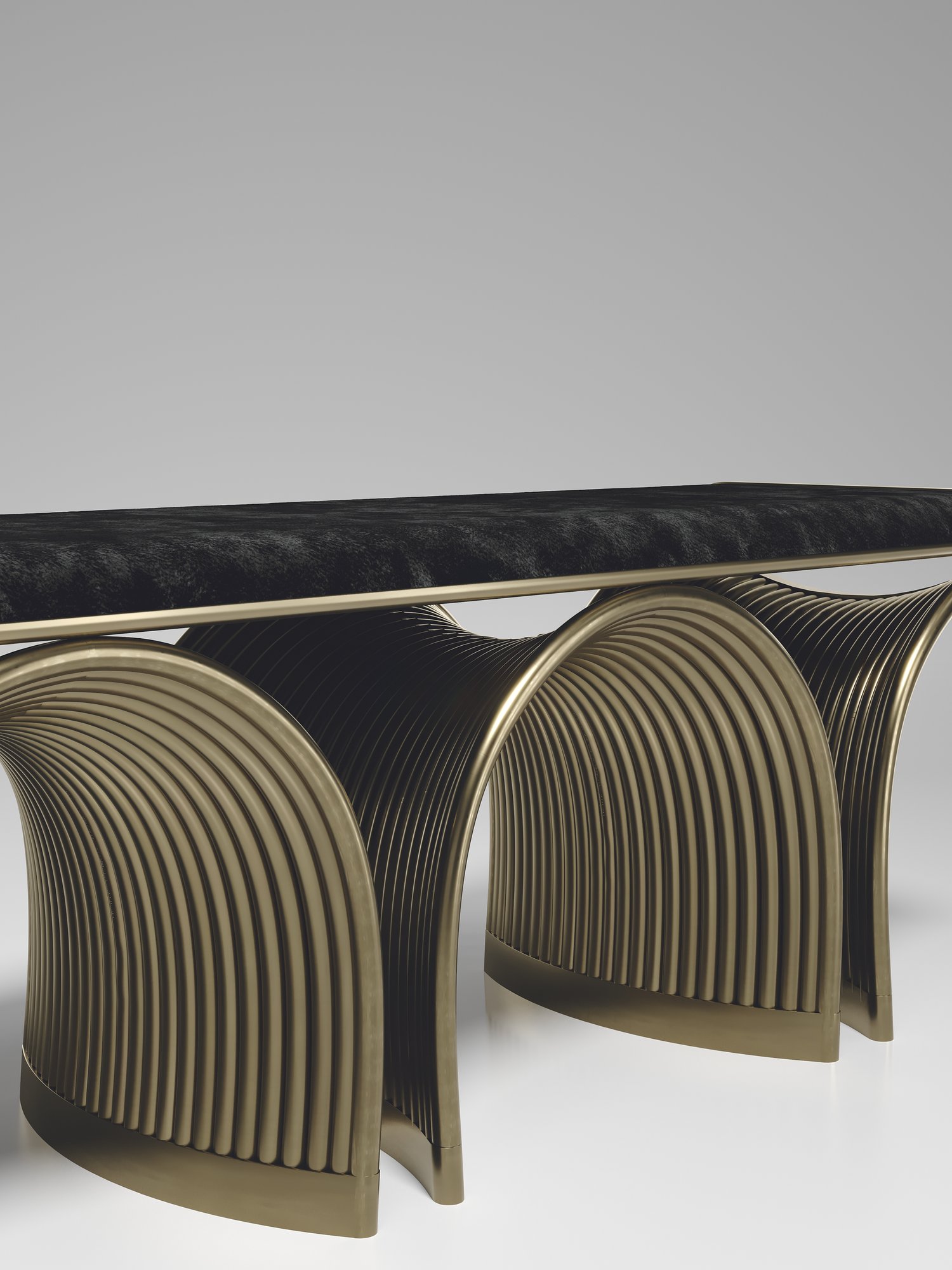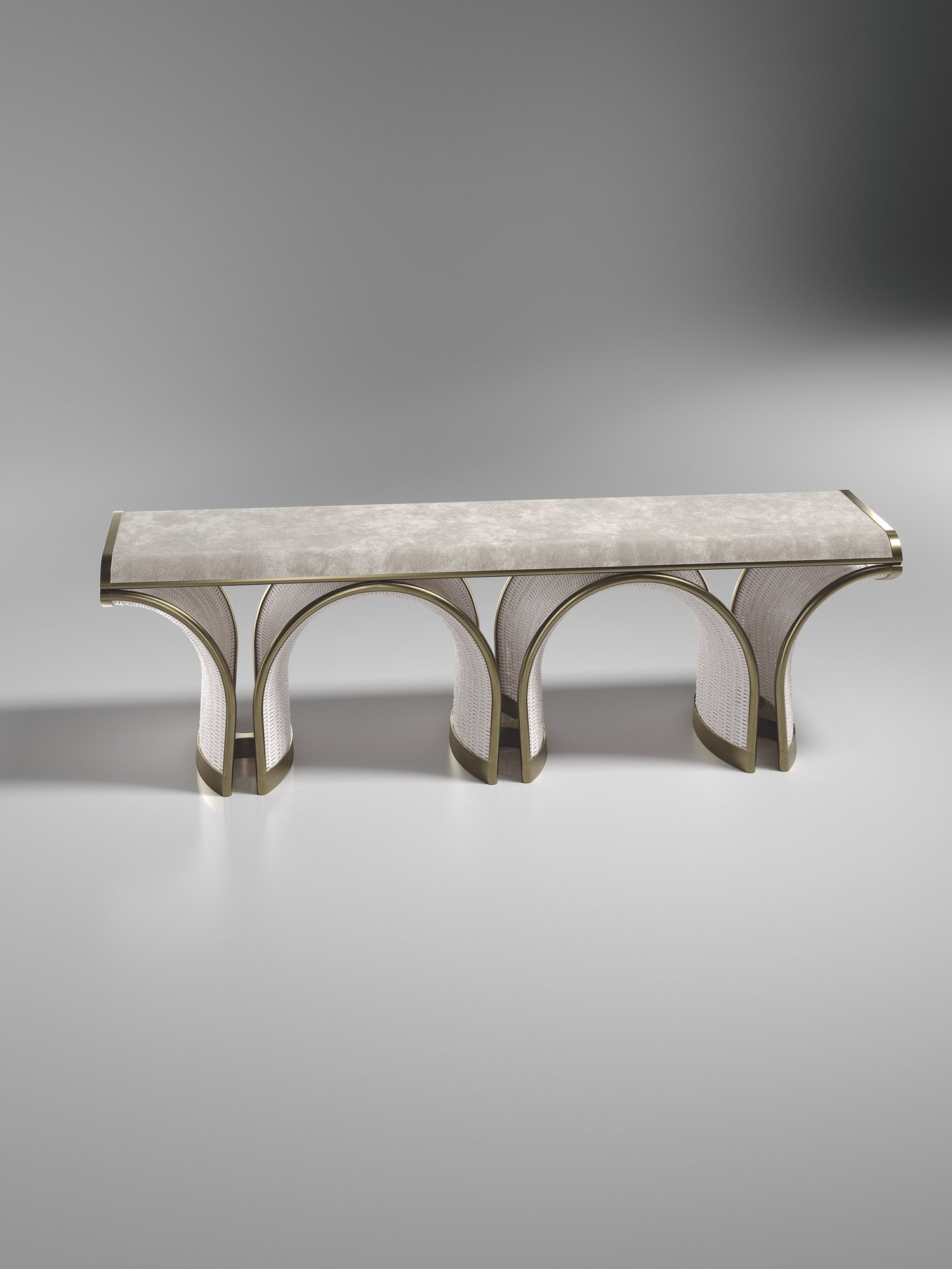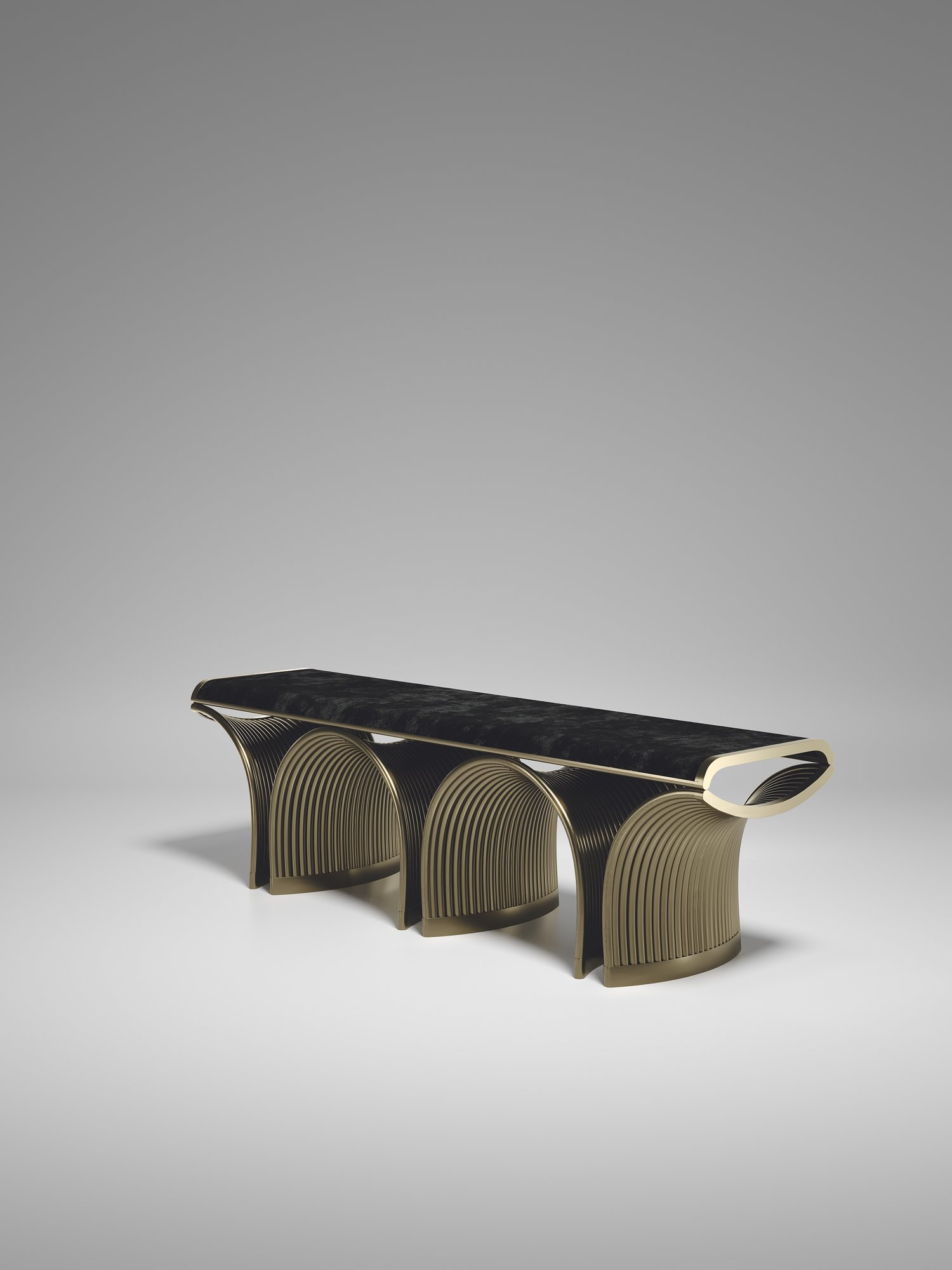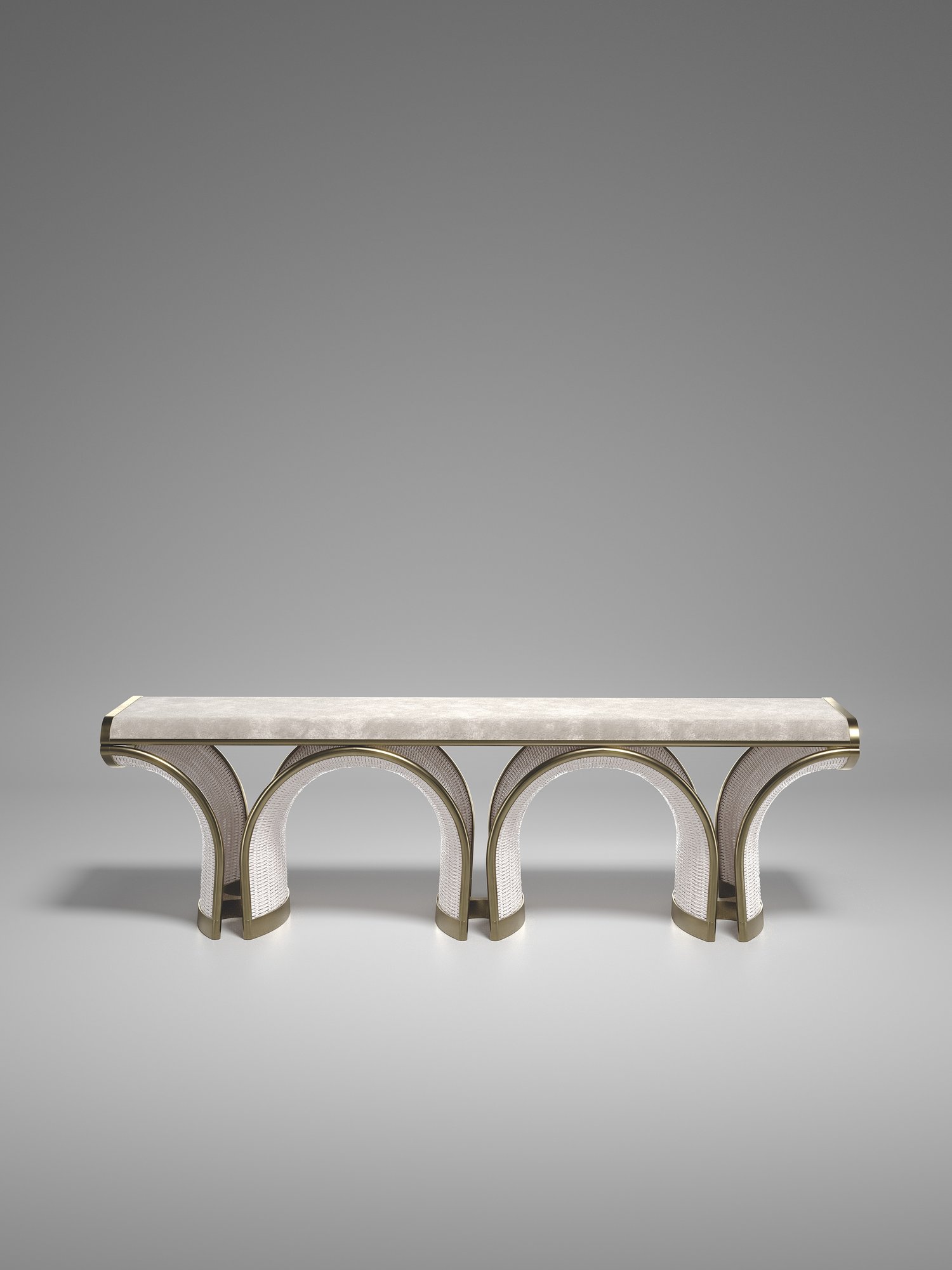 The Nymphea Bench explores the brand's iconic DNA of bringing old world artisanal craft into a contemporary and utterly luxury feel. This seating piece is done either in a rattan finish base, with an inlaid seat or with a bronze patina brass base with an inlaid seat.