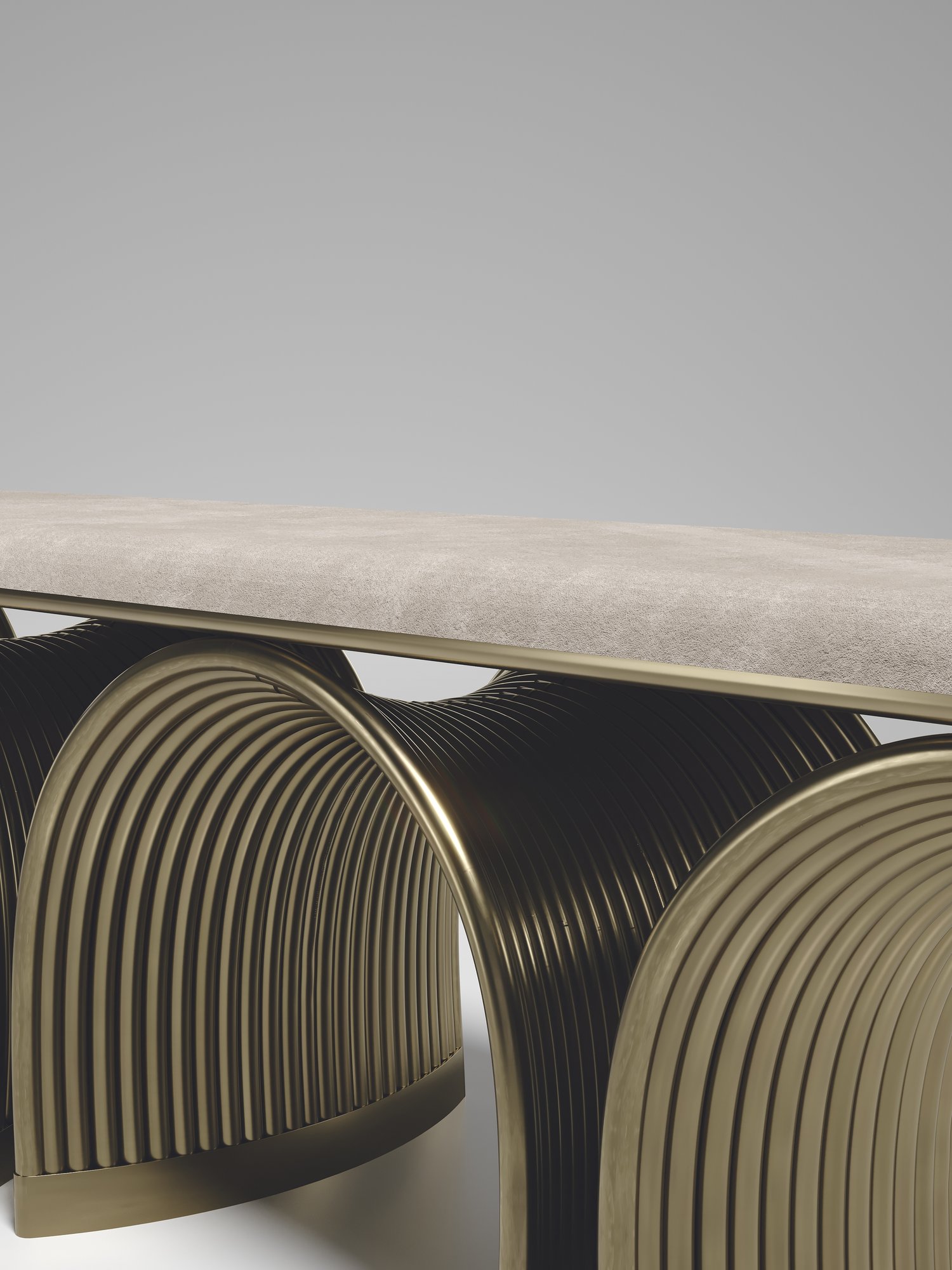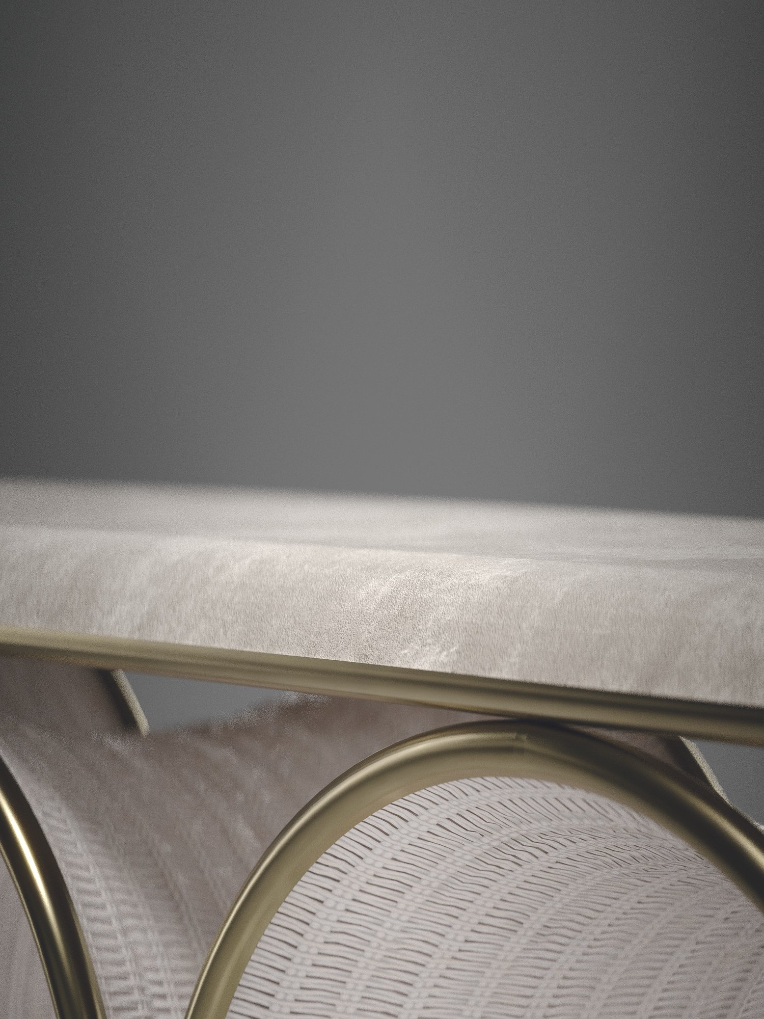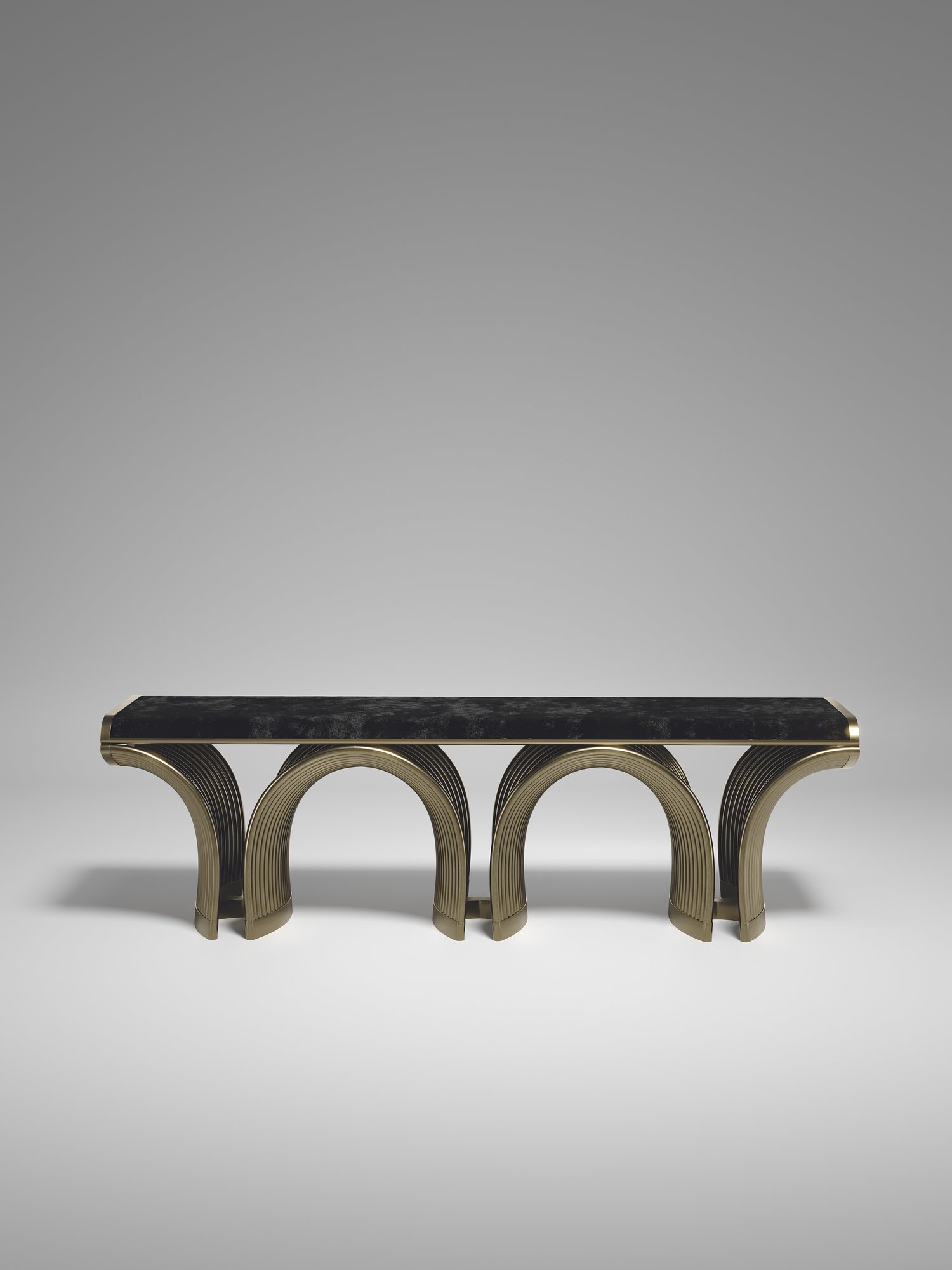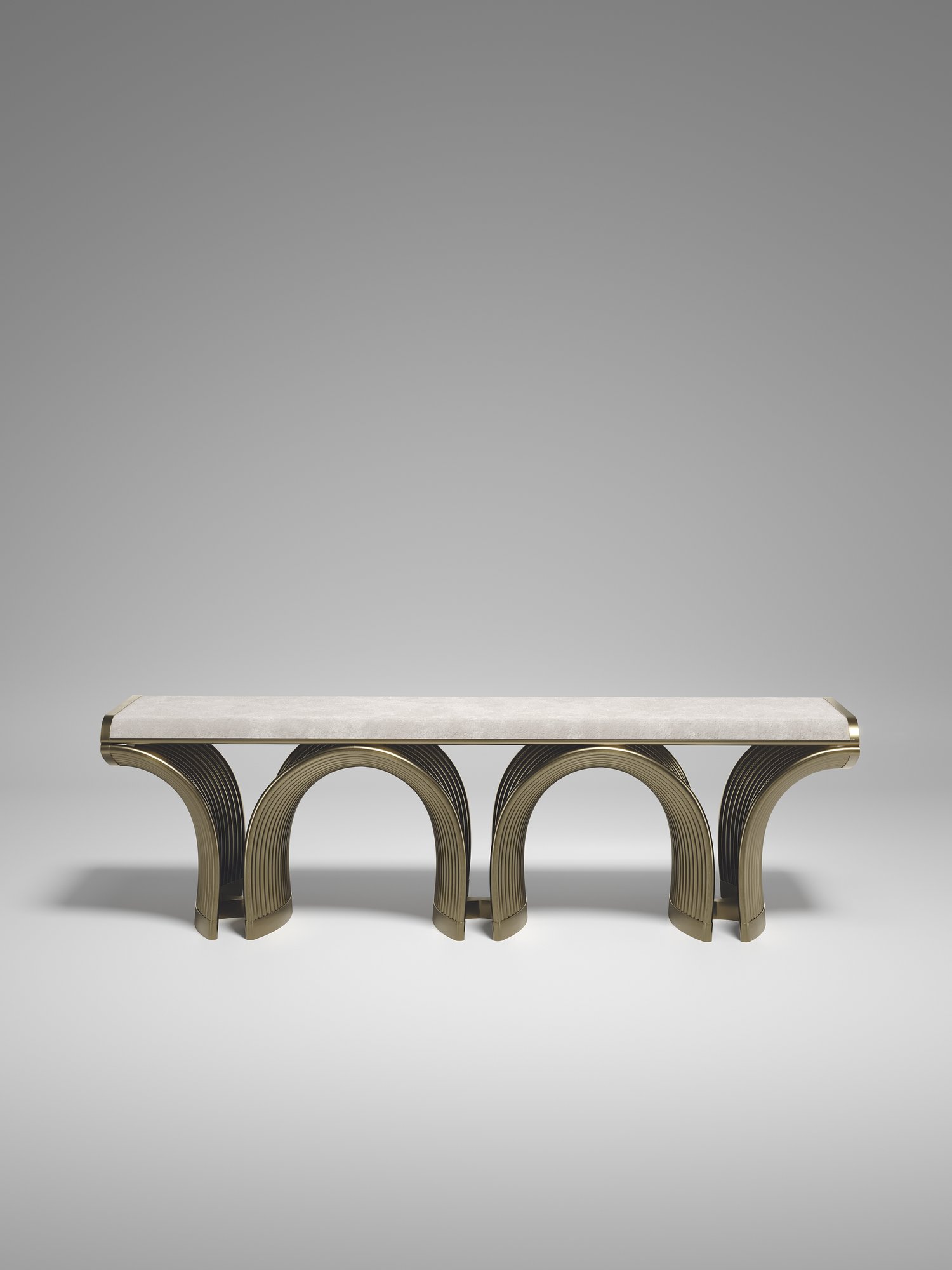 The Nymphea Bench explores the brand's iconic DNA of bringing old world artisanal craft into a contemporary and utterly luxury feel. This seating piece is done either in a rattan finish base, with an inlaid seat or with a bronze patina brass base with an inlaid seat.