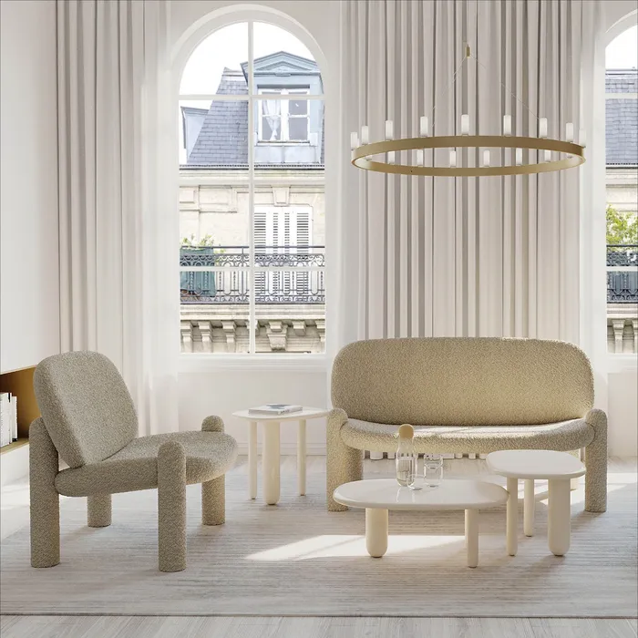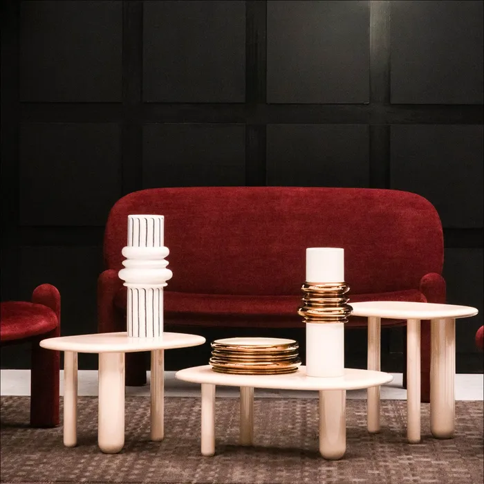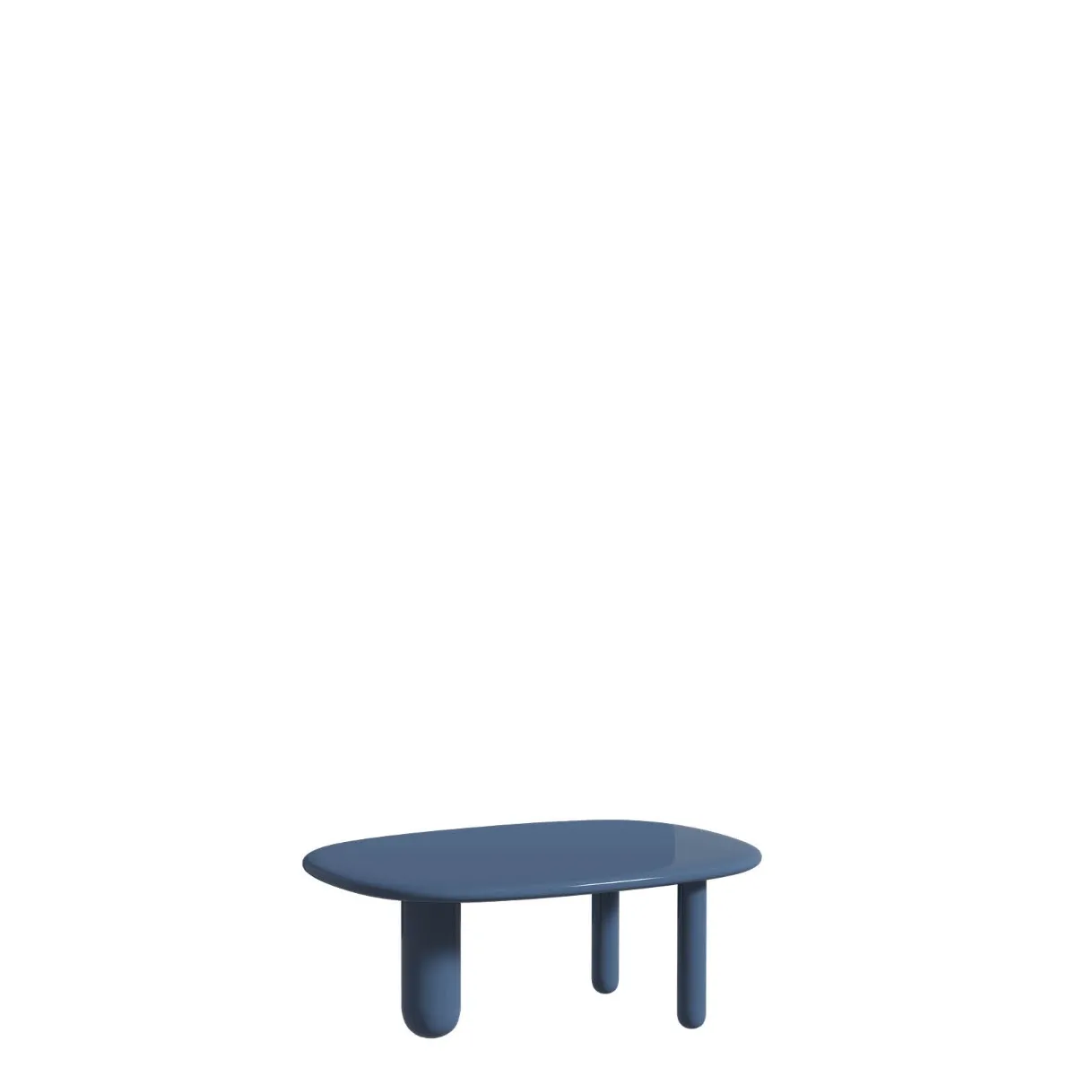 A completare la collezione, una serie di tavolini realizzati in tre differenti dimensioni e contraddistinti da un inusuale appoggio a terra su tre gambe. Anche per i tavolini, gli elementi distintivi sono rappresentati dalla forma morbida ed arrotondata del piano, realizzato in MDF con bordo sagomato, e dal generoso diametro delle gambe in legno massello tornito. La finitura è una laccatura lucida in tre varianti di colore nelle tinte pastello. Uso solo interno.