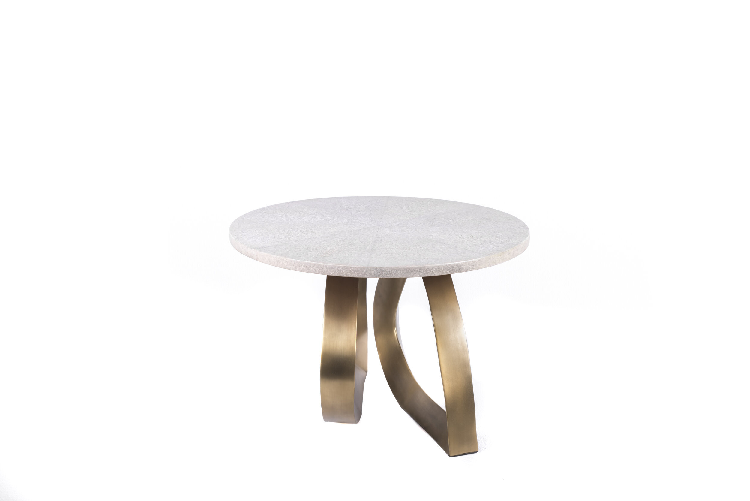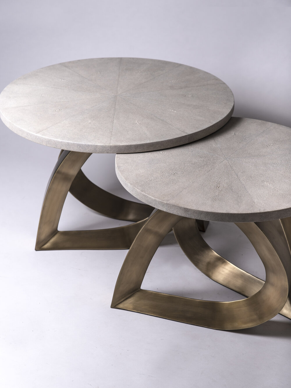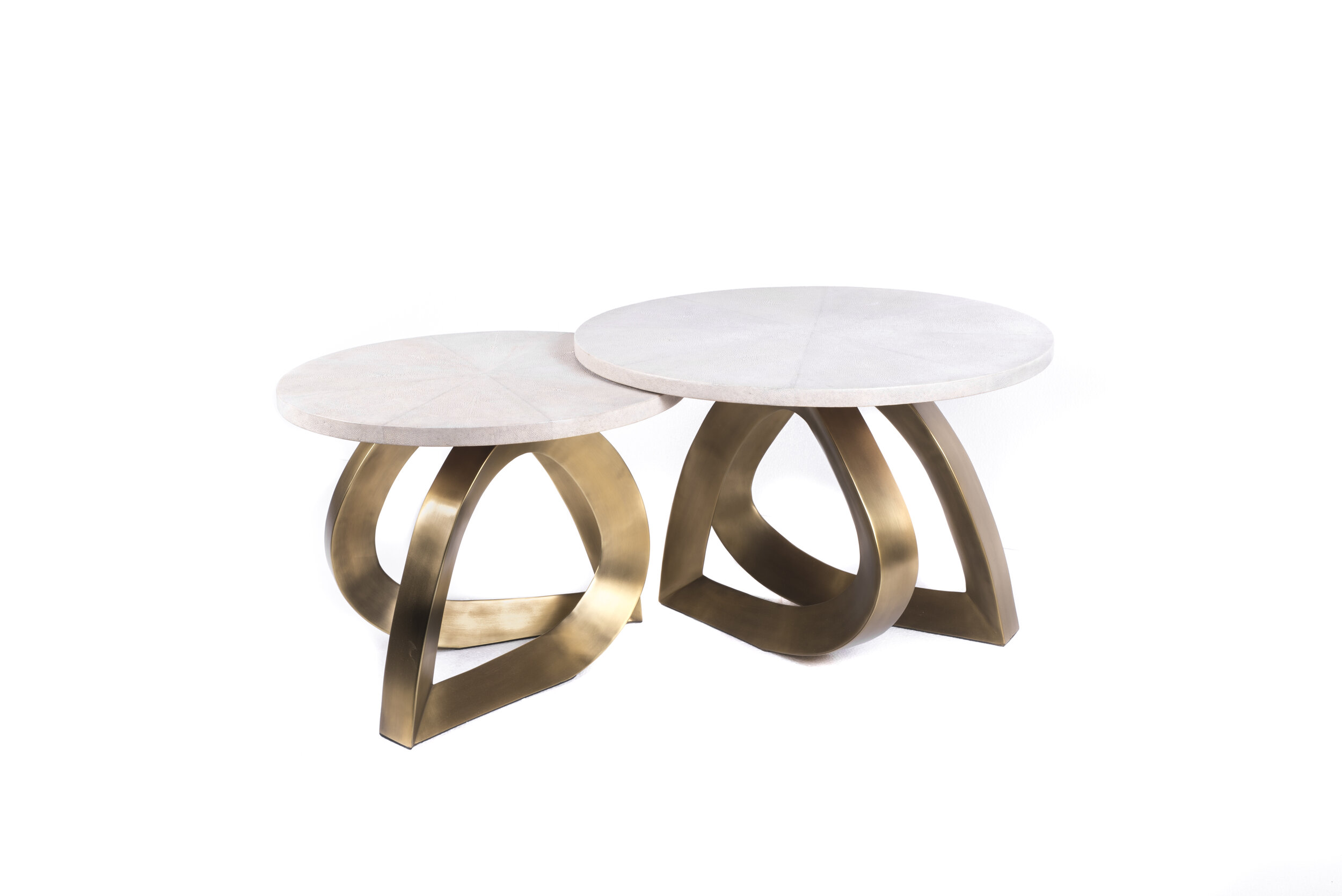 The set of 2 teardrop nesting coffee tables in cream shagreen and bronze-patina is an elegant design with circular top that sits on a sculptural base. The sculptural base is inlaid in bronze-patina brass and the top is in cream shagreen. These coffee tables are the perfect accent for any living room. This piece is designed by the daughter of Ria and Yiouri Augousti.