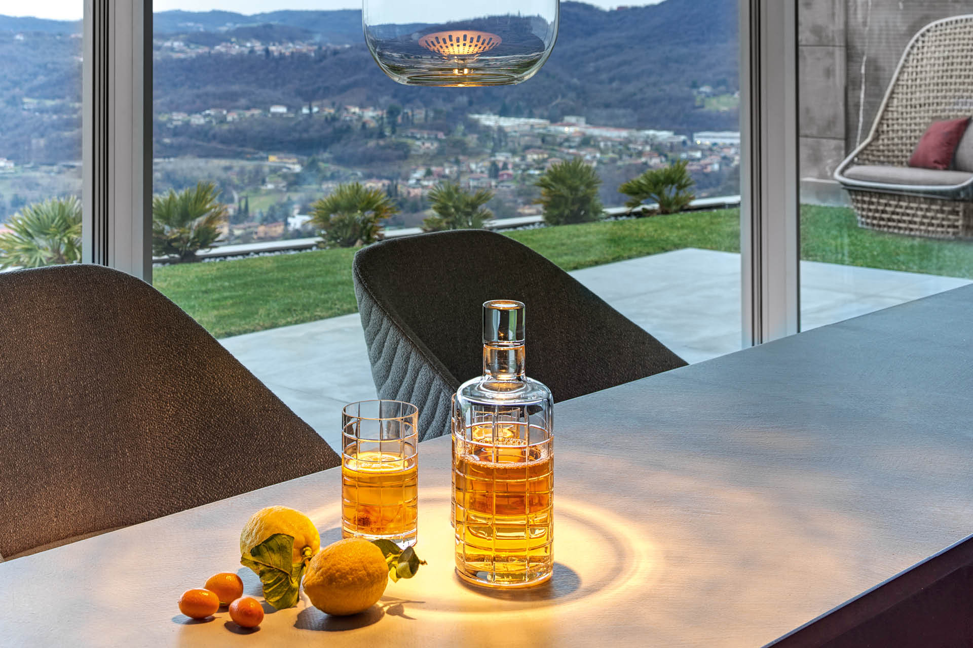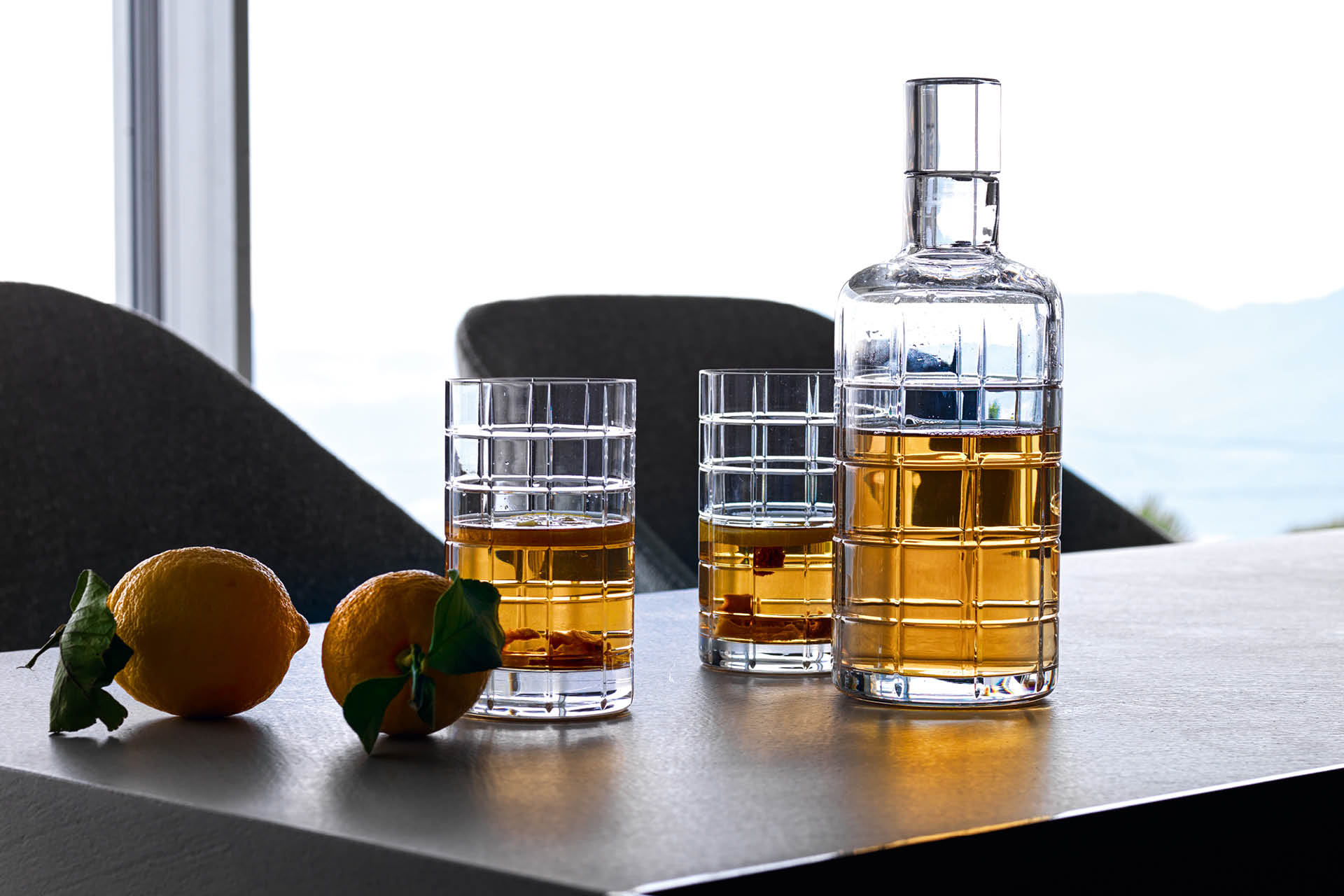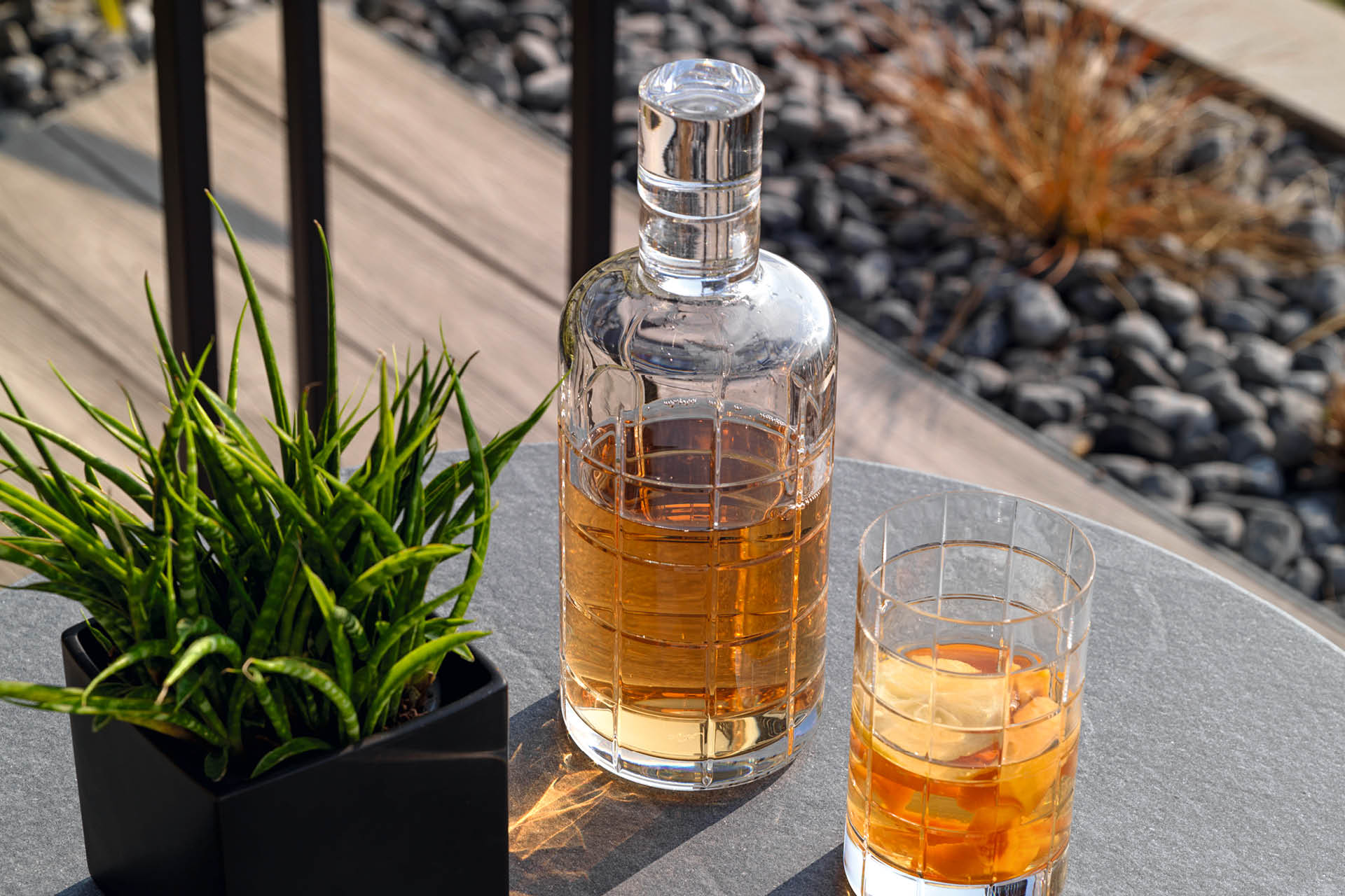 Cylindrical decanter bottle for whiskey in transparent "Florentine" crystal glass with special hand engraving.