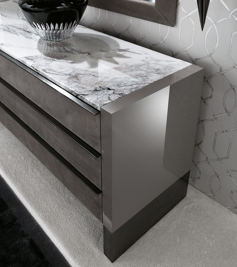 Dresser in high gloss polyester grey lacquer with marble top. 3 full extension double drawers with fronts in natural protected nubuk leather, bottom part in velvet fabric. Base, legs and handles in black nickel steel.