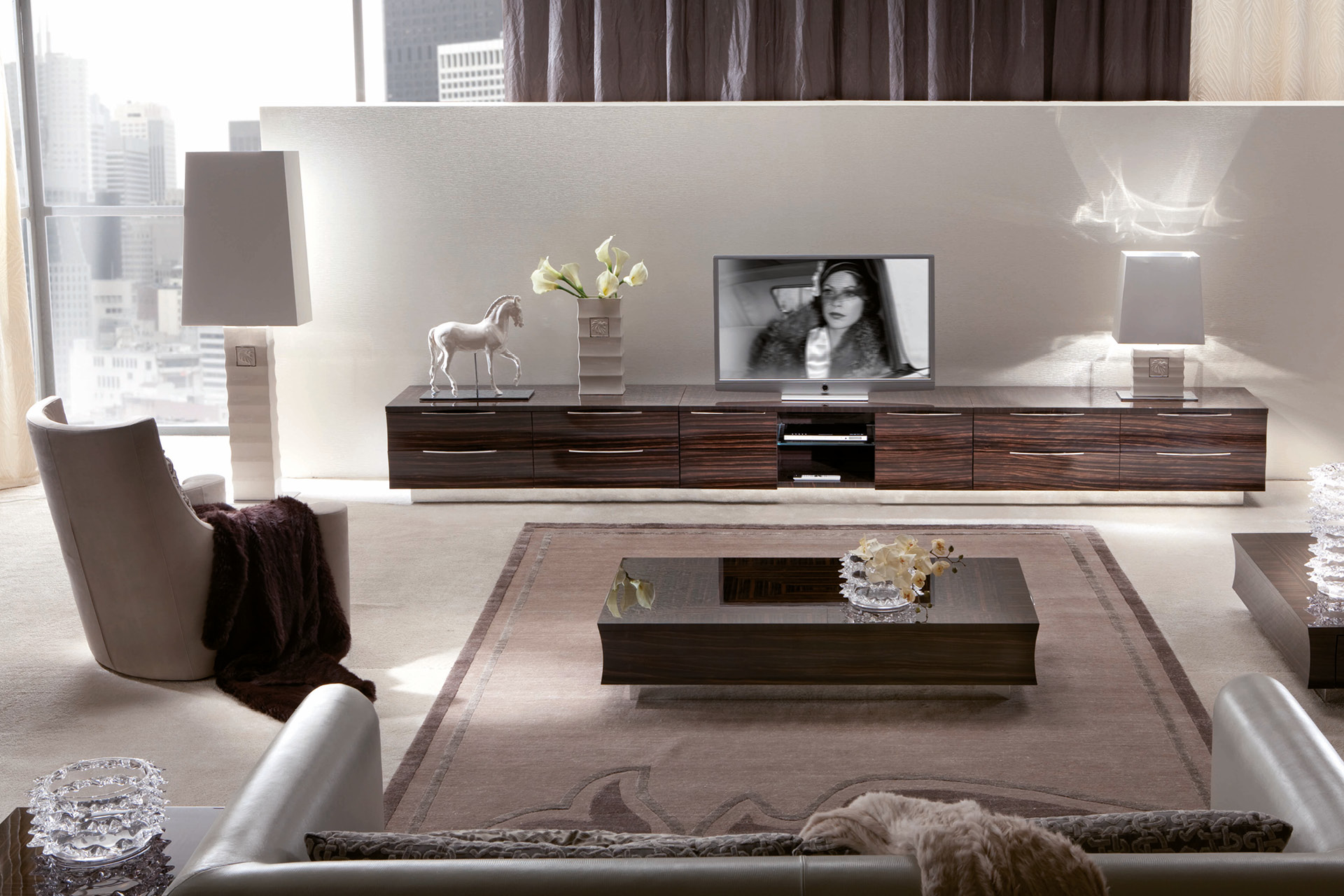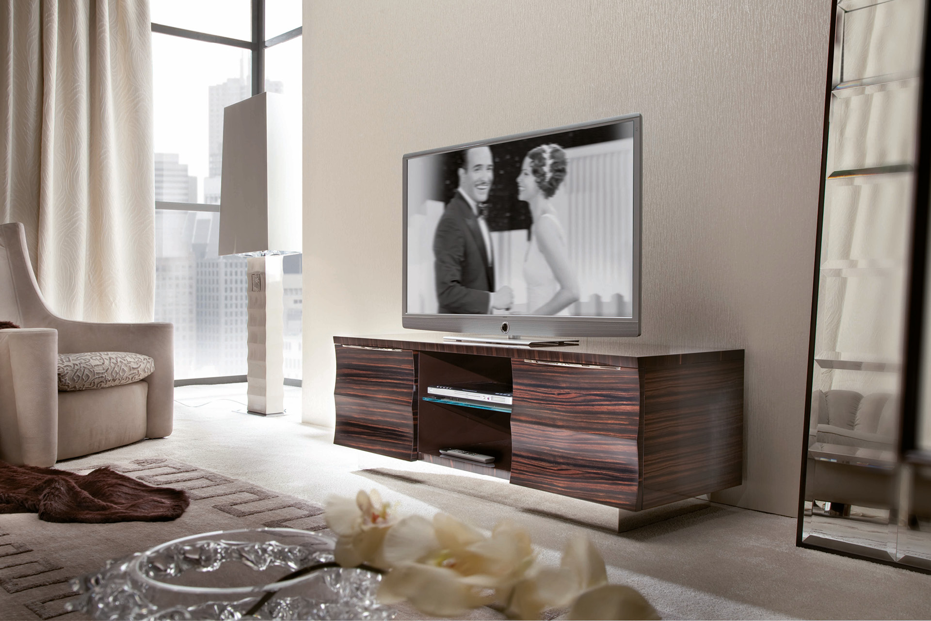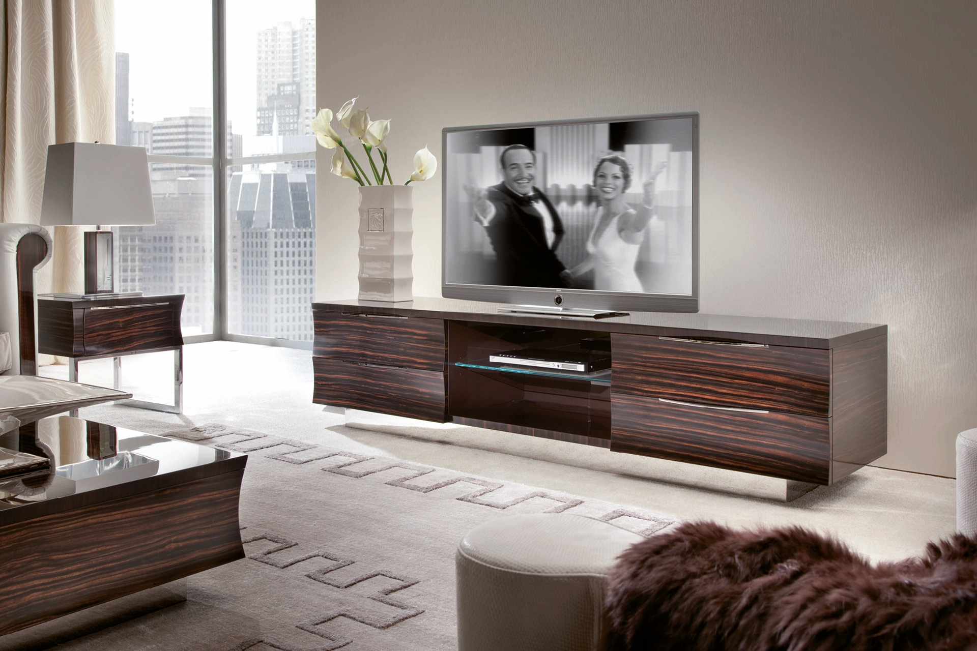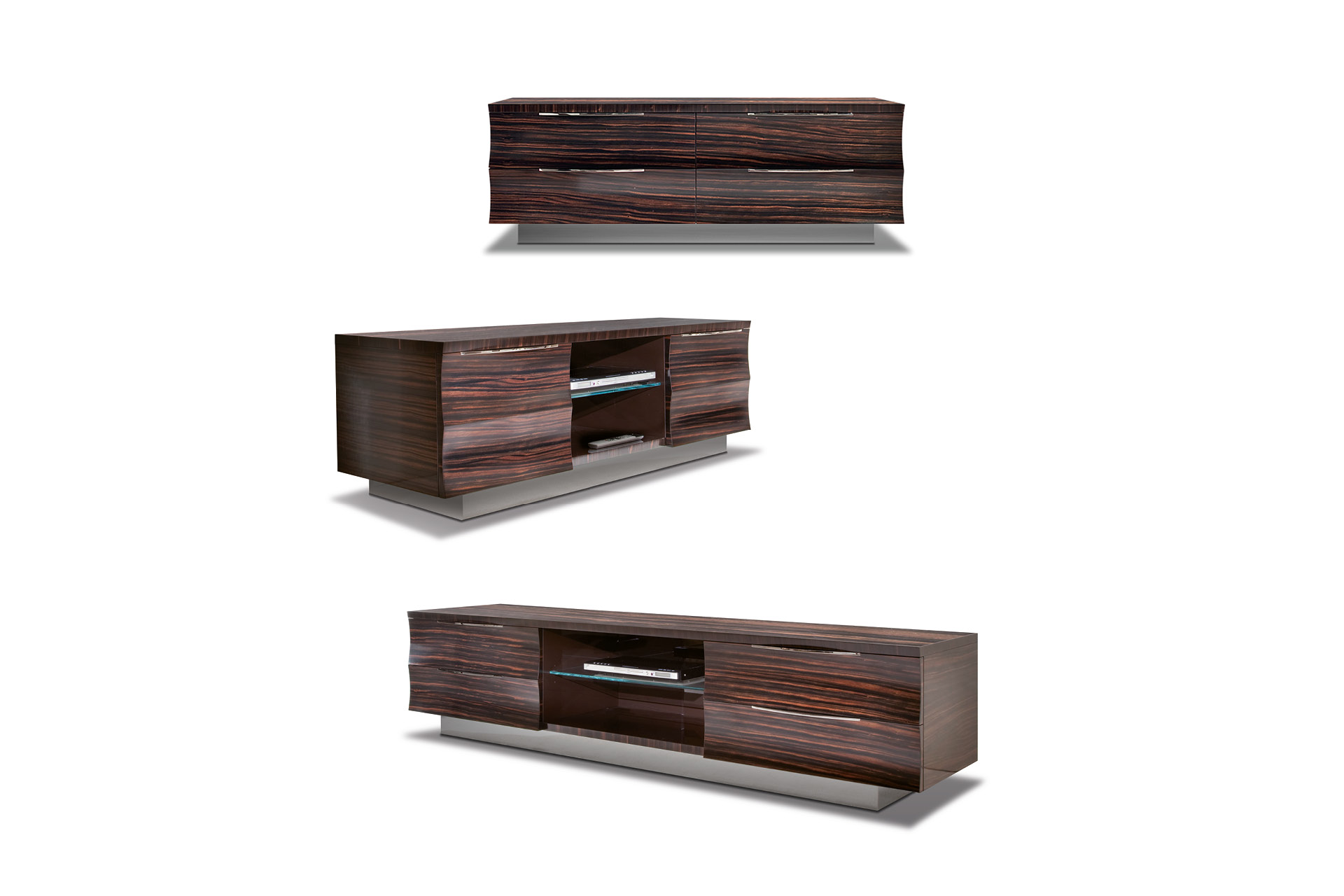 Base for plasma T.V. unit ebony veneer in satin finish. 4 full extension drawers with bottom in velvet fabric and 1 center opened space w/glass shelf with led light. inlay's top in ebony veneer. Chrome stainless steel base and handles.