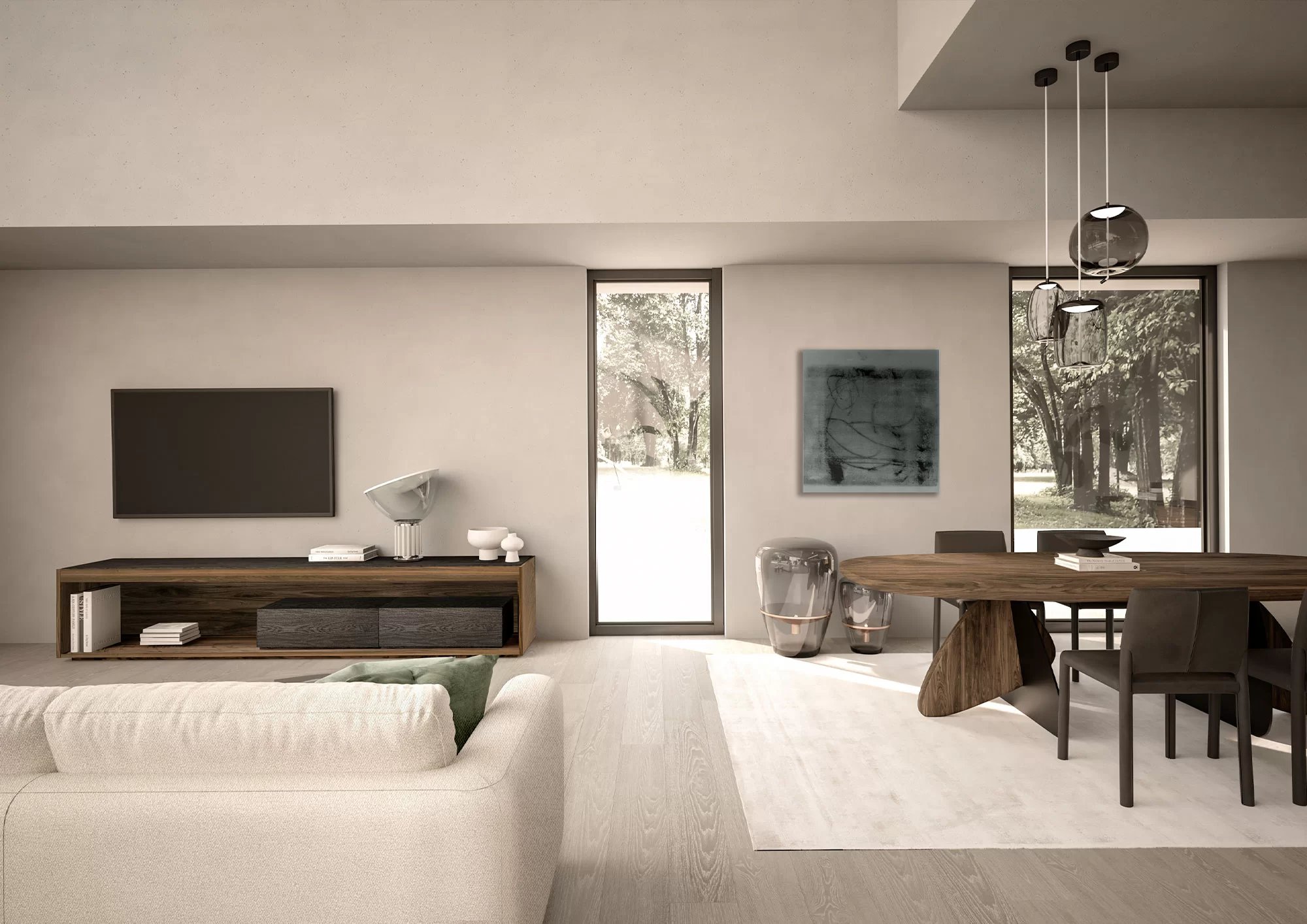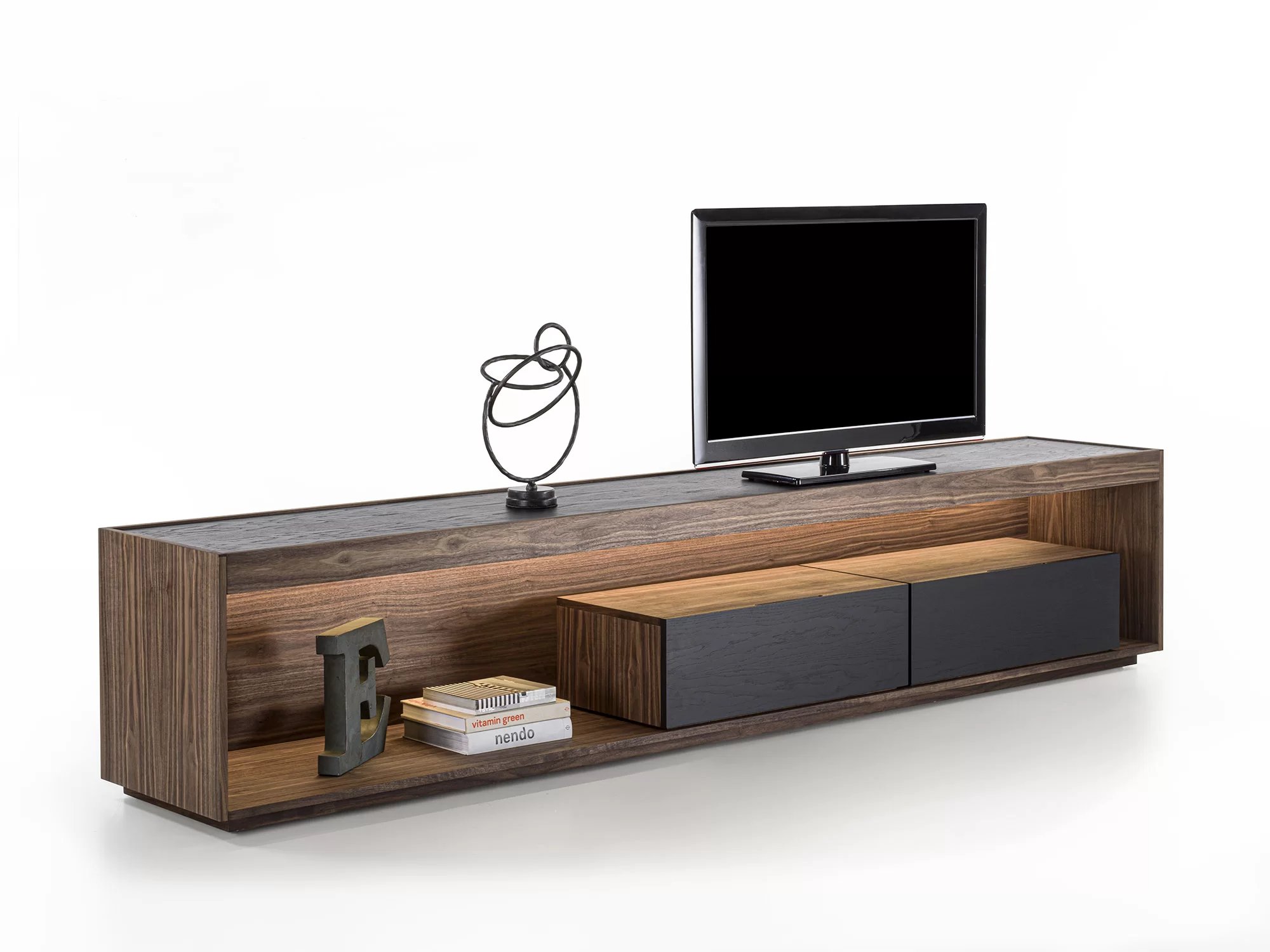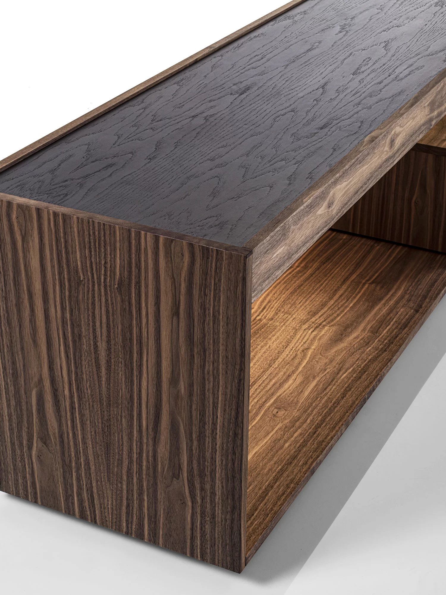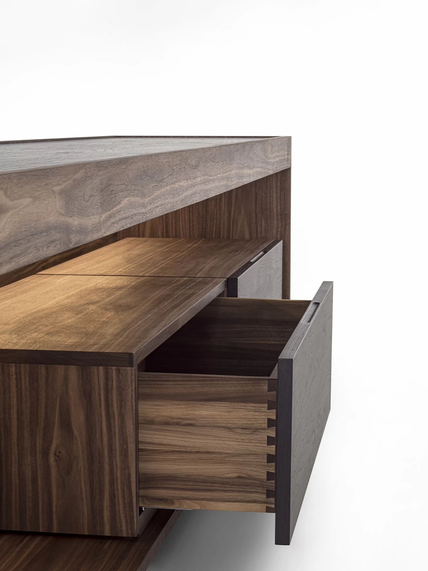 Madia in legno massello e listellare, a giorno, con cornice in legno e due cassetti assemblati con tradizionale incastro a coda di rondine. Top incassato, luci a LED a illuminare il vano a giorno.