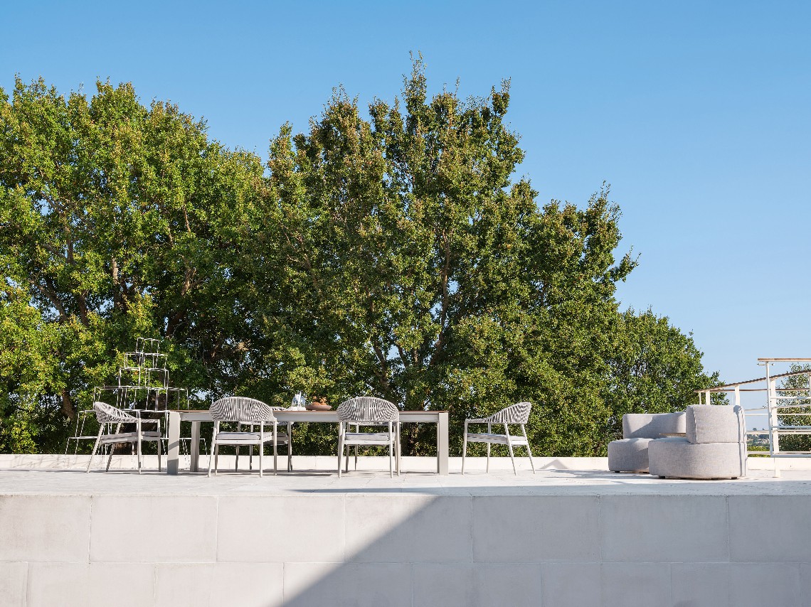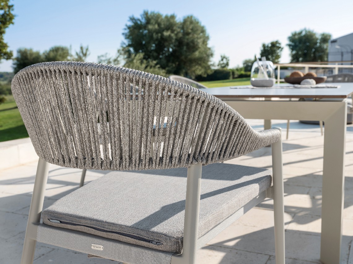 Clever lounge is perfect for enjoying an aperitif or an outdoor lunch. A spacious cushion in water-resistant acrylic fabric can be added to its spacious seat.