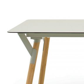The iconic element is the connecting bracket between the leg and the top, a structural element that gives solidity, unmistakably connoting the aesthetics of the table.