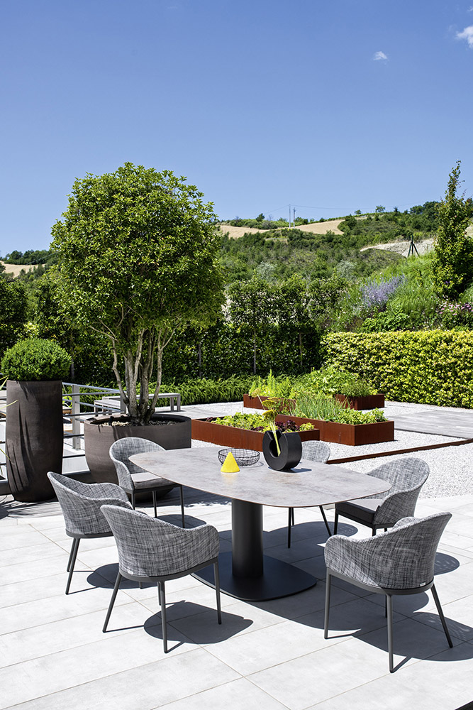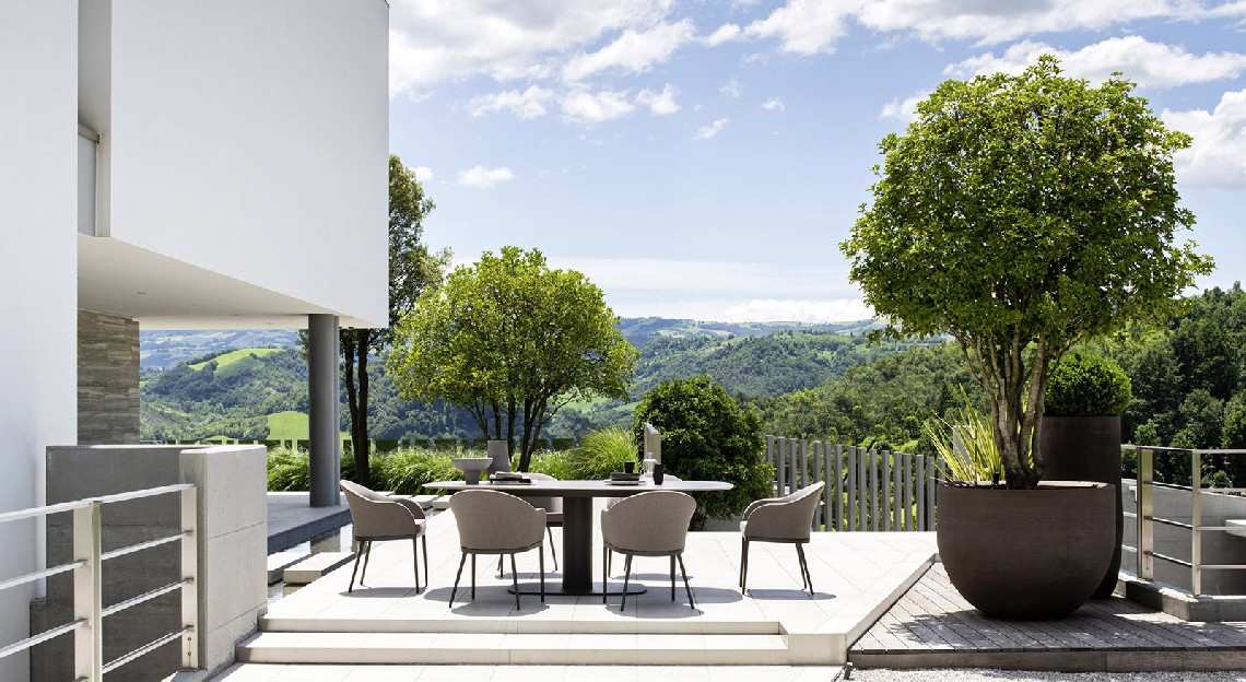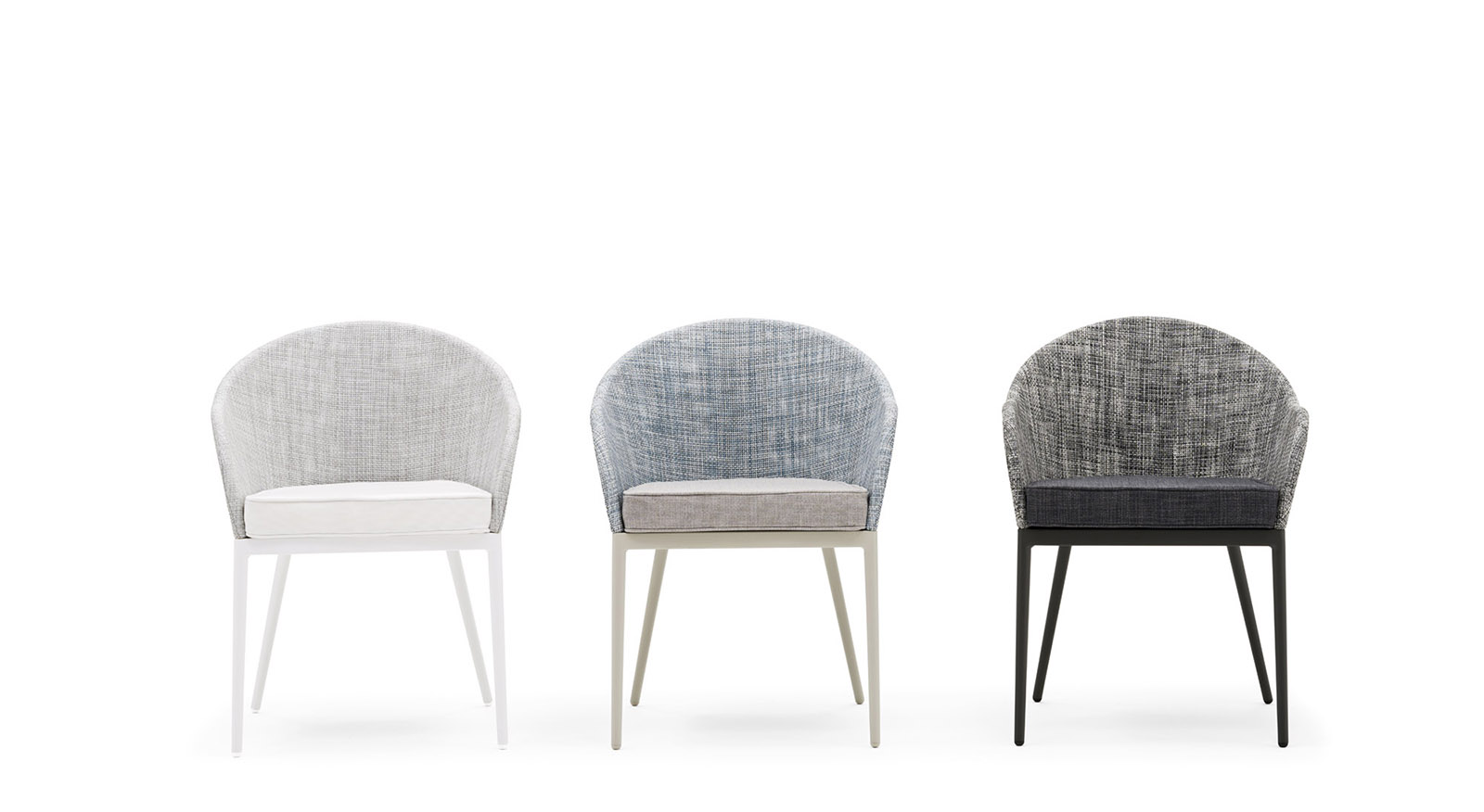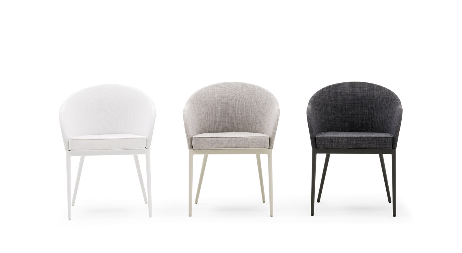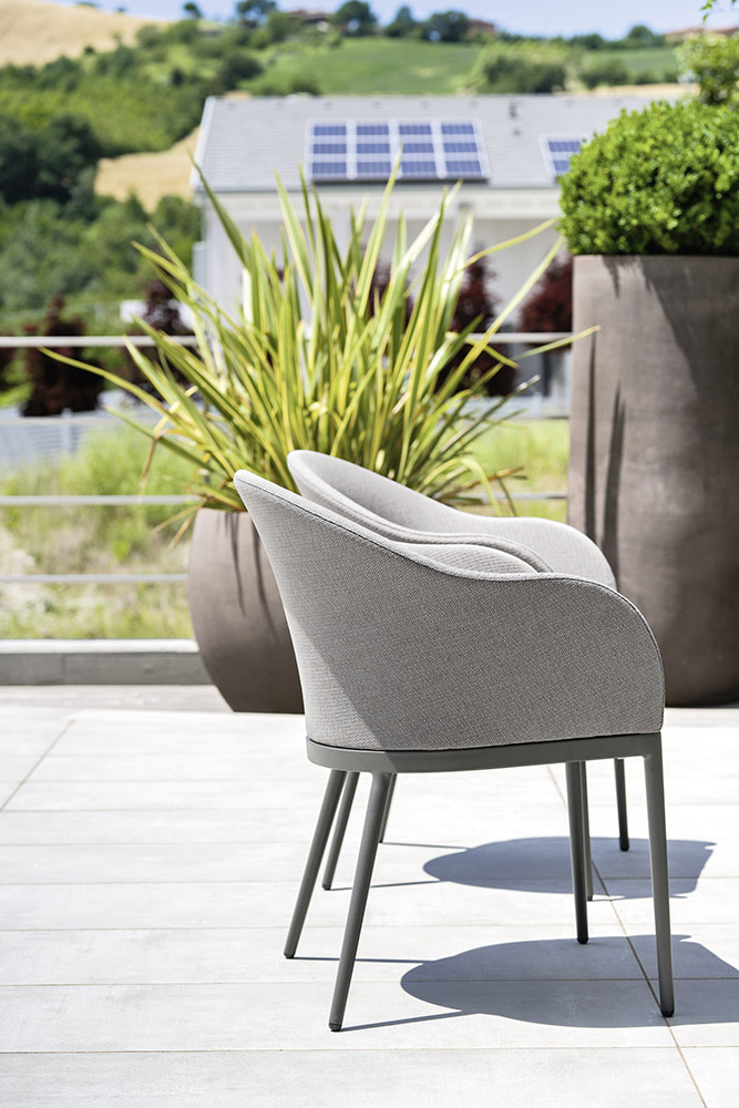 Soft curves outline the backrest and armrests of the Clever bucket chair. Light and elegant, this seat is the ideal choice for decorating the outdoor area or the veranda of a restaurant, or the outdoor dining area of a private residence. The shell upholstery in VAR#TEX has been created specifically for outdoor use and ensures excellent resistance of the Clever bucket chair in all weather conditions.