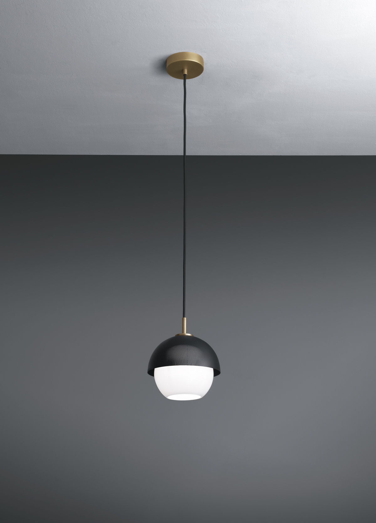 Suspended lamp with diffused light. Light or dark burnished brass structure with matte gold or matte black perforated metal lampshade. White Murano blown glass diffuser.