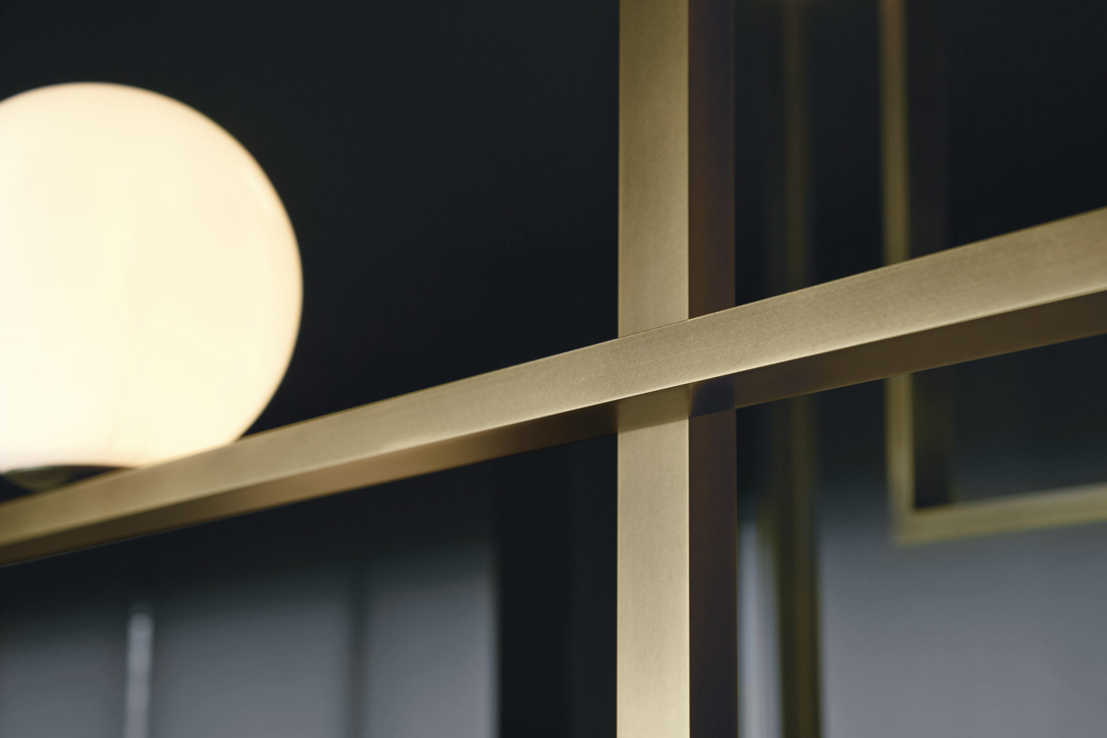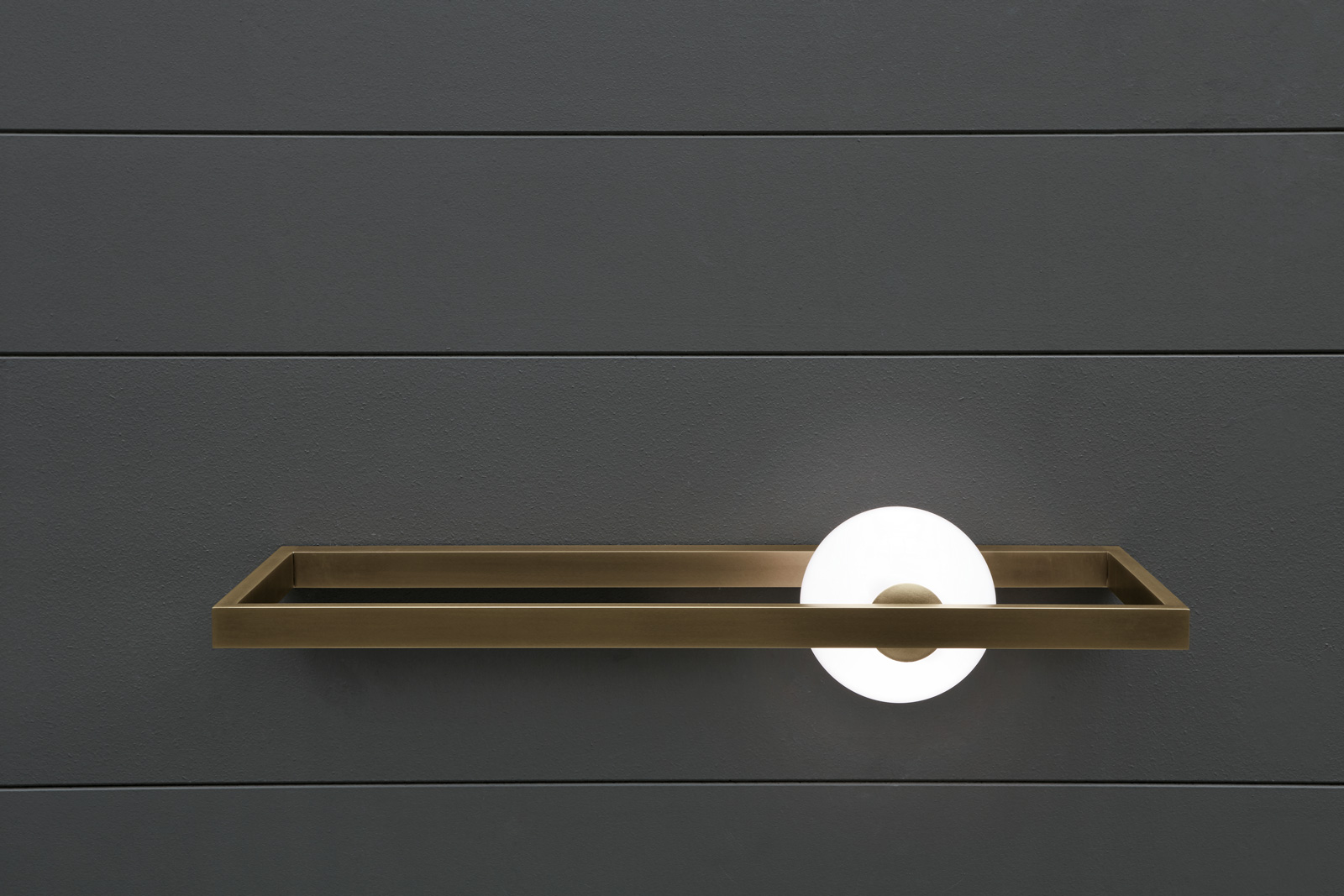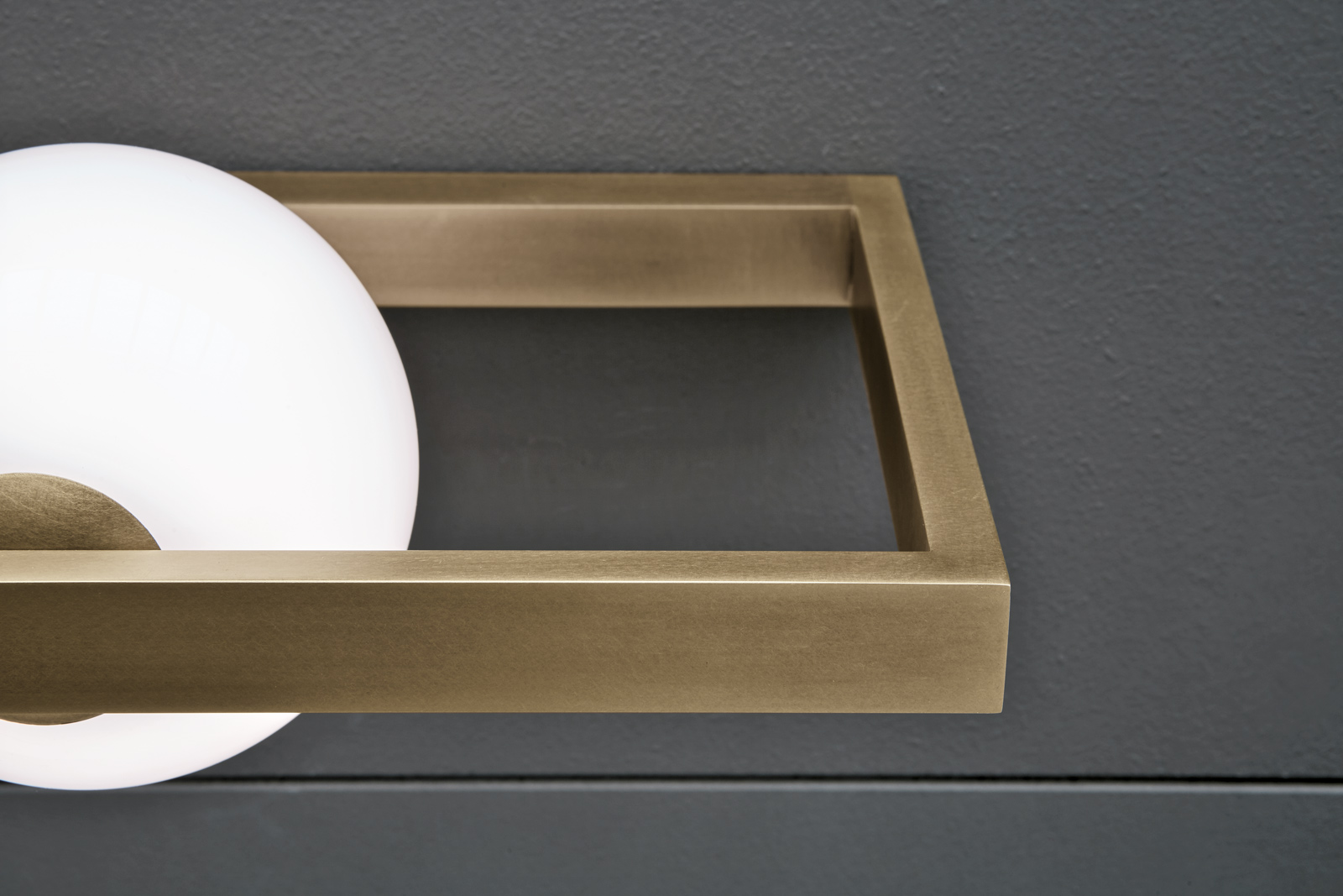 Wall lamp with diffused light. Burnished natural brass, matte black nickel, polished black nickel or polished gold structure and white Murano blown glass diffusers.