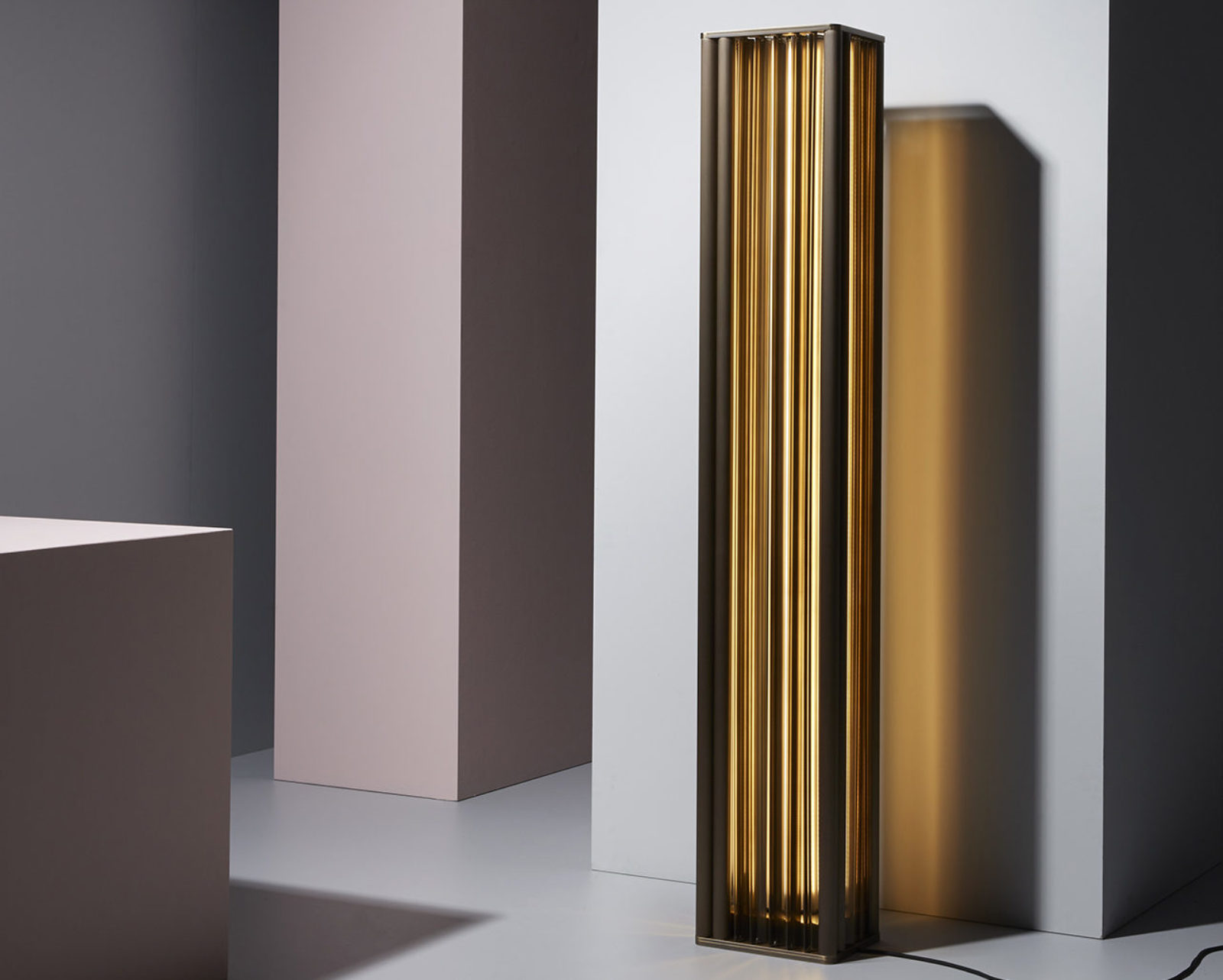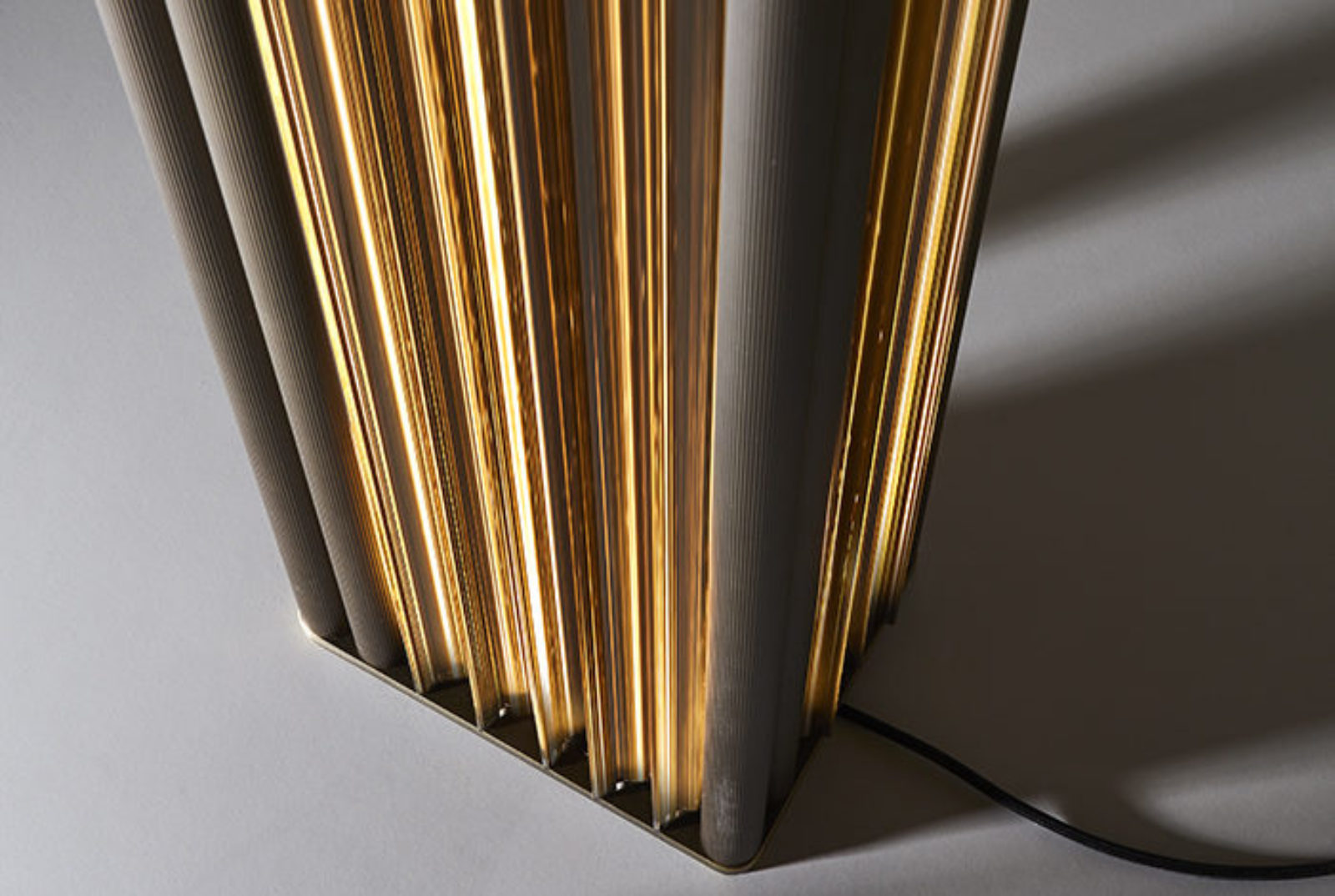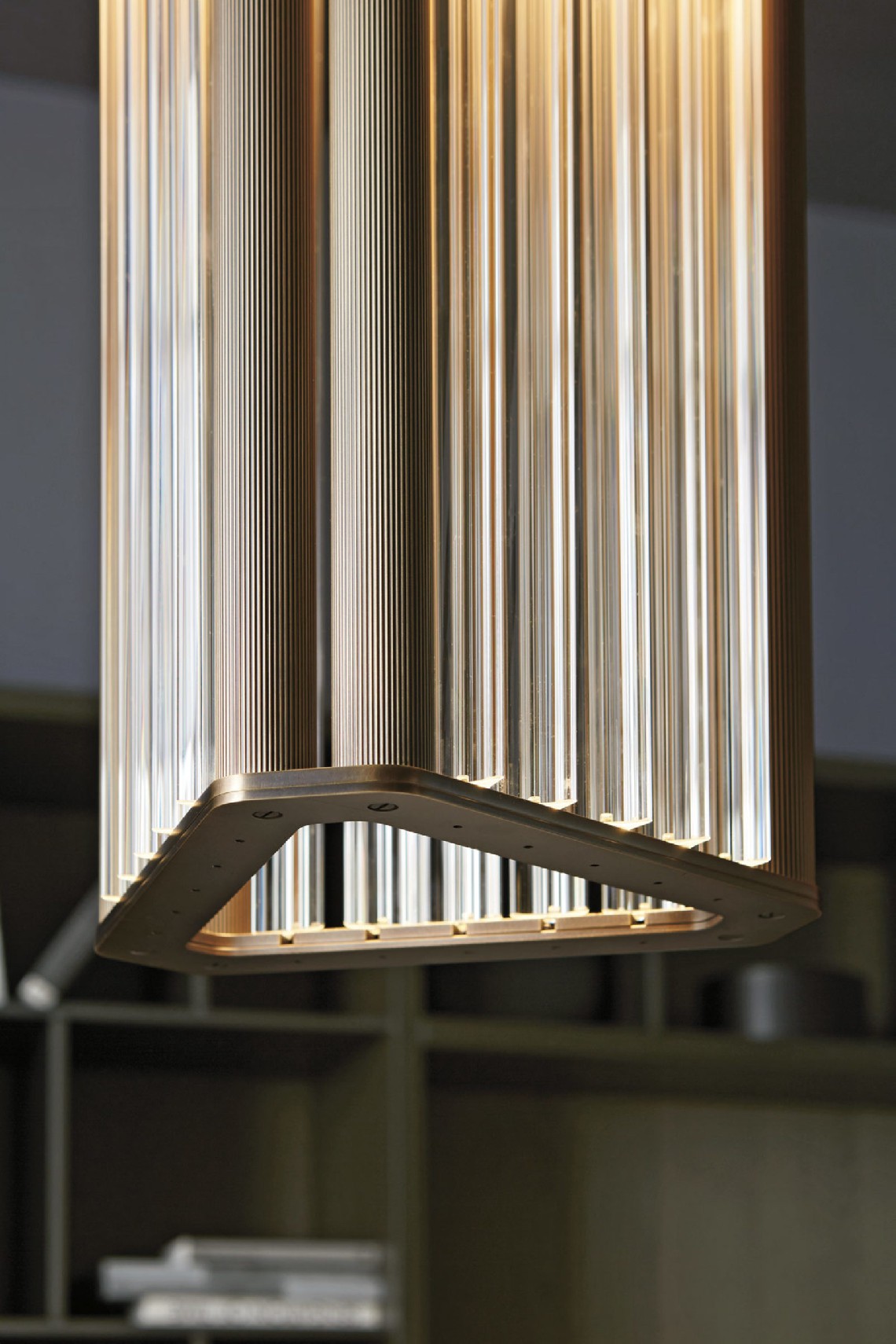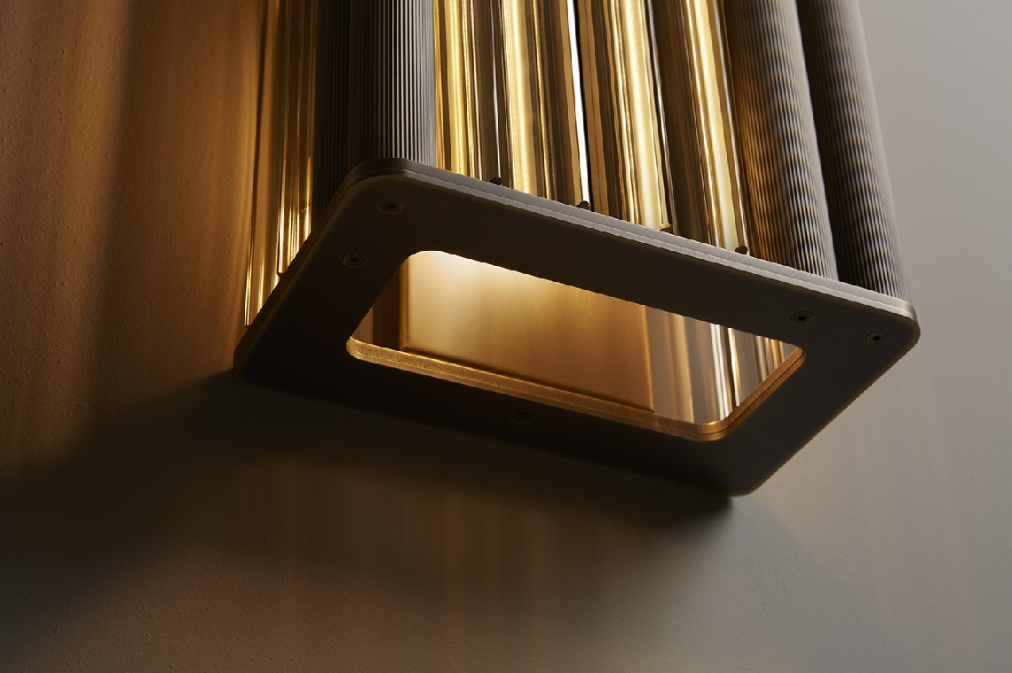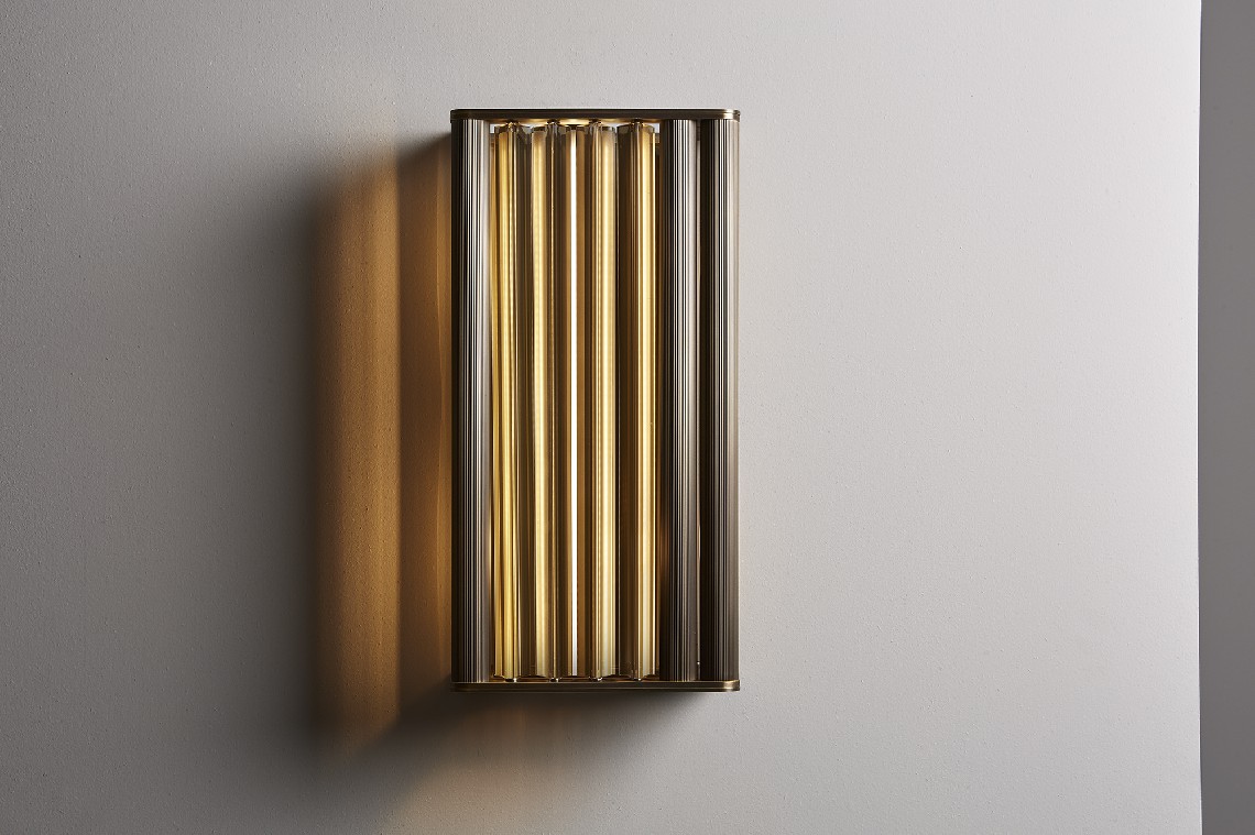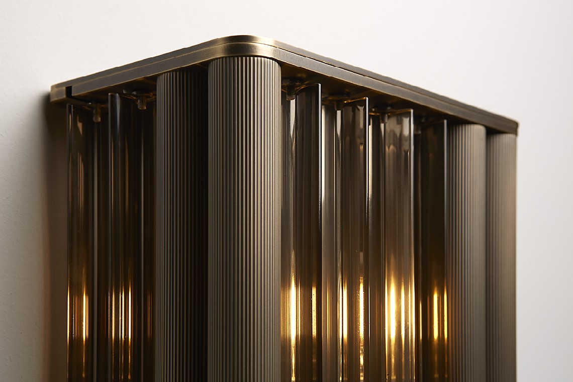 Wall lamp with diffused light. Dark burnished brass structure and crystal, amber or smoke grey Murano blown glass trihedrons.