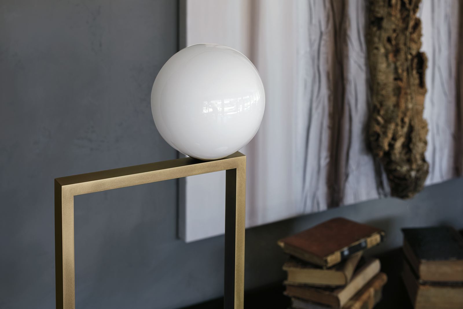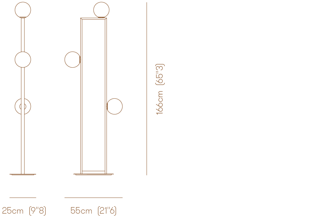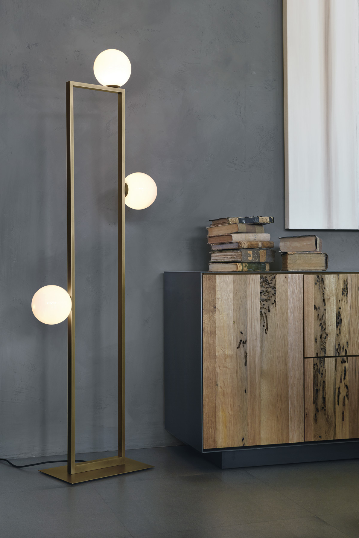 Floor lamp with diffused light. Burnished natural brass, matte black nickel, polished black nickel or polished gold structure and white Murano blown glass diffusers.