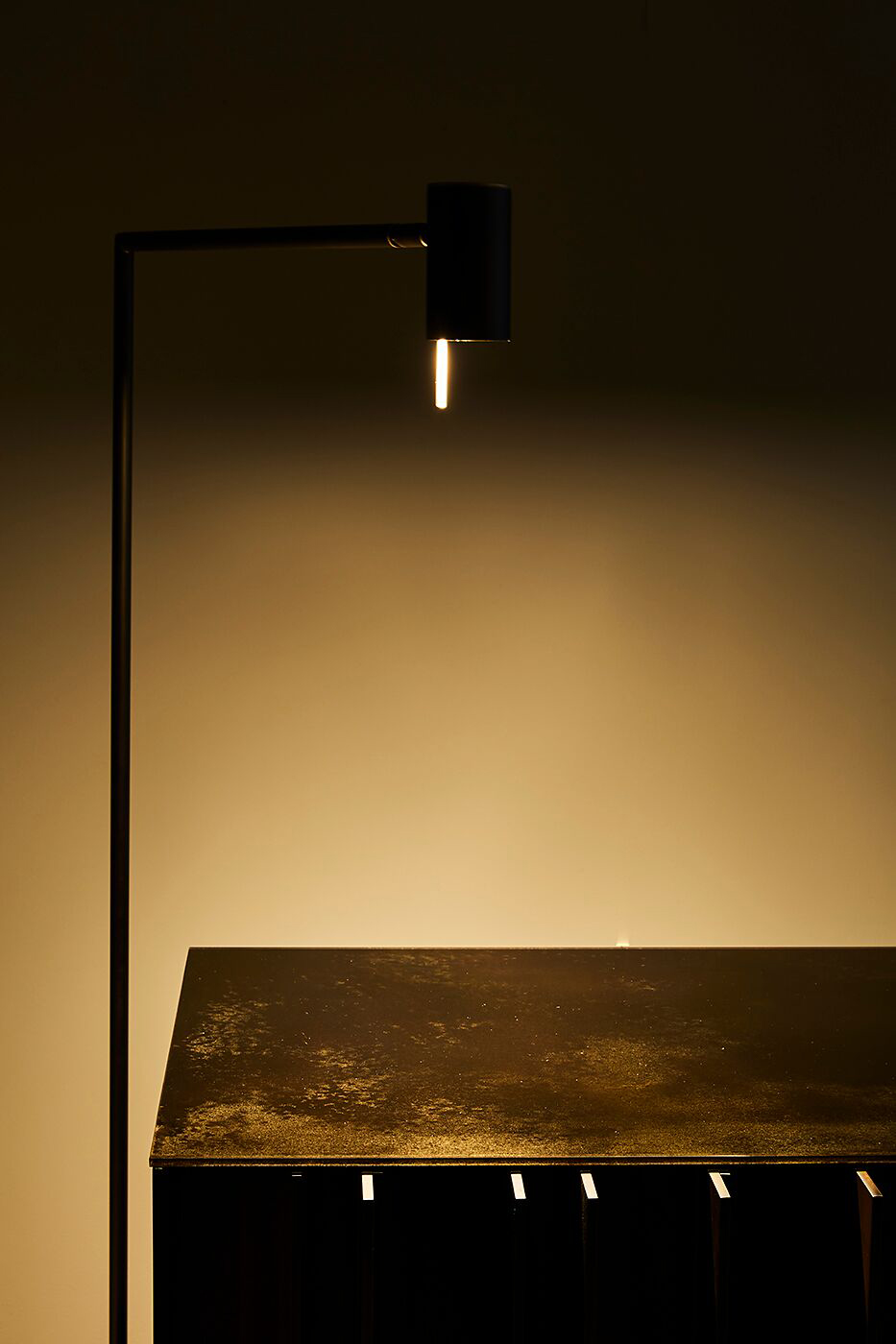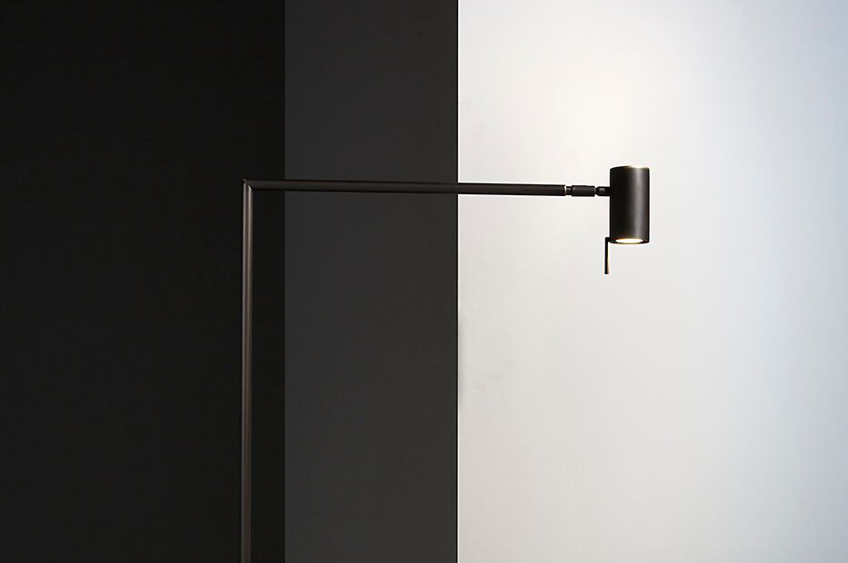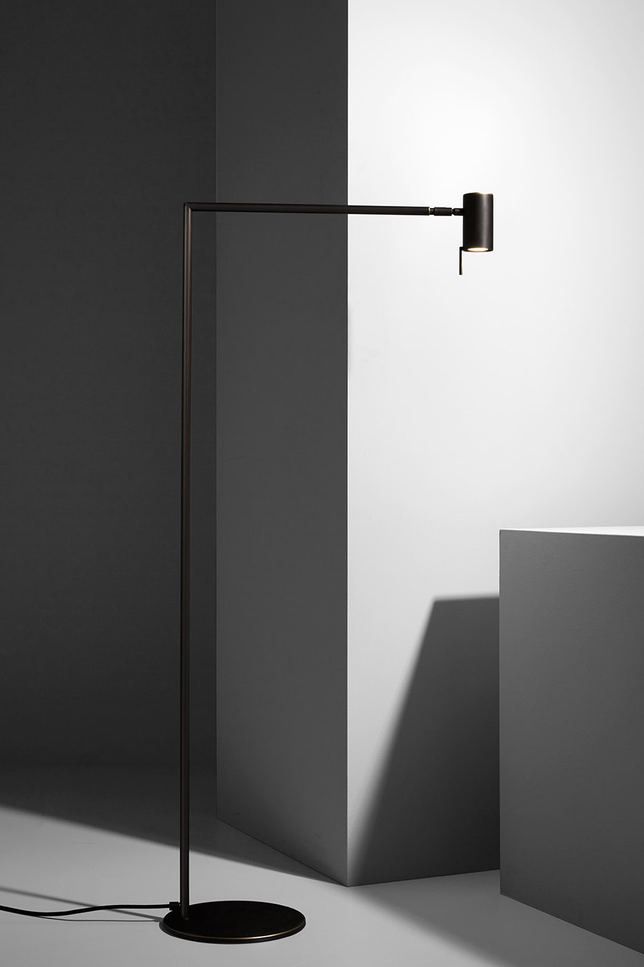 Floor lamp with directional light, dark burnished brass structure and adjustable joint.