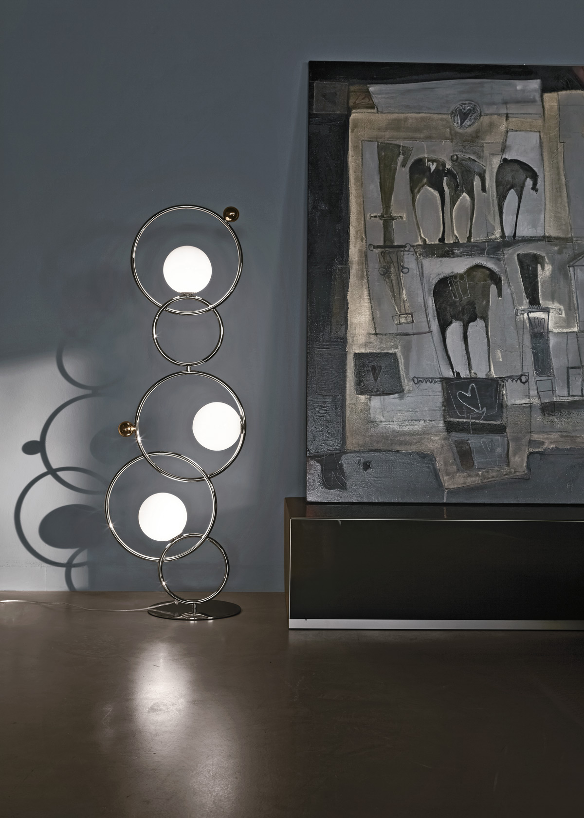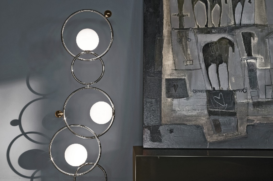 Floor lamp with diffused light. Polished black nickel, polished gold, matte black nickel, polished chrome or light burnished brass structure and white Murano blown glass diffusers. Polished black nickel, polished gold or polished chrome metal spheres.
