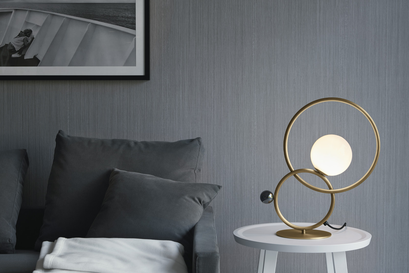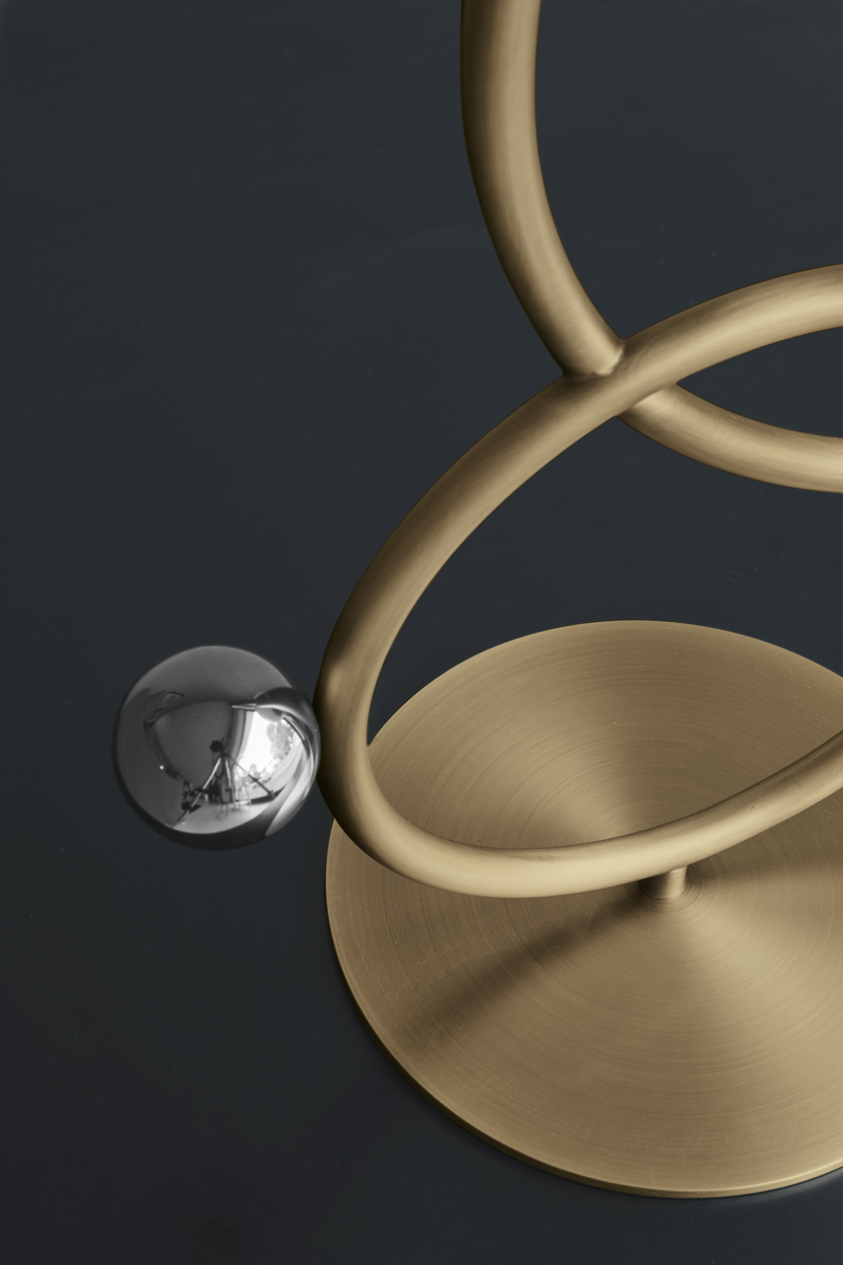 Table lamp with diffused light. Polished black nickel, polished gold, matte black nickel, polished chrome or light burnished brass structure and white Murano blown glass diffuser. Polished black nickel, polished gold or polished chrome metal sphere.