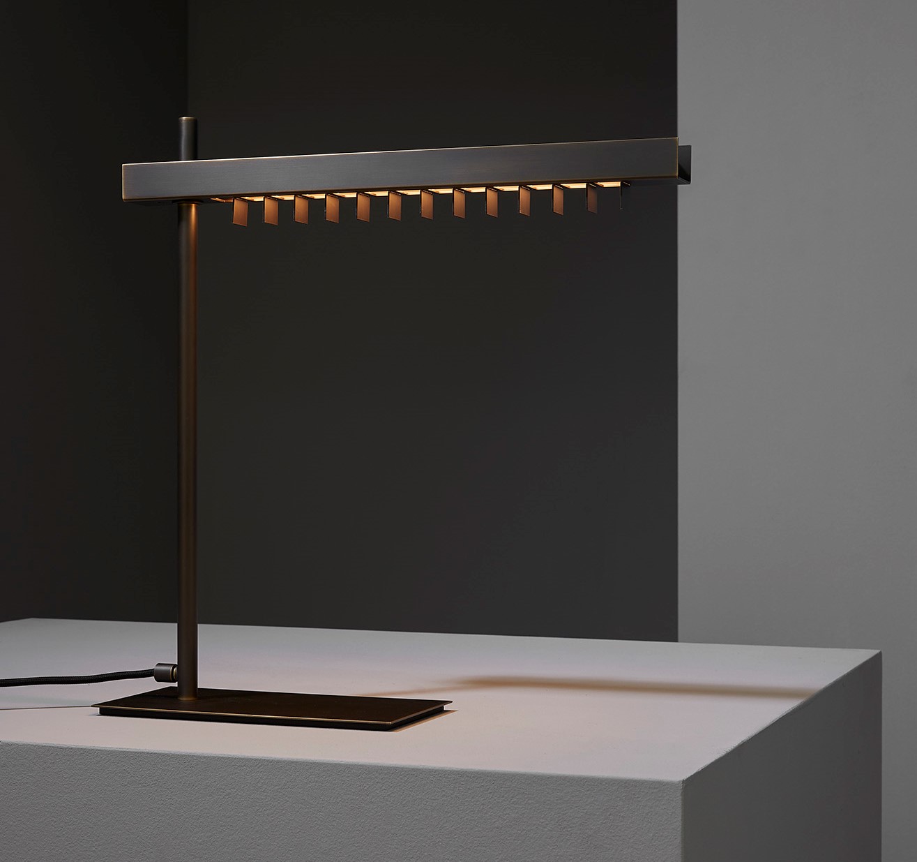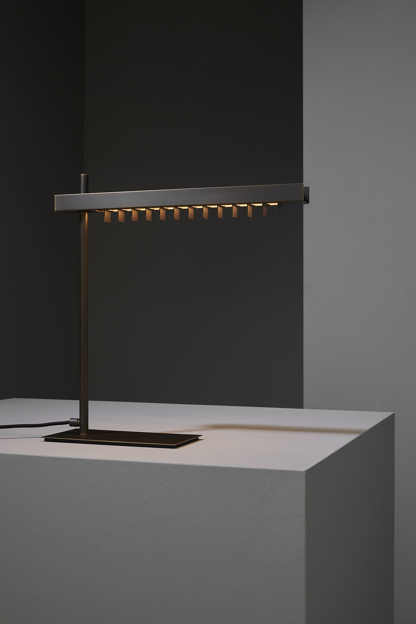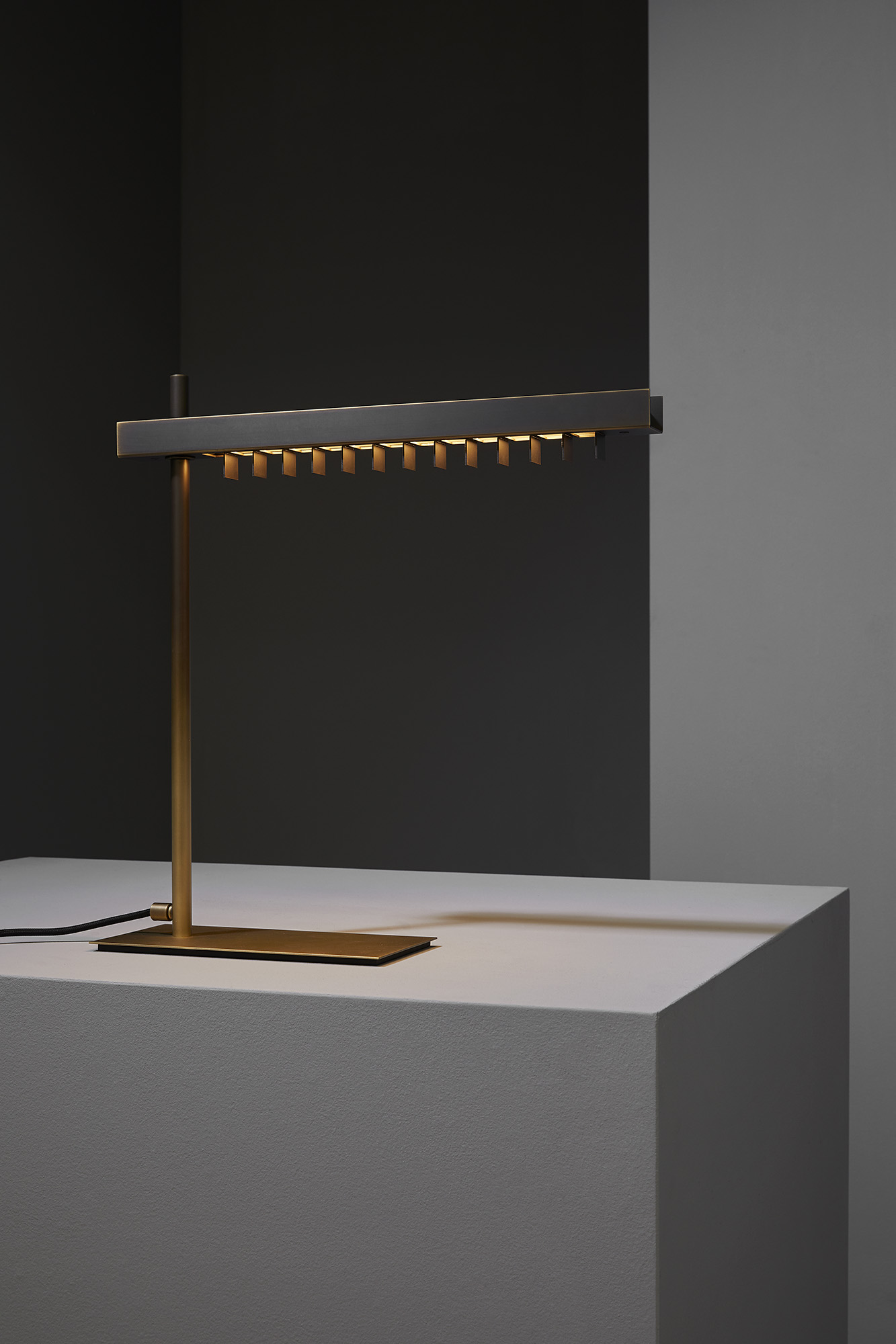 Table lamp with direct downward light. Structure in shaded burnished or dark burnished brass.