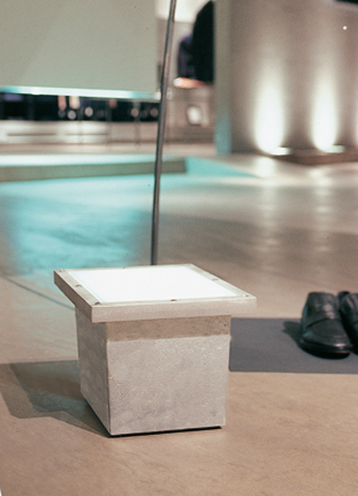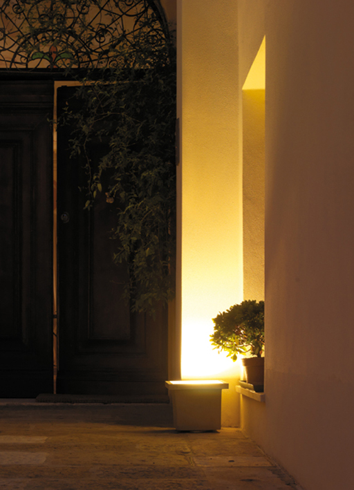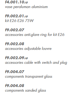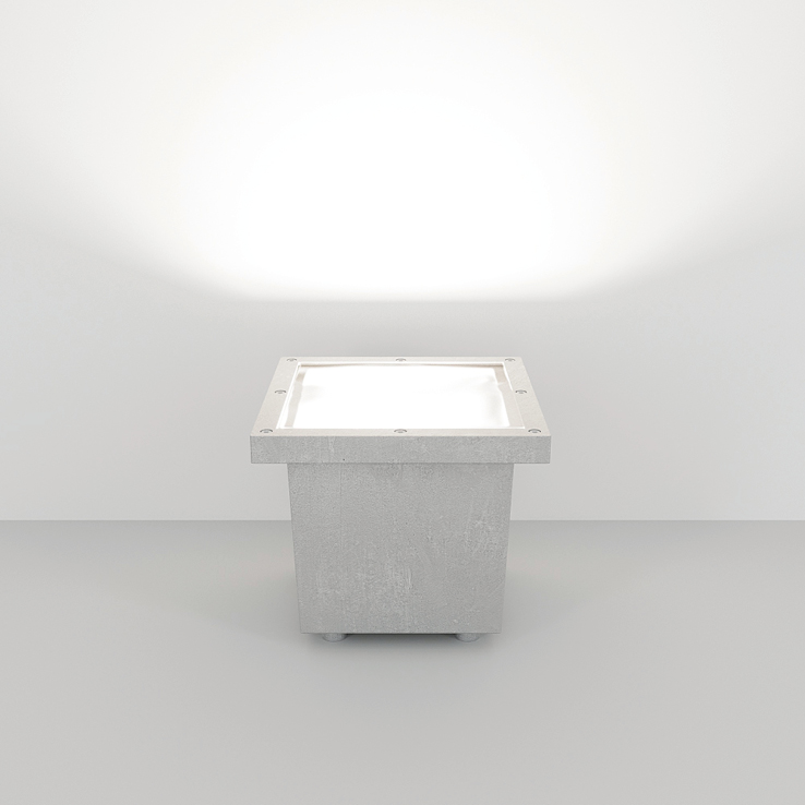 wet location rated floor-standing light fitting for indoor and outdoor use. made of peraluman aluminium, size 280x280mm/11x11’’ h.218mm/8.6’’ versions: vase with trasparent shock-resistant glass. vase with sanded shock-resistant glass. kit E26 adjustable 75W. 120V 50-60Hz power supply included. accessories: adjustable anti-glare louvres, cable with switch and plug. finishes: peraluman aluminium.