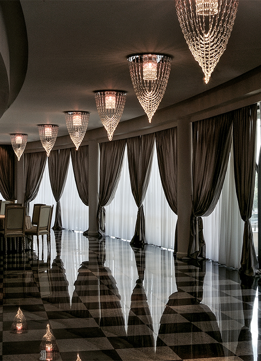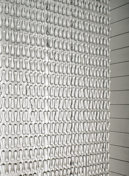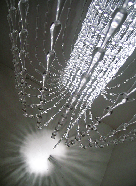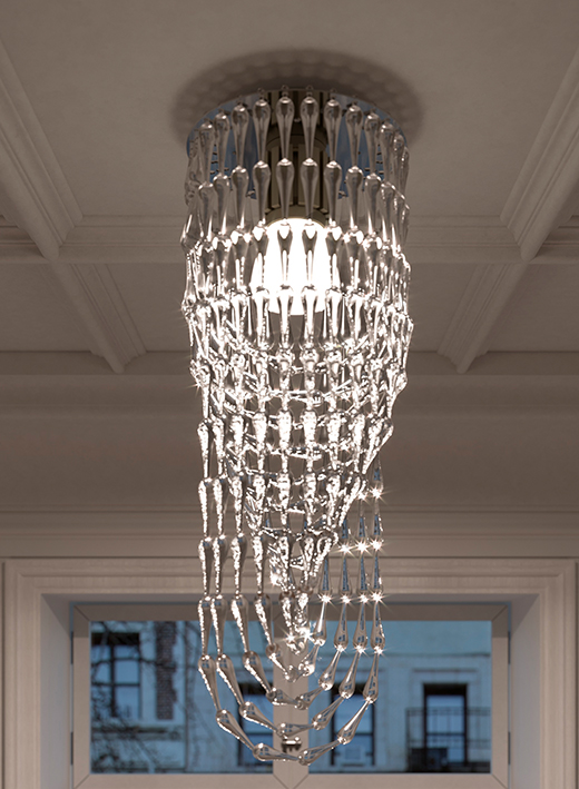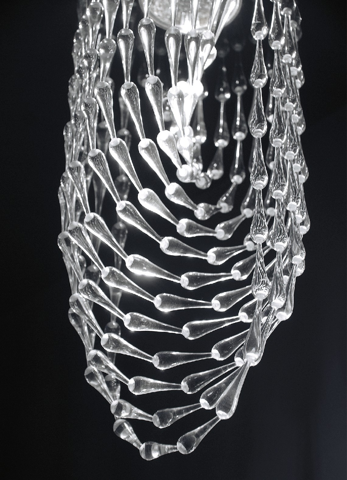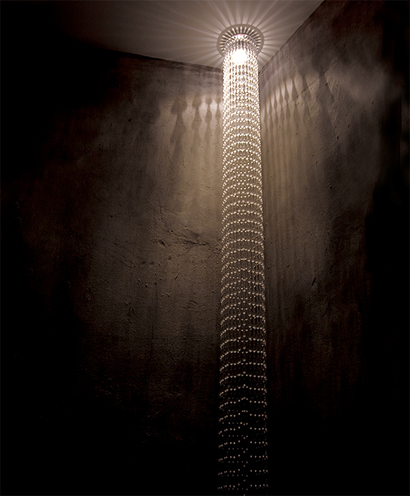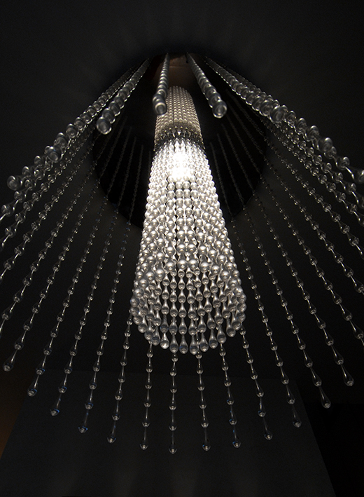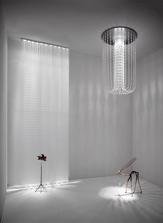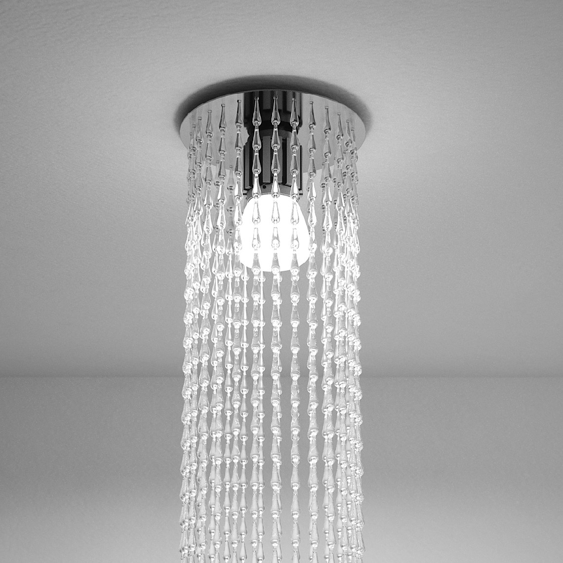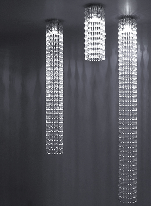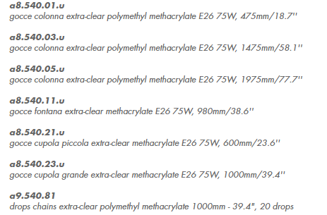 dry location rated ceiling light fitting for indoor use. it consists of a circular plate of AISI 304 polished stainless steel, housing a modular system of extra-light polymethyl methacrylate droplet chains. versions: gocce colonna with 30 droplet chains which create a ?200mm/7.9’’, h.475mm/18.7’’ or 1000mm/39.3’’ column. gocce cupola grande with 45 droplet chains which create a ?574mm/22.6’’ h.1000mm/39.3’’ dome. gocce cupola piccola with 15 droplet chains which create a ?200mm/7.9’’ h.600mm/23.6’’ dome. gocce fontana with 30 droplet chains which create a ?574mm/22.6’’ h.980mm/38.6’’ fountain. wired for E26 75W bulb excluded. accessories: drop chain 1000mm or 7500mm long. finishes: polished stainless steel plate.