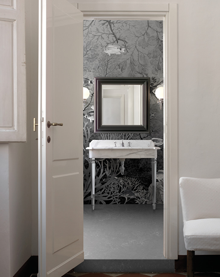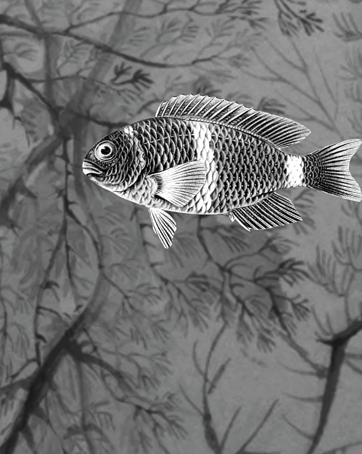 Wallpaper with a dreamlike atmosphere, imagined by Vito Nesta as a fantastic seabed populated by fishes. It is available in three chromatic variations.