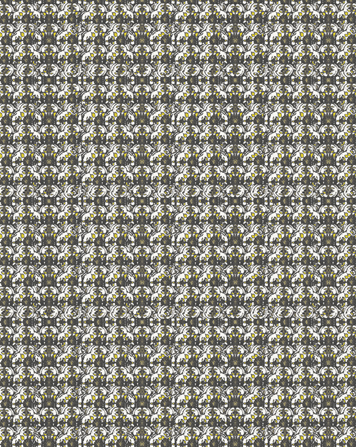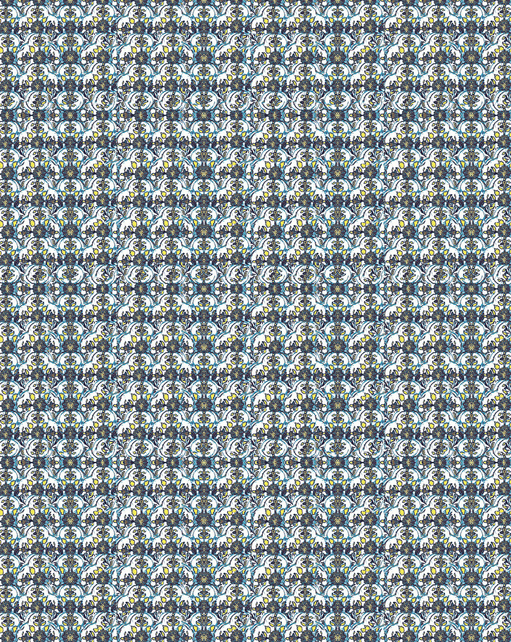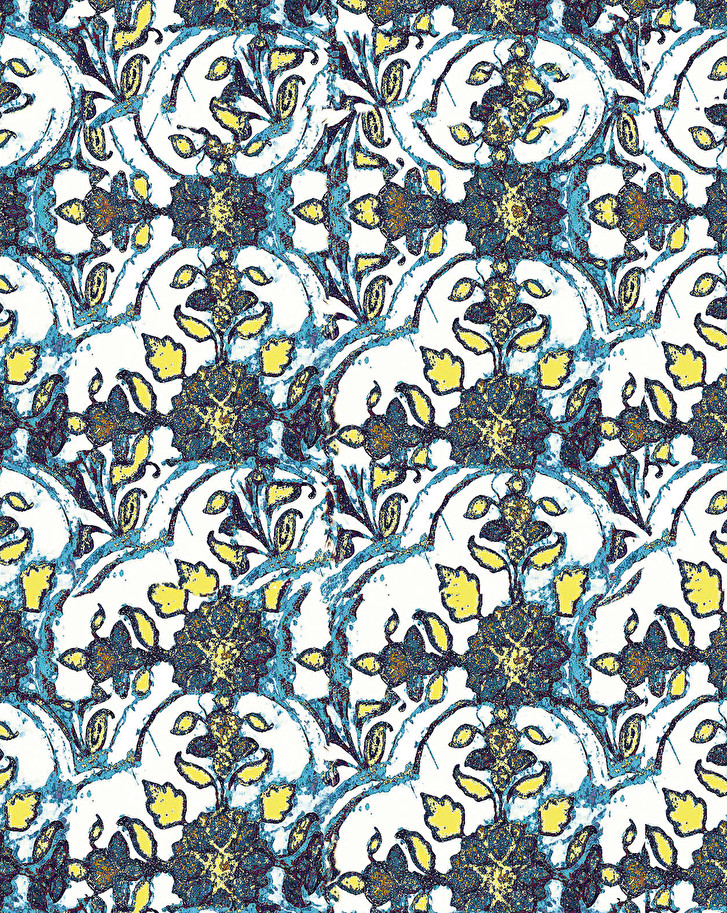 Wallpaper featuring a kaleidescope of oriental-inspired floral graphics, designed by the eclectic taste of Nina Farré. It is available in five colours.