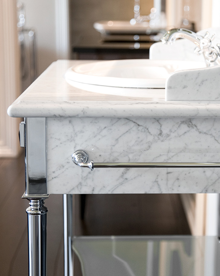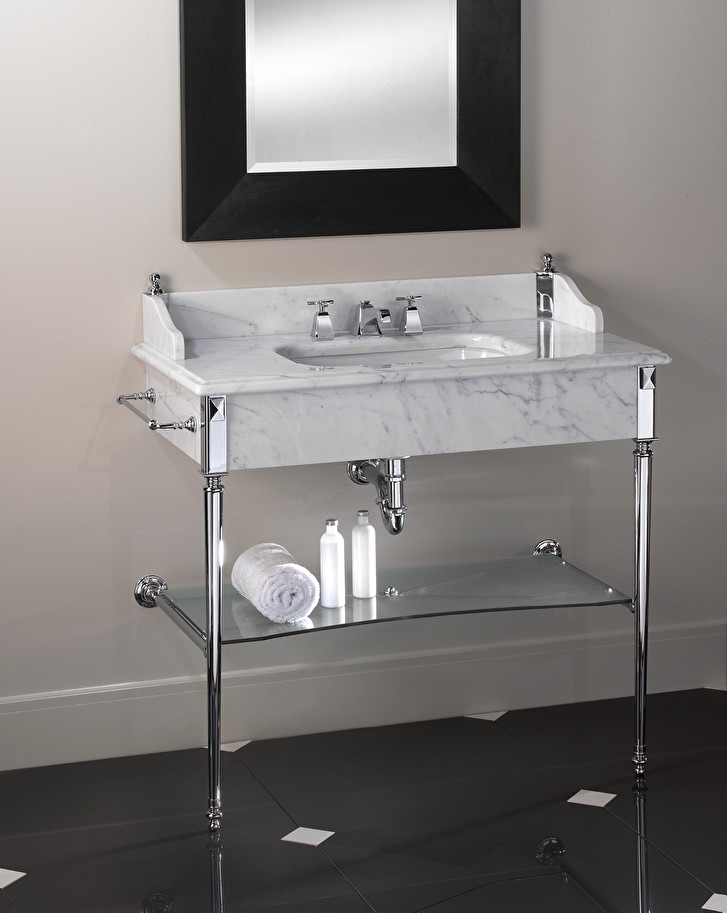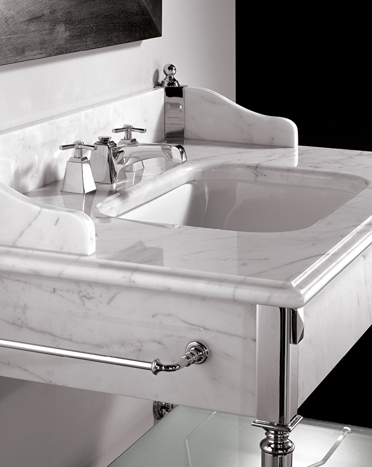 Being inspired by the English design of the late 19th-century, this console is a small masterpiece of formal harmony. High-quality materials: precious white Carrara, black Marquinha or Calacatta Borghini marble for top and raised back, turned brass for legs and towel rail, available in chrome, light gold or polished nickel finishes.