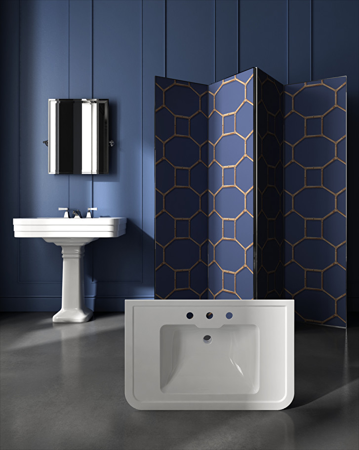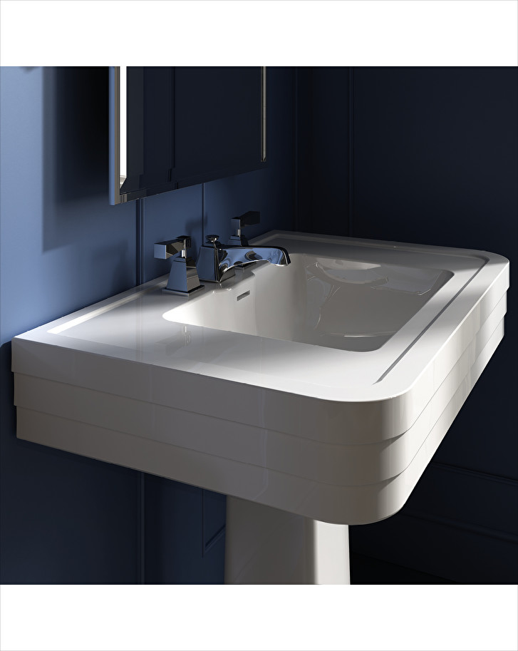 A large and stylish washbasin with pedestal. Its essential design that enhances the harmony of Art Déco architectures makes it a piece of great character and surprising versatility, which is perfect to fit harmoniously in any context. It is available in the versions with 1 or 3 holes.
