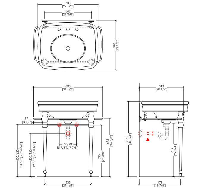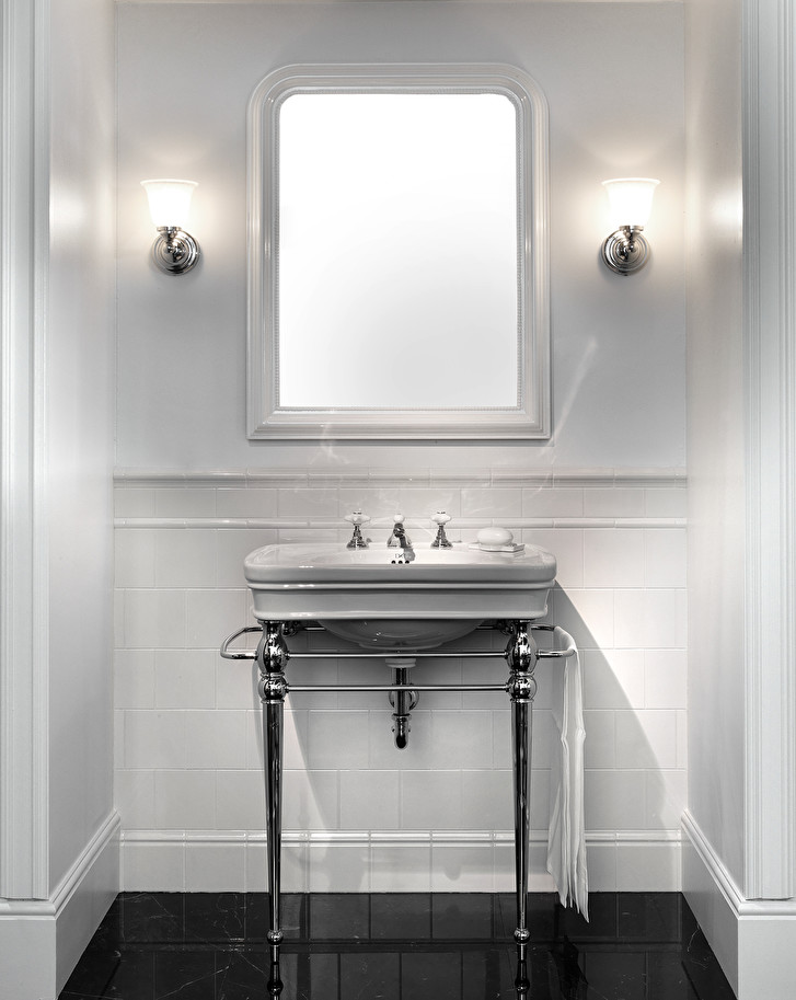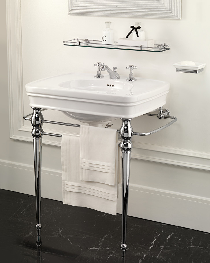 This eclectic console combines the harmonic classic inspiration with the sophisticated atmospheres of the best design from the Fifties. The aluminium bearing structure, with turned brass elements, is available in chrome, light gold or polished nickel finishes. It is completed with the porcelain basin of the same name, characterized by the large countertop surface, and with four handy towel bars.