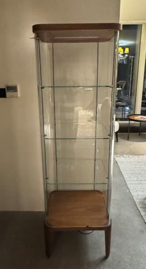 Extra clear glass showcase with top and bottom in Canaletto walnut (NC), burned oak (RB), natural oak (RN). Extra clear glass shelves. With led light. Max capacity: each shelf kg 6.