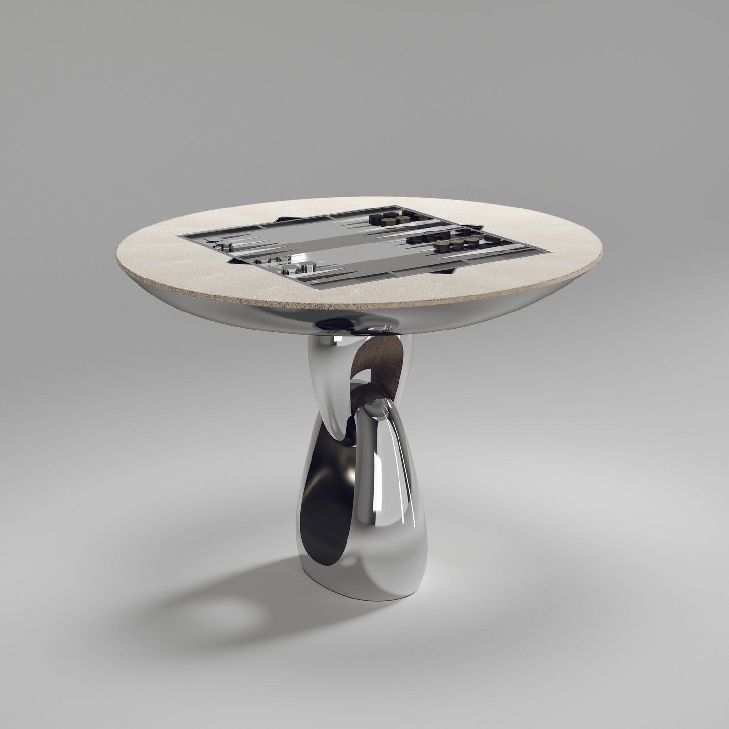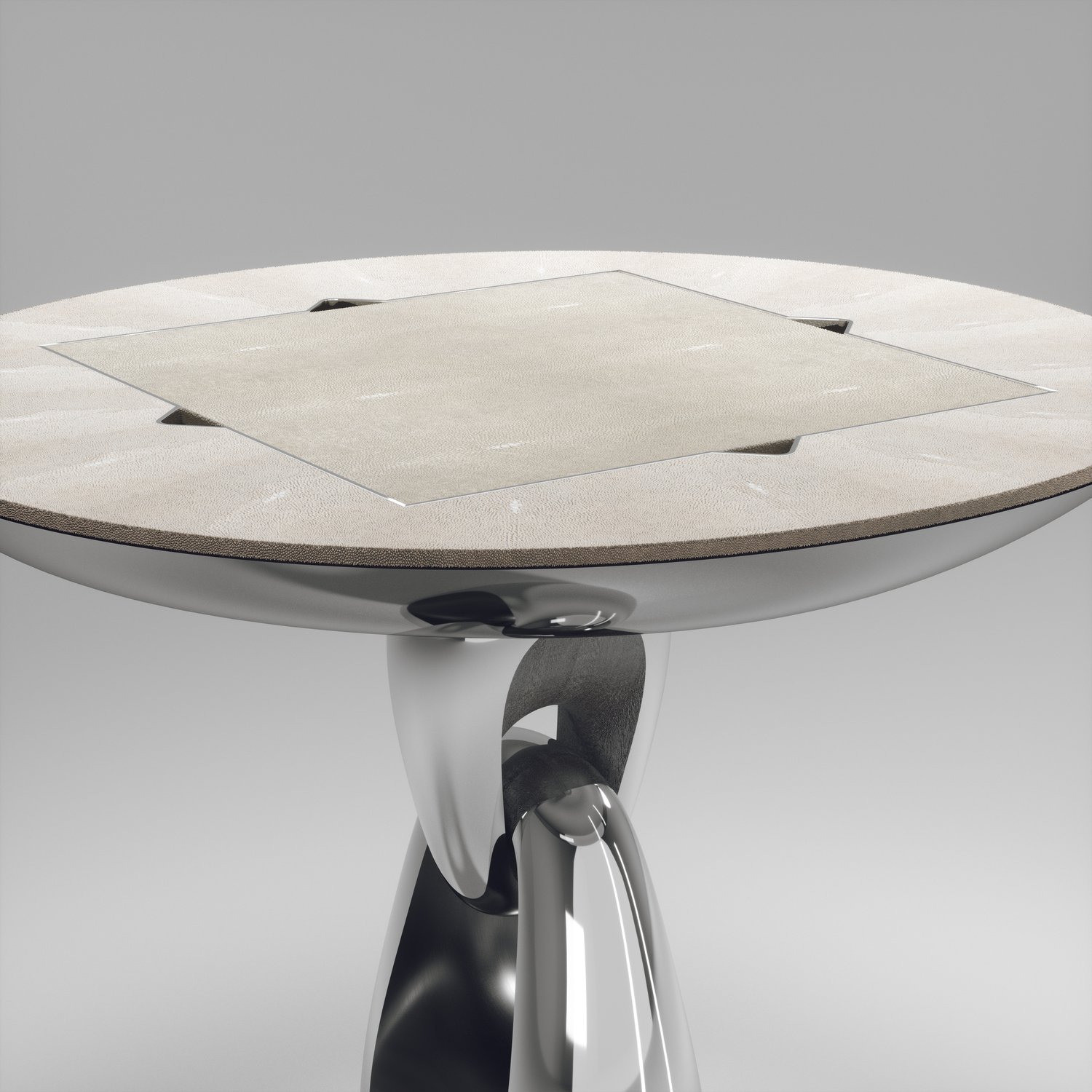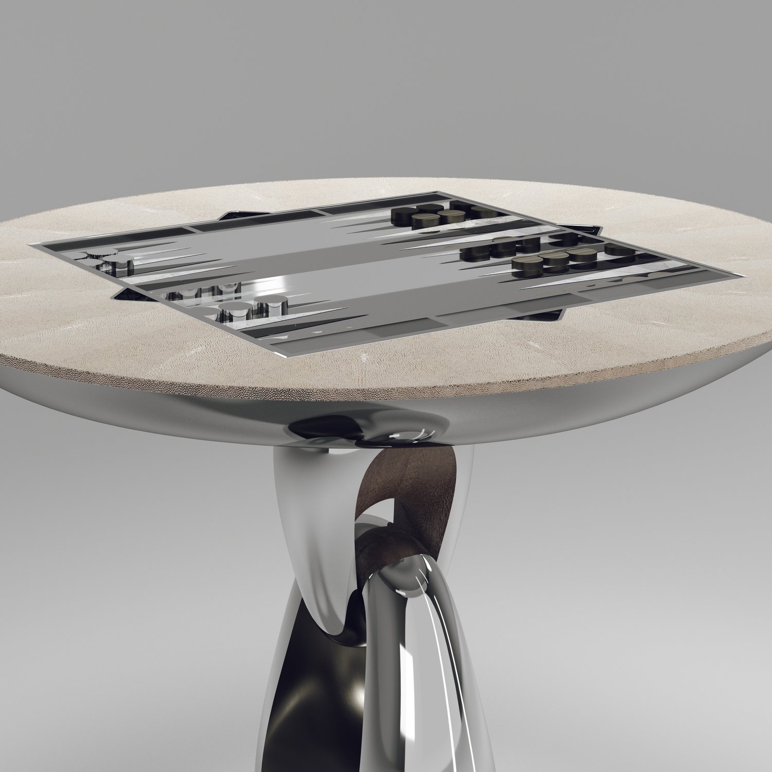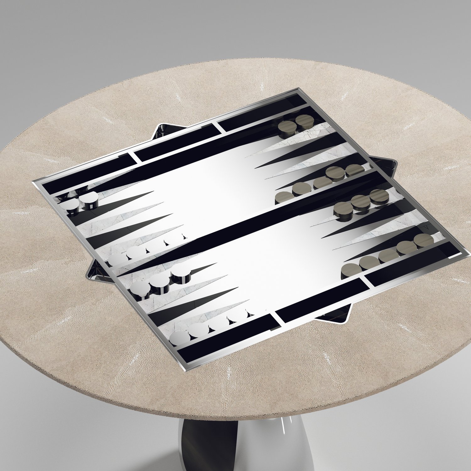 The 4 in 1 Saturn game table R&Y Augousti is a truly luxurious statement piece for your home. The clean lines of the overall piece in black or antique natural shagreen, accentuated by the sculptural and sleekchrome finish polished stainless base make it versatile for any space. This piece includes a complete game package set with interchangeable boards that stack on top of each other in the centre of the table; one for chess, one for backgammon backgammon, a green velvet bard to play your favourite card games and a plain shagreen board if one were to use it as a beautiful centre piece.