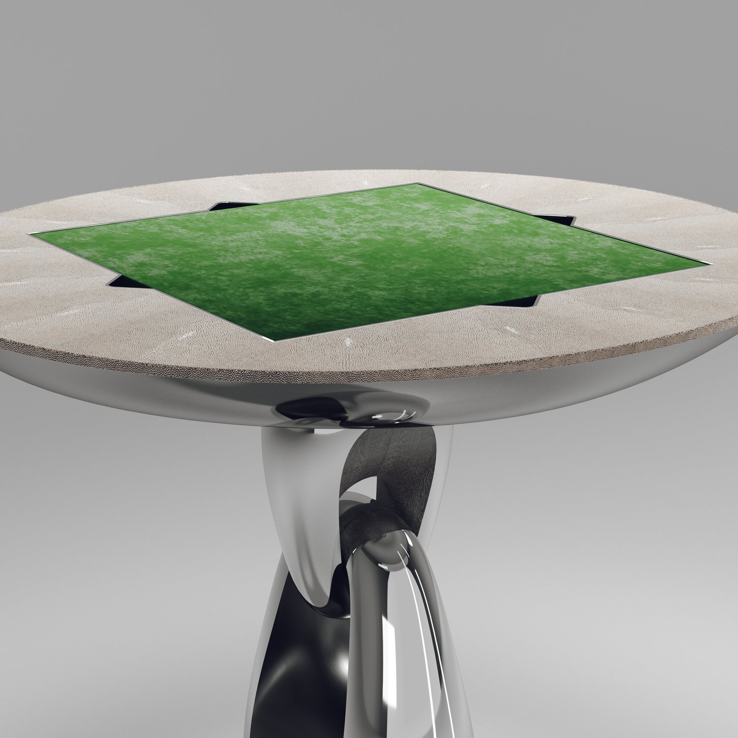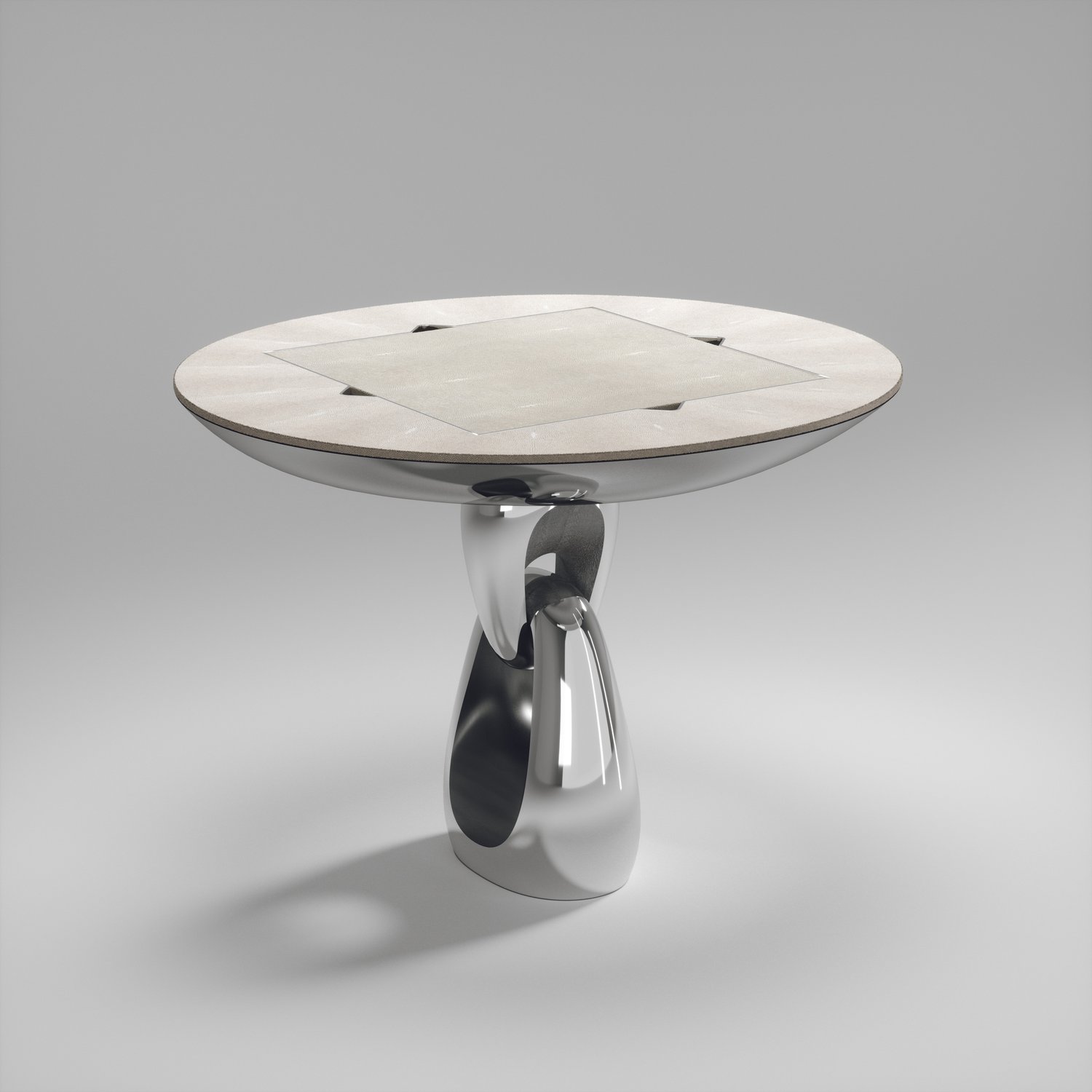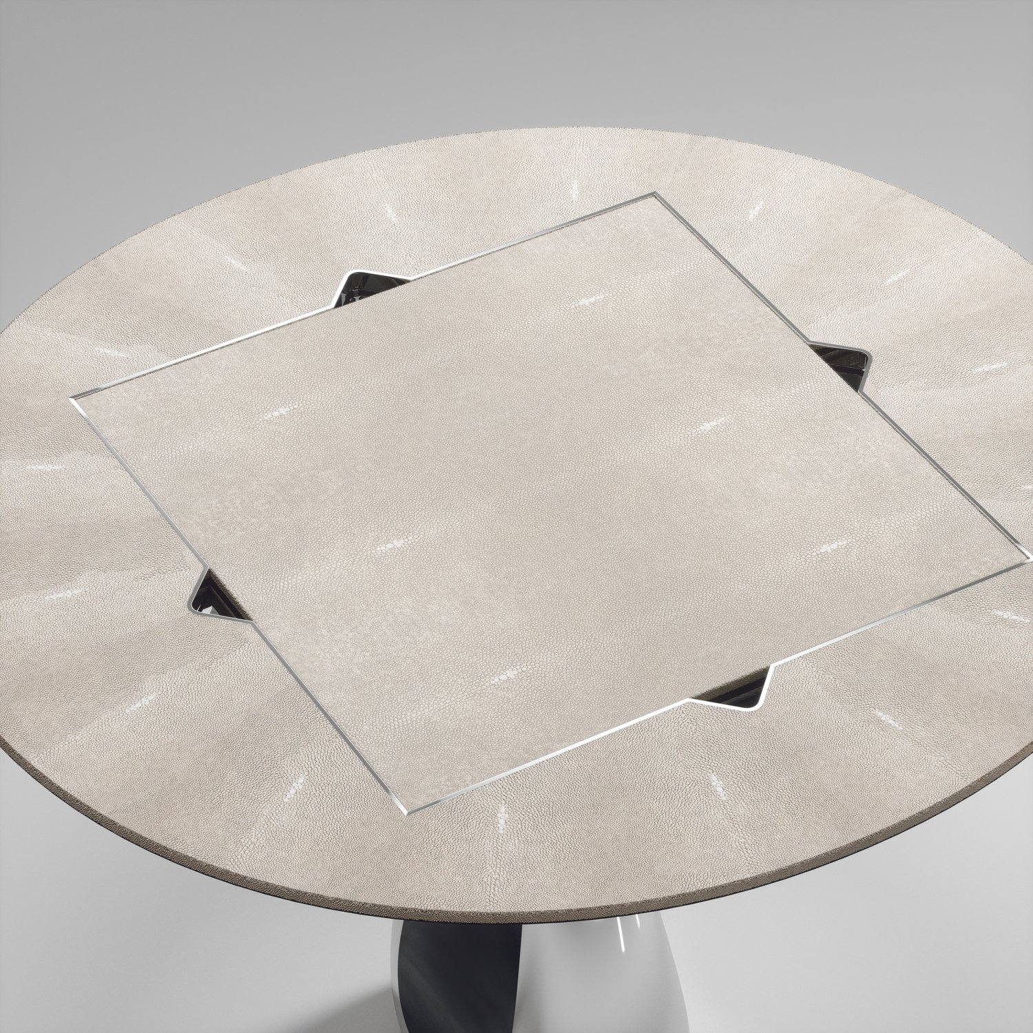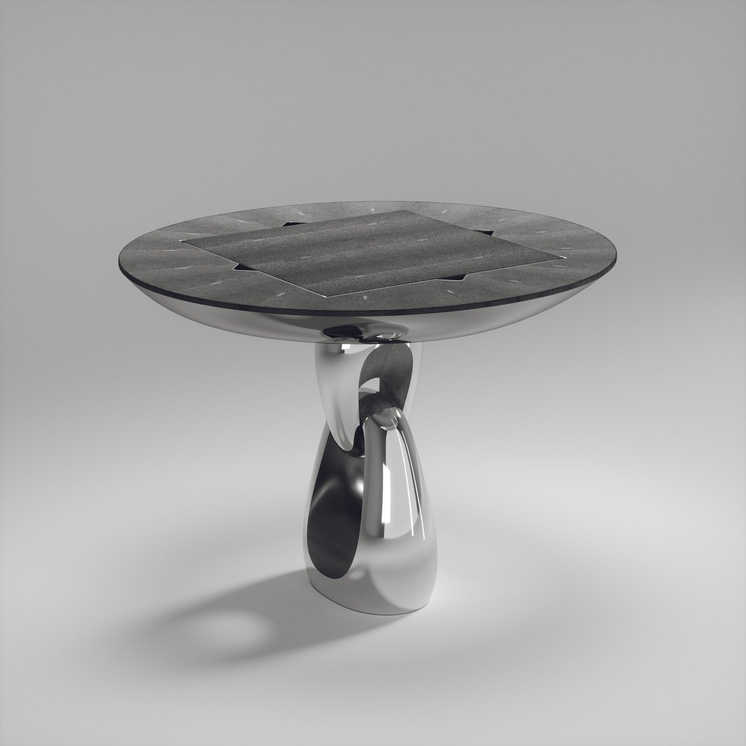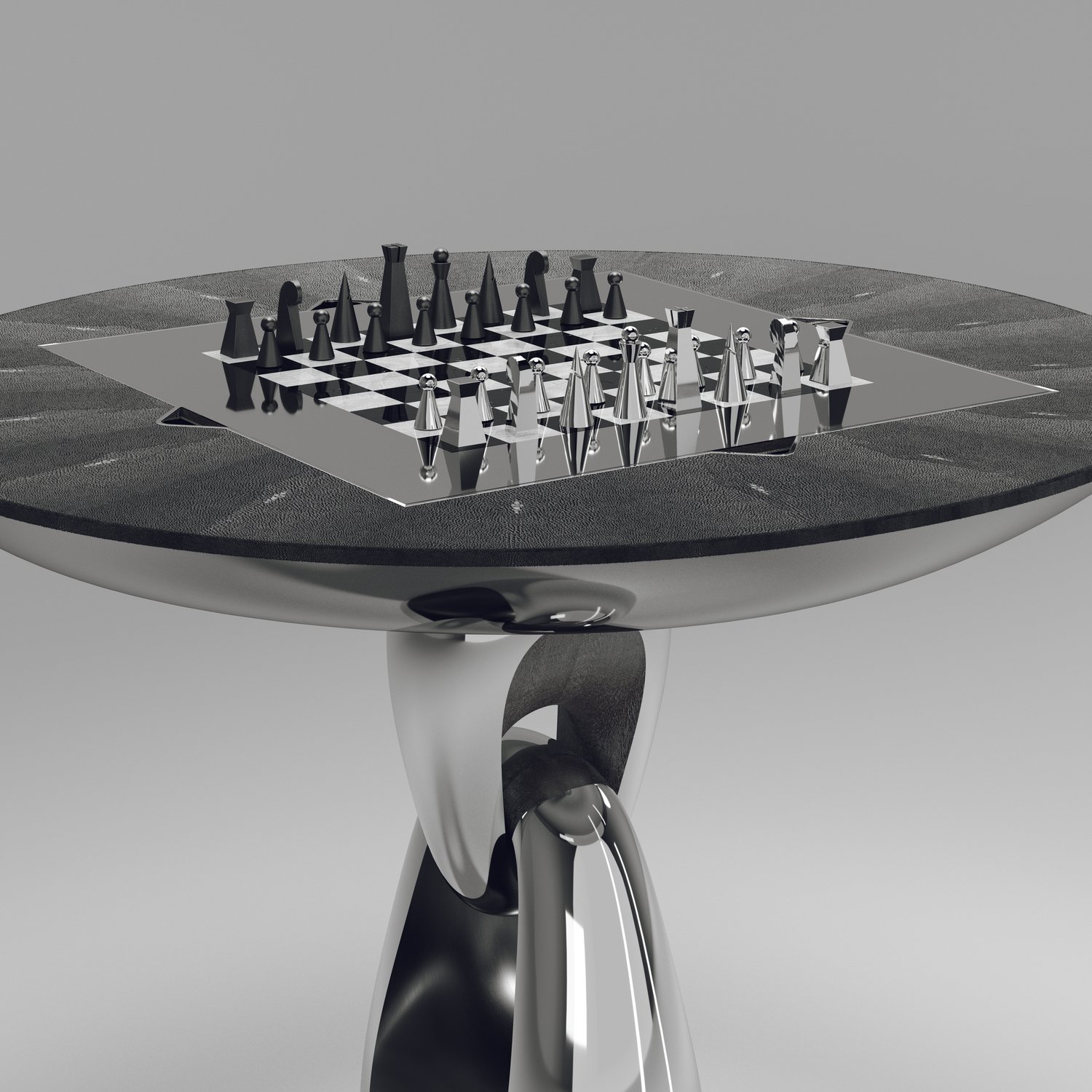 The 4 in 1 Saturn game table R&Y Augousti is a truly luxurious statement piece for your home. The clean lines of the overall piece in black or antique natural shagreen, accentuated by the sculptural and sleekchrome finish polished stainless base make it versatile for any space. This piece includes a complete game package set with interchangeable boards that stack on top of each other in the centre of the table; one for chess, one for backgammon backgammon, a green velvet bard to play your favourite card games and a plain shagreen board if one were to use it as a beautiful centre piece.