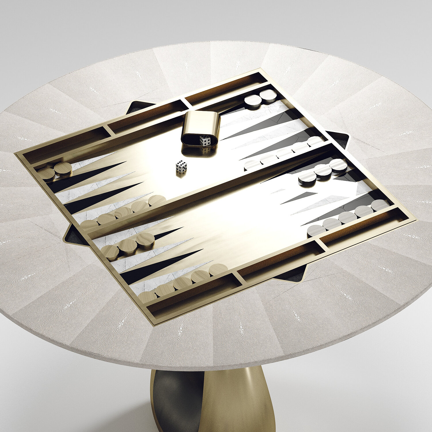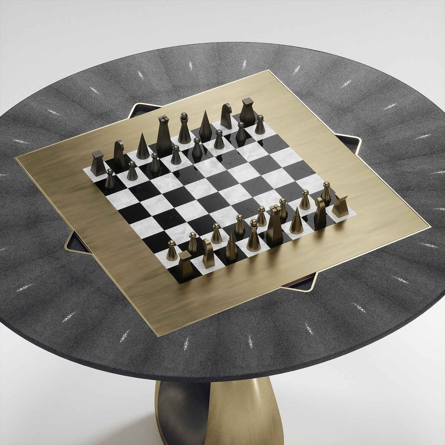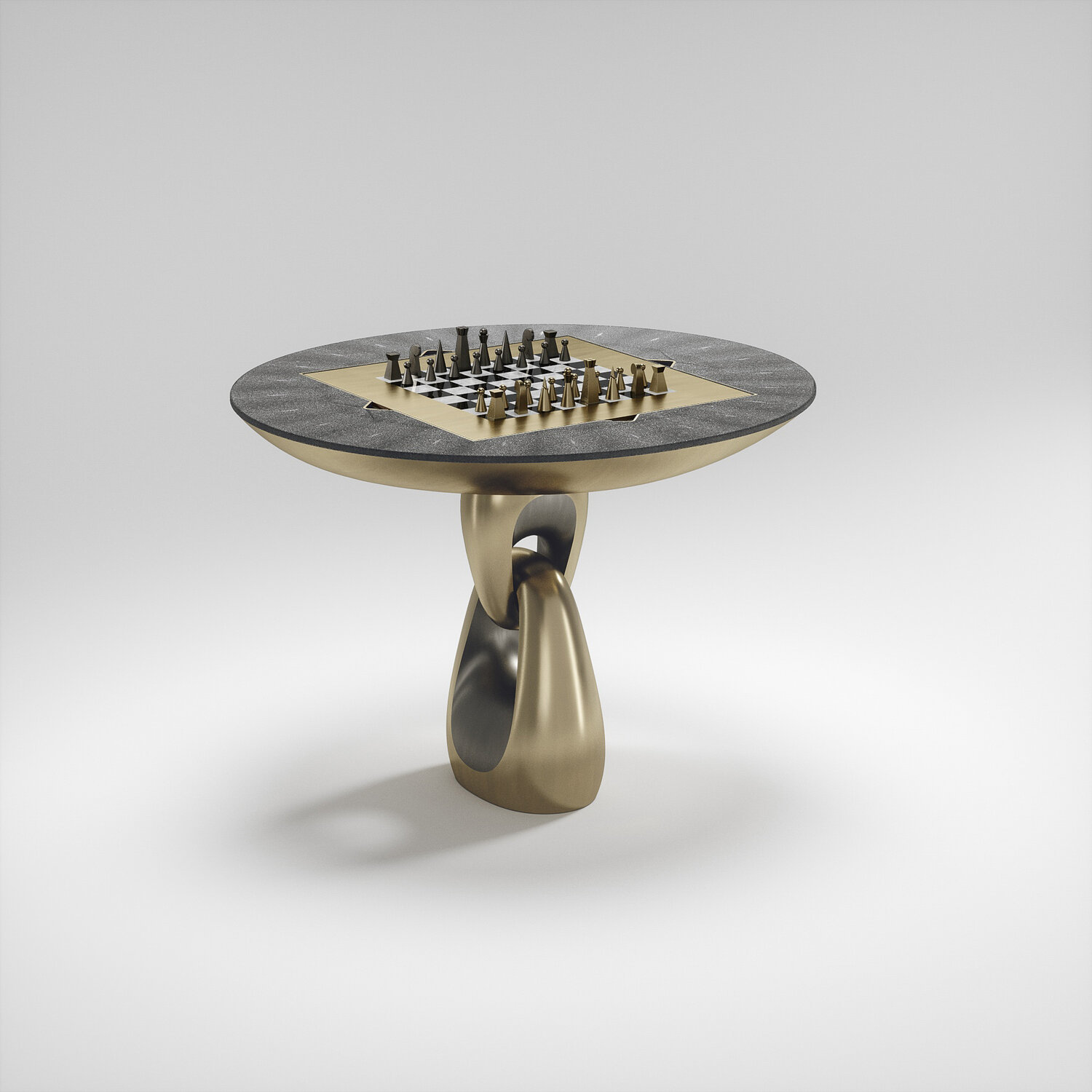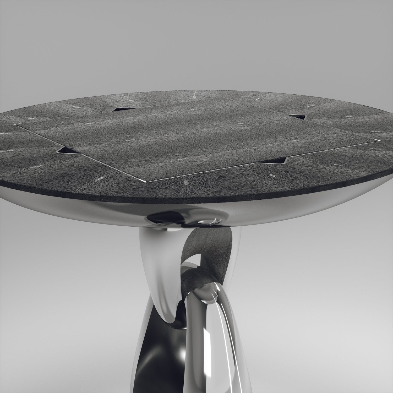 The 4 in 1 Saturn game table R&Y Augousti is a truly luxurious statement piece for your home. The clean lines of the overall piece in black or antique natural shagreen, accentuated by the sculptural and sleekchrome finish polished stainless base make it versatile for any space. This piece includes a complete game package set with interchangeable boards that stack on top of each other in the centre of the table; one for chess, one for backgammon backgammon, a green velvet bard to play your favourite card games and a plain shagreen board if one were to use it as a beautiful centre piece.