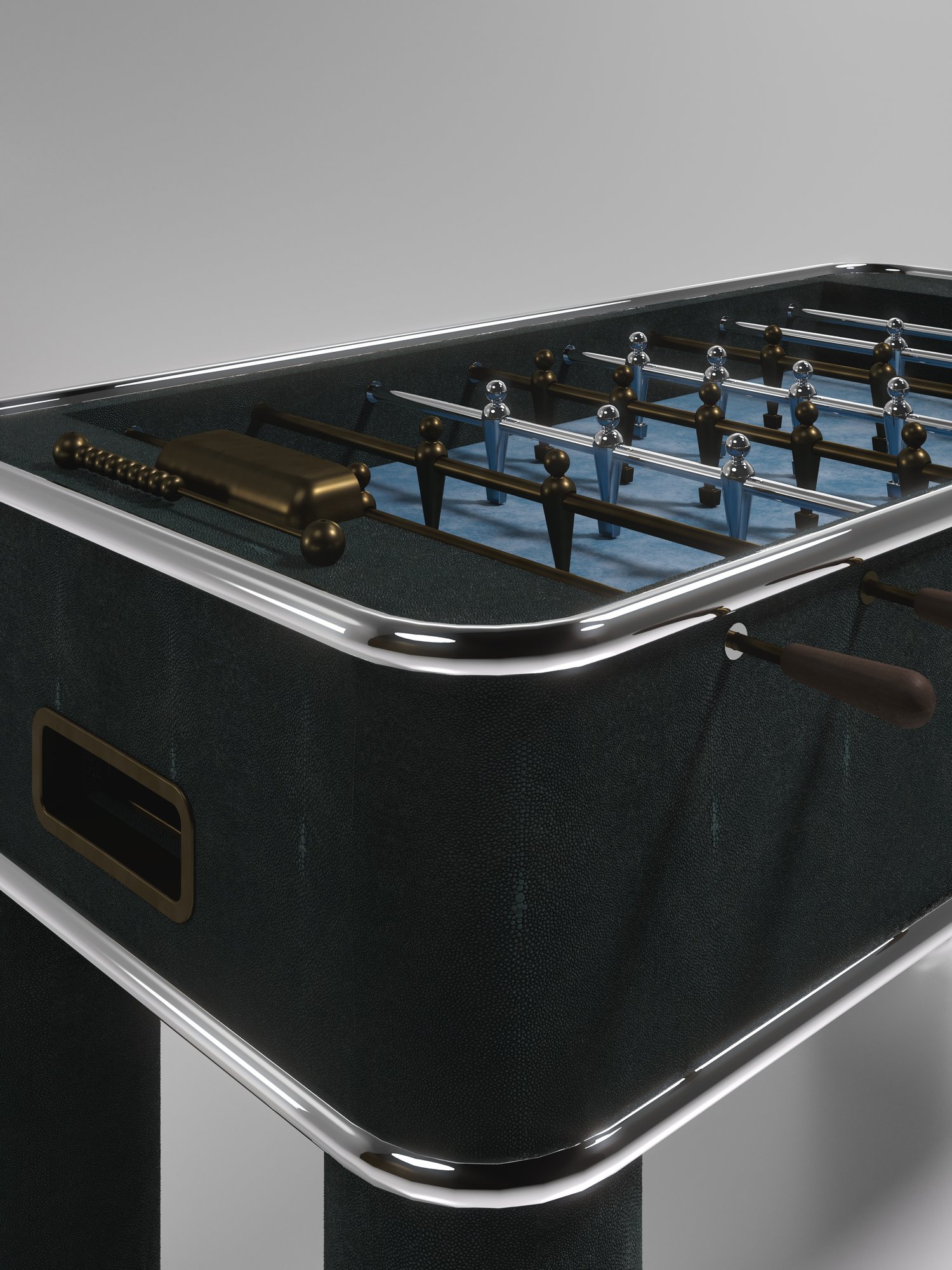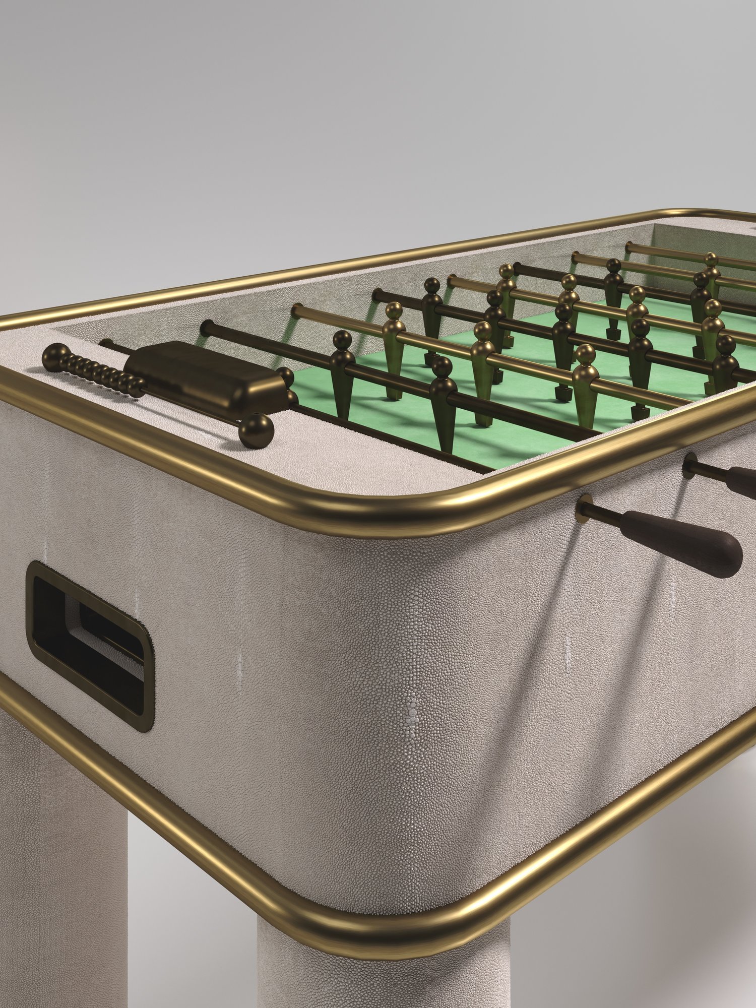 The Ring Foosball Table by R&Y Augousti is a truly luxurious statement piece for your home. The clean lines of the overall piece in cream shagreen, accentuated by the sleek bronze-patina brass piping detail makes it the ultimate luxury game table. The foosball pieces are all in brass and inner table in a green velvet felt. Available in other finishes and variations.