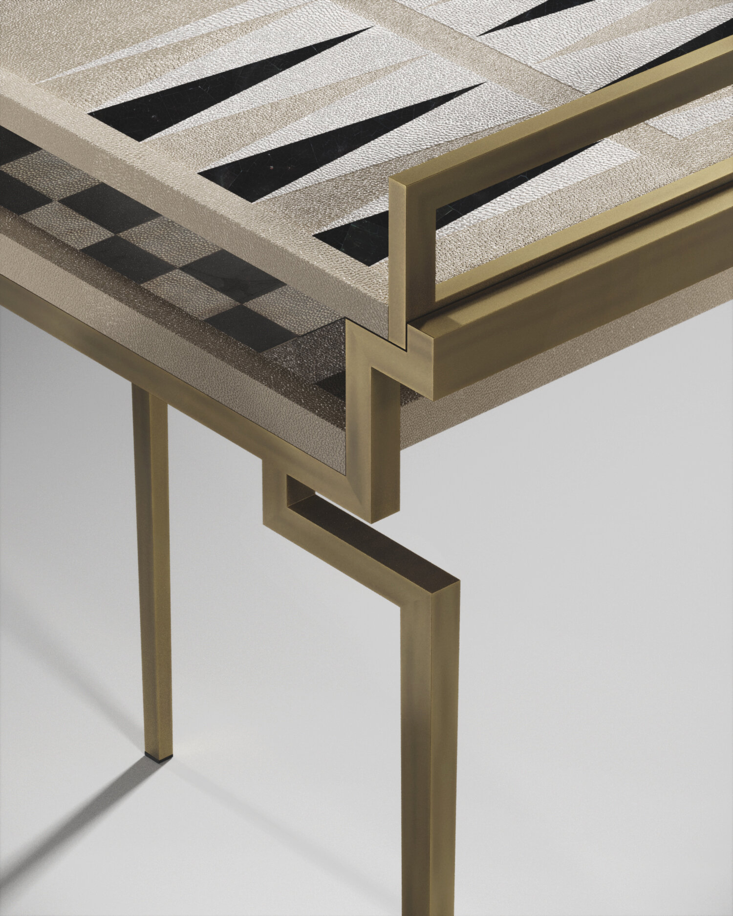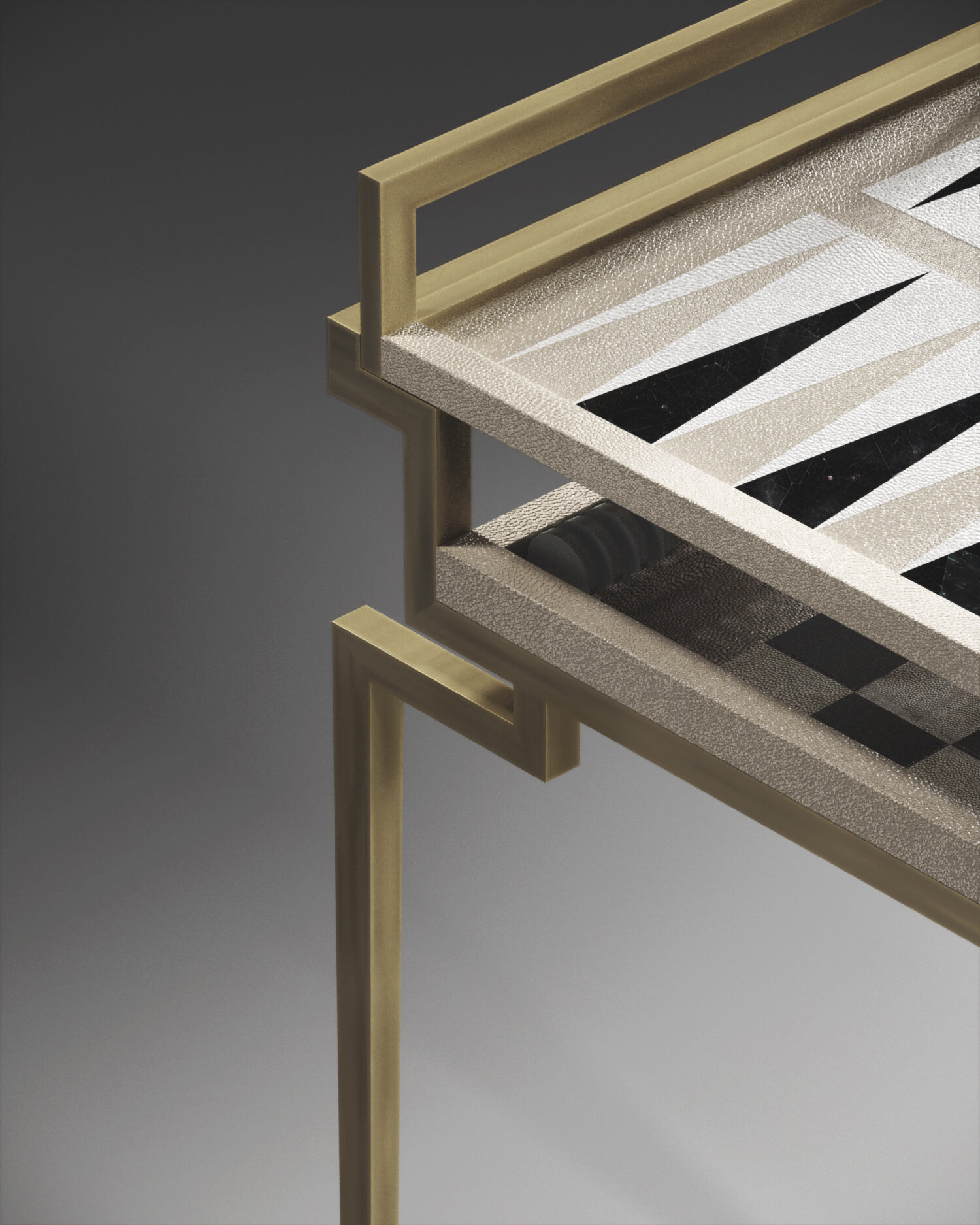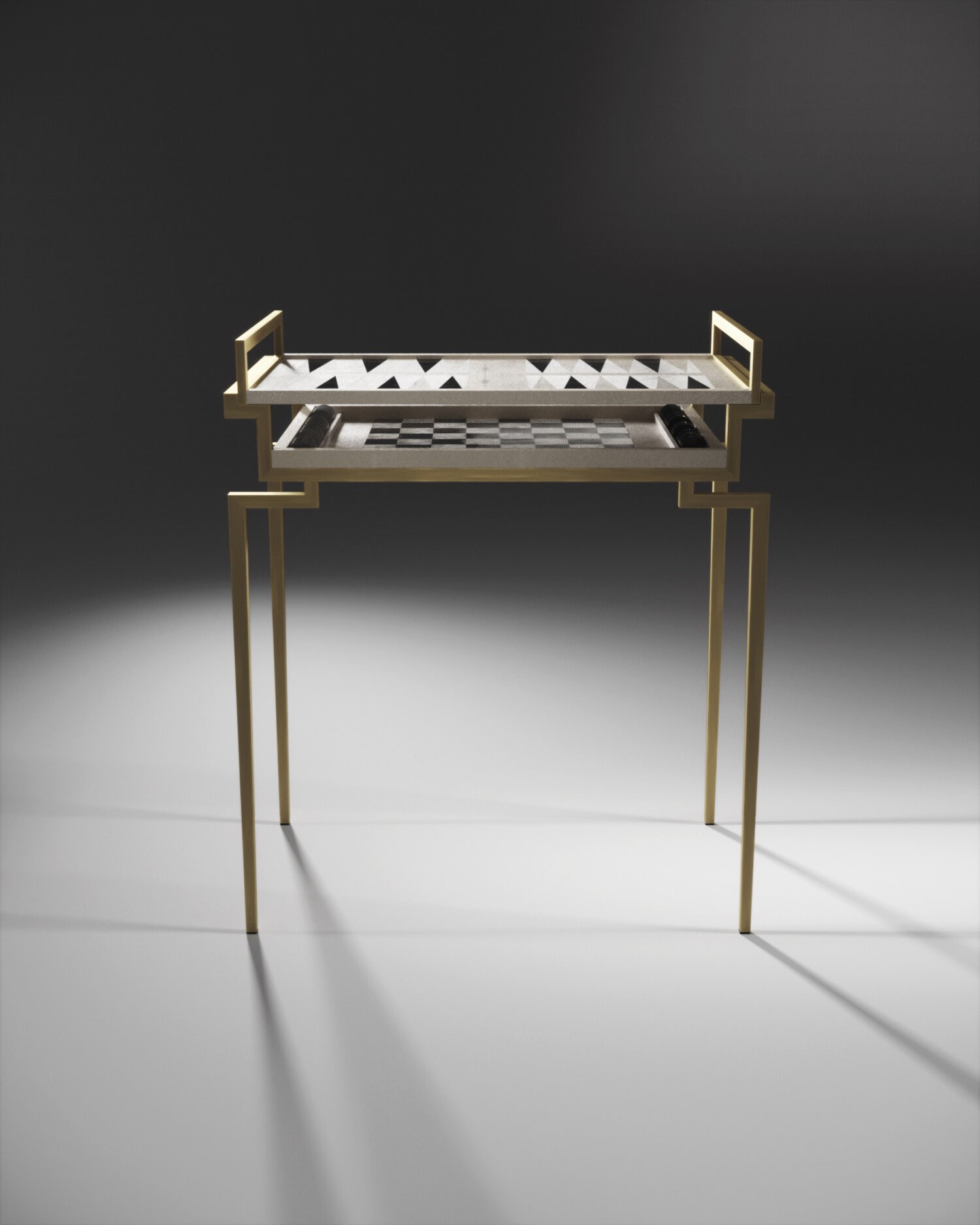 The Cecelia game table by R&Y Augousti inlaid in a mixture of cream shagreen, black pen shell and brass is the ultimate luxury piece of furniture. The top tabletop tray is for backgammon and the bottom tabletop tray is for chess. Each tabletop tray is removable to allow versatility to the overall piece. Sold with all game chips and accessories needed for chess and backgammon. Also available in black metal.