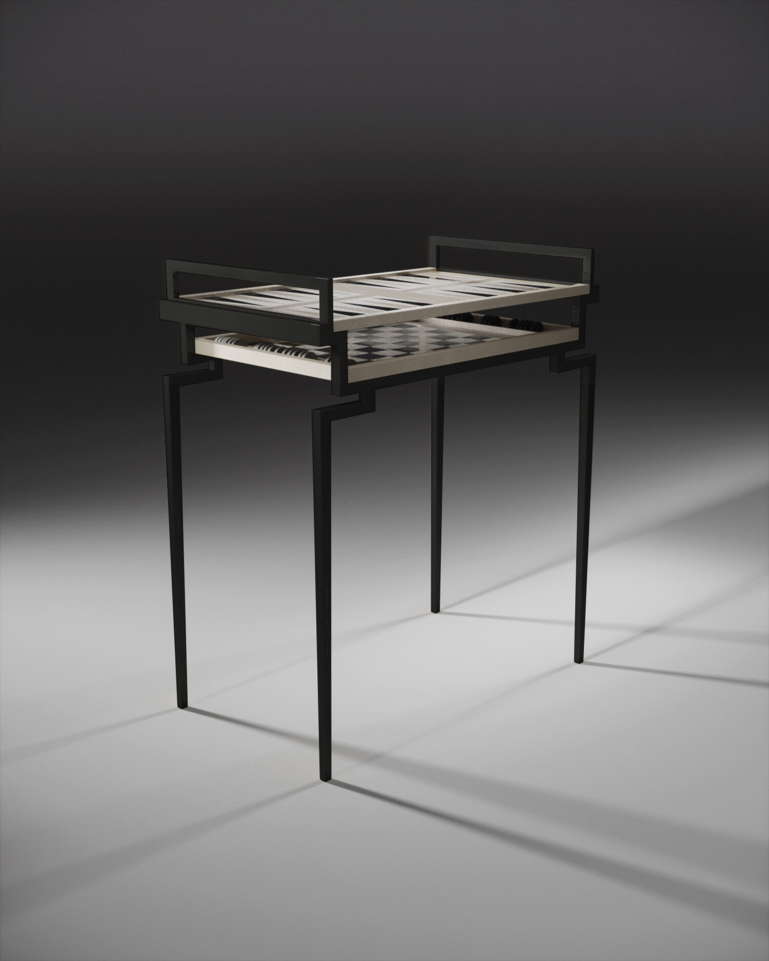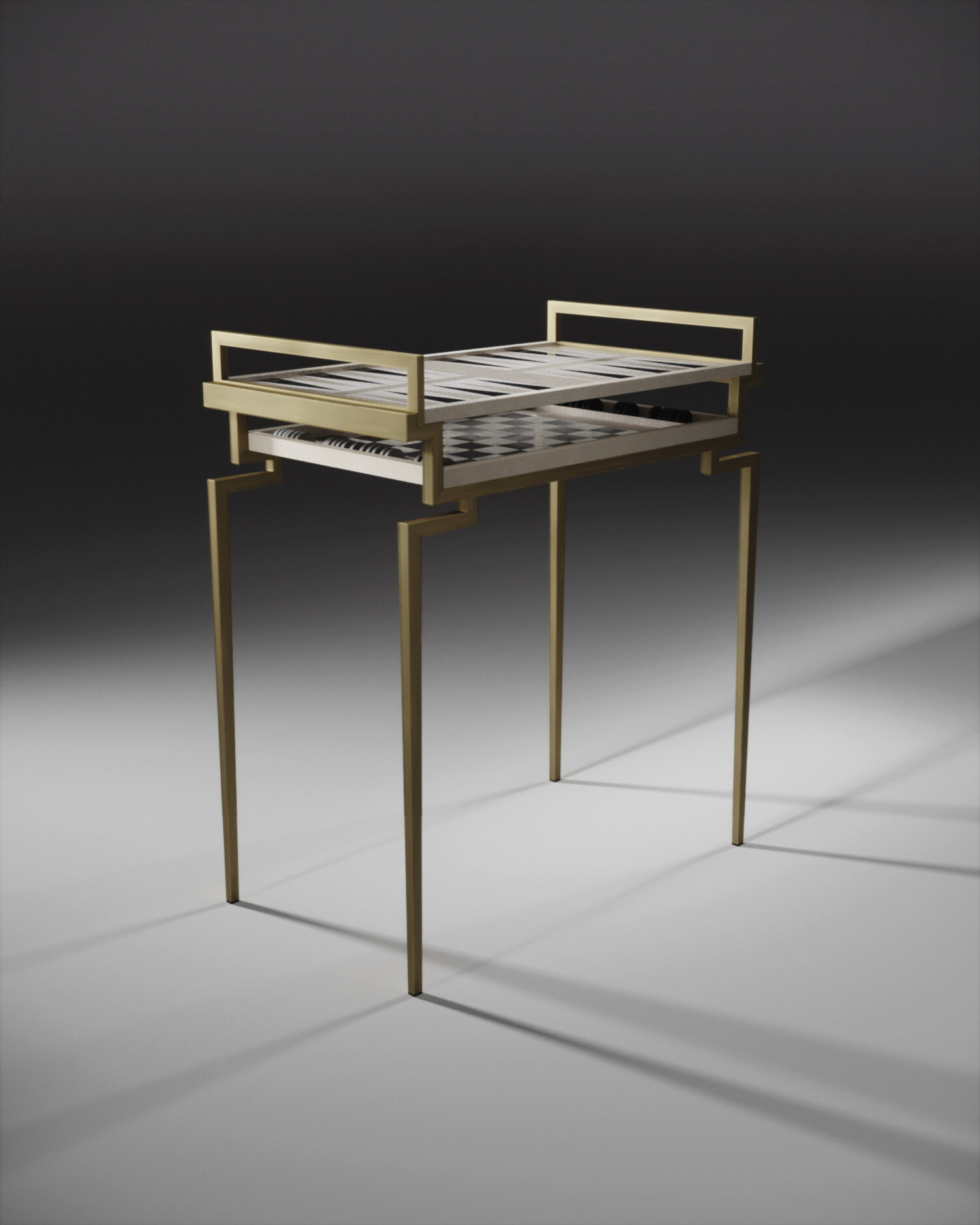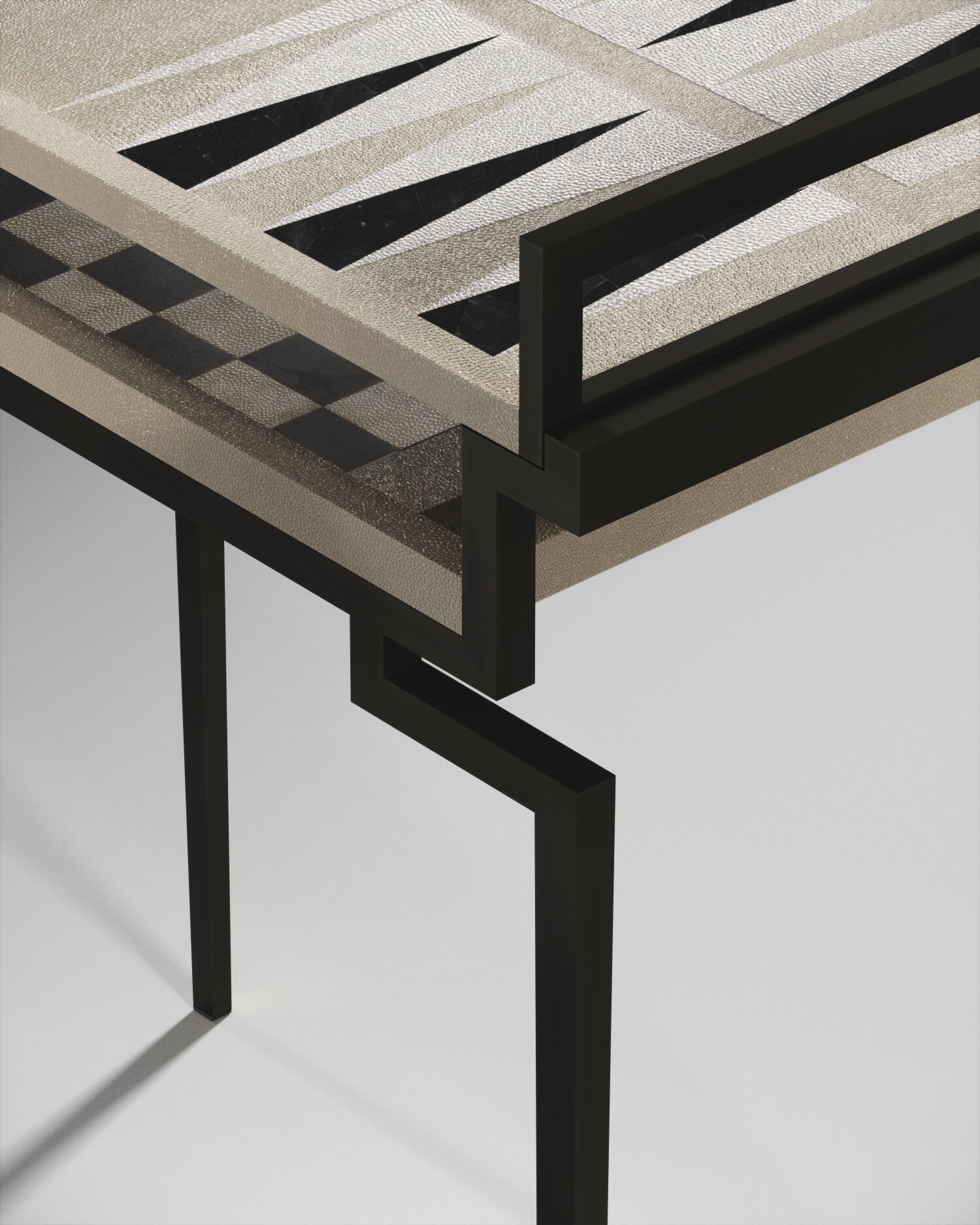 The Cecelia game table by R&Y Augousti inlaid in a mixture of cream shagreen, black pen shell and brass is the ultimate luxury piece of furniture. The top tabletop tray is for backgammon and the bottom tabletop tray is for chess. Each tabletop tray is removable to allow versatility to the overall piece. Sold with all game chips and accessories needed for chess and backgammon. Also available in black metal.
