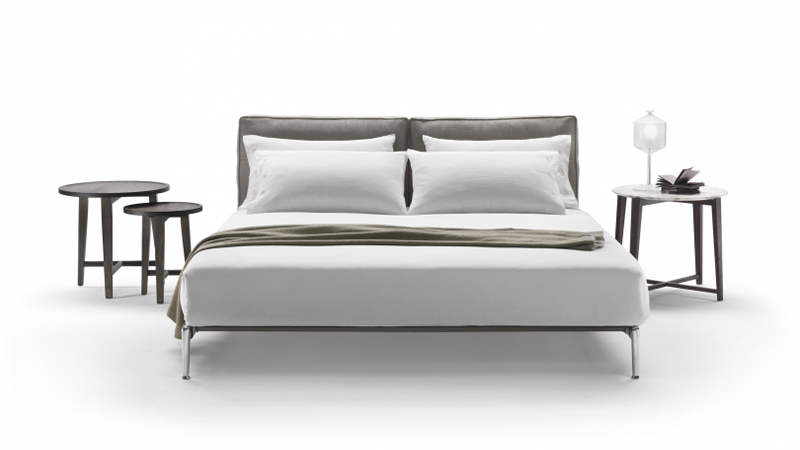 于是趁熱又設(shè)計出一款同名床具。線條簡單,設(shè)計一目了然,光滑的金屬與織布相結(jié)合,鵝毛填充的方正靠墊柔軟又舒適。