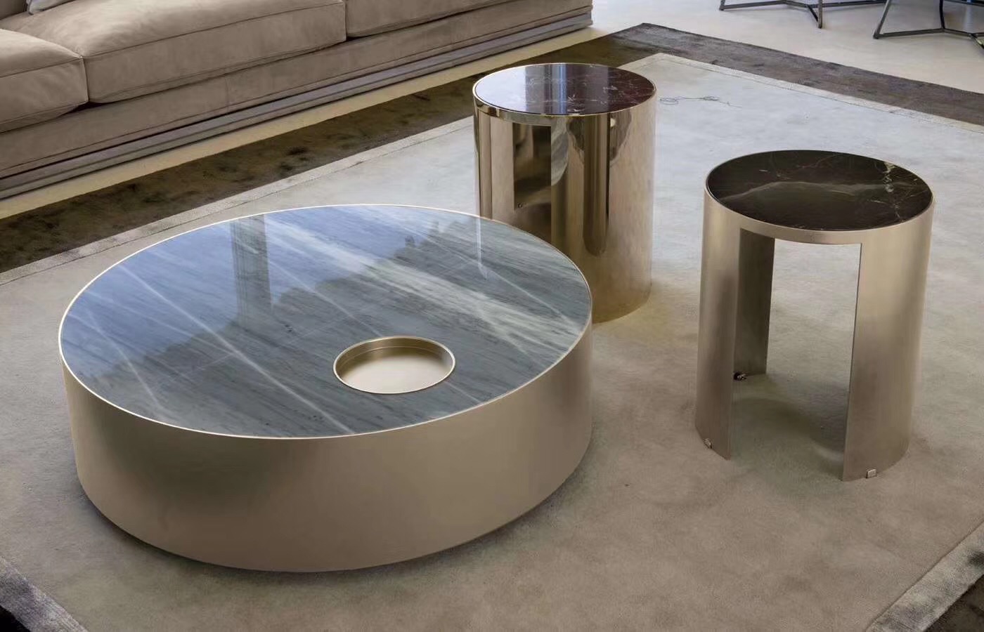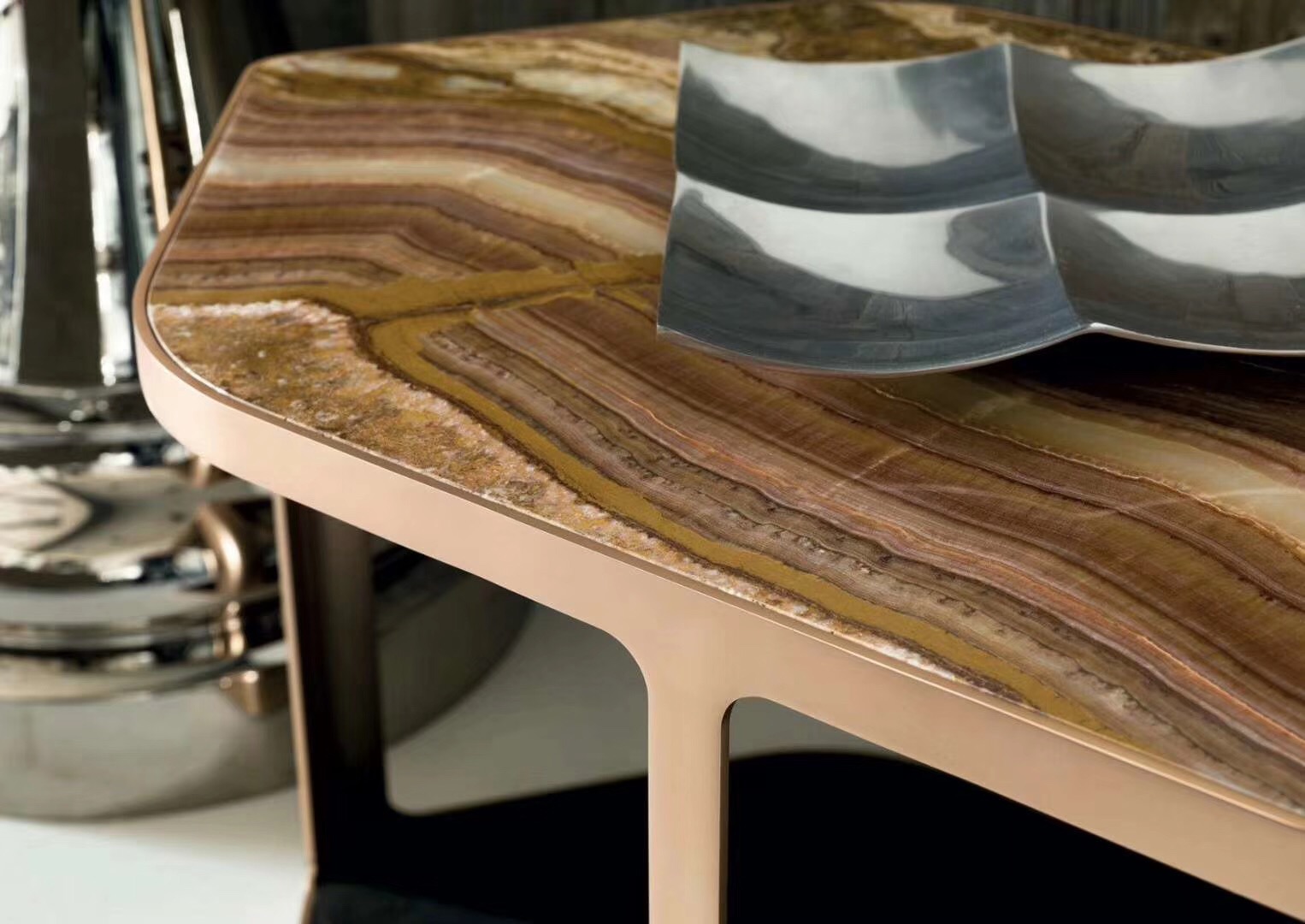 高密度特殊材料模制的金屬框架,香檳啞光金黃色的底座,明亮的光芒更加襯托光澤感,大理石材質(zhì)的桌面與金屬的搭配,富有沖擊感!