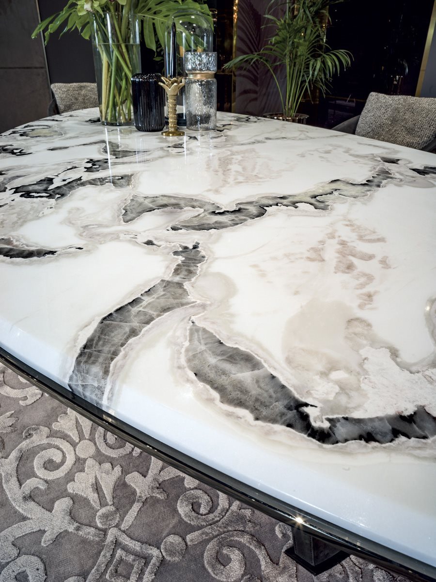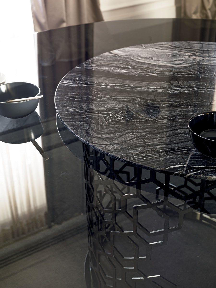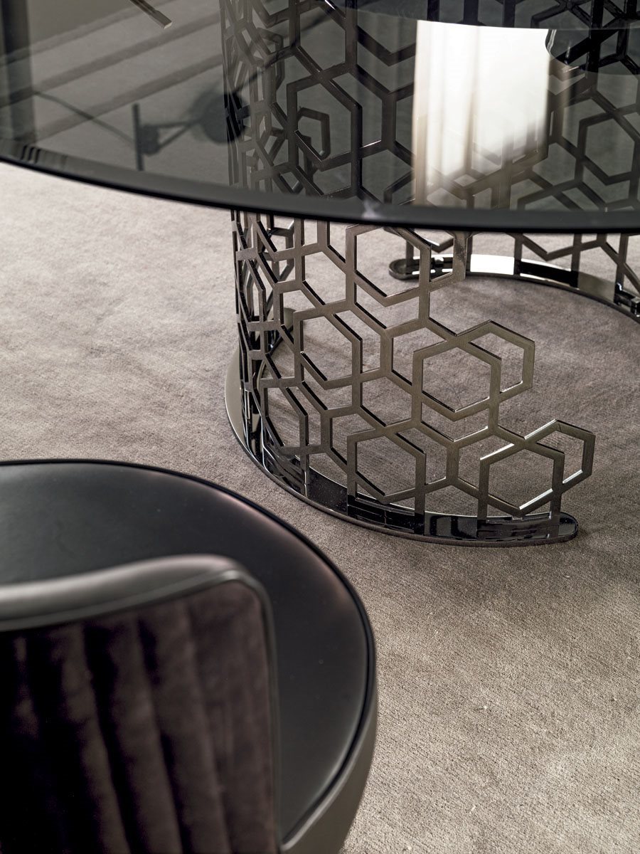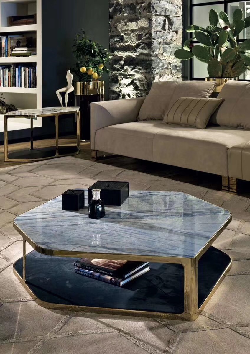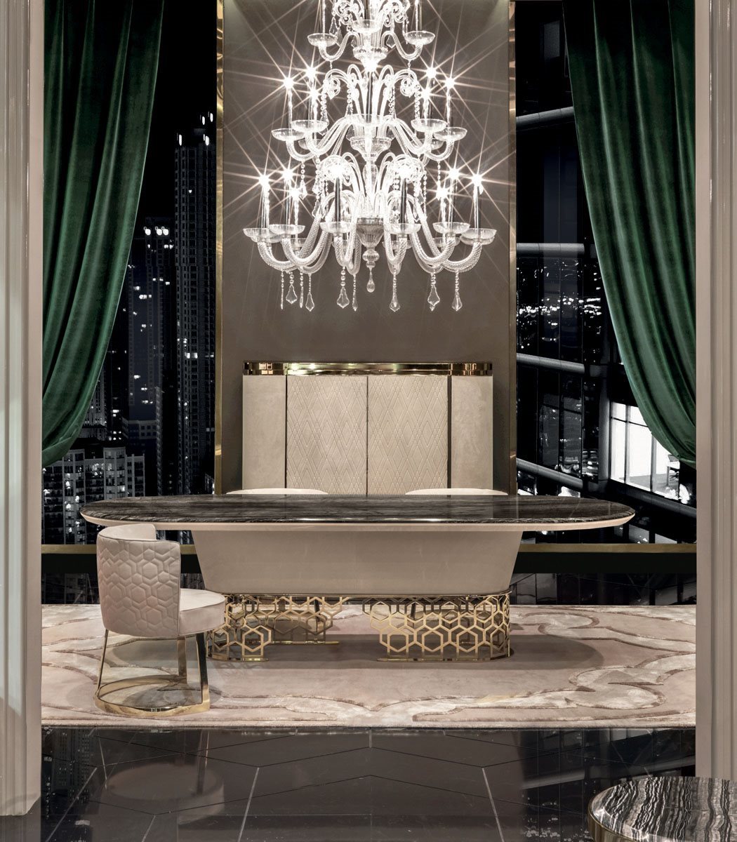 像MANFRED這樣的餐桌桌角是LONGHI的最大特色,也是LONGHI最有辨識(shí)度的地方,無數(shù)個(gè)六邊形重疊組合組成的空心圓柱型桌柱,光滑的大理石桌面提升質(zhì)感,金色的桌角又讓奢華感變得不那么俗氣!