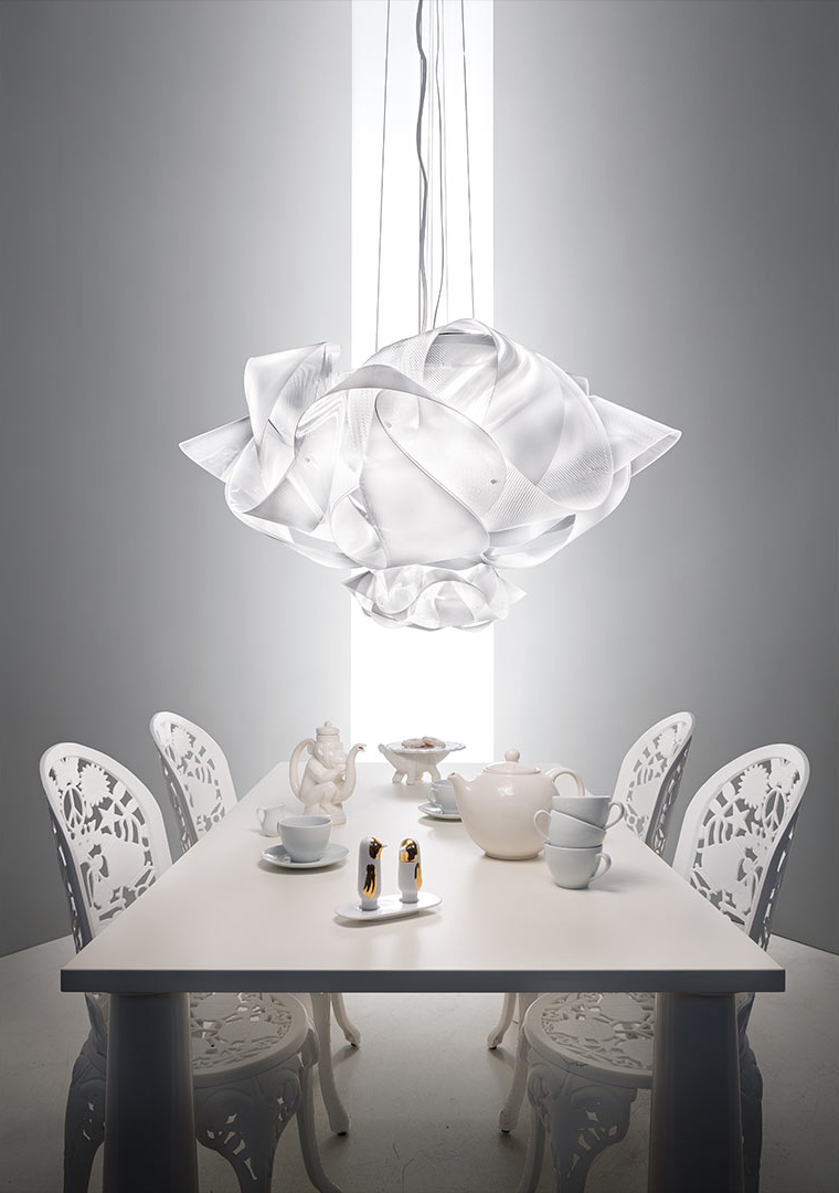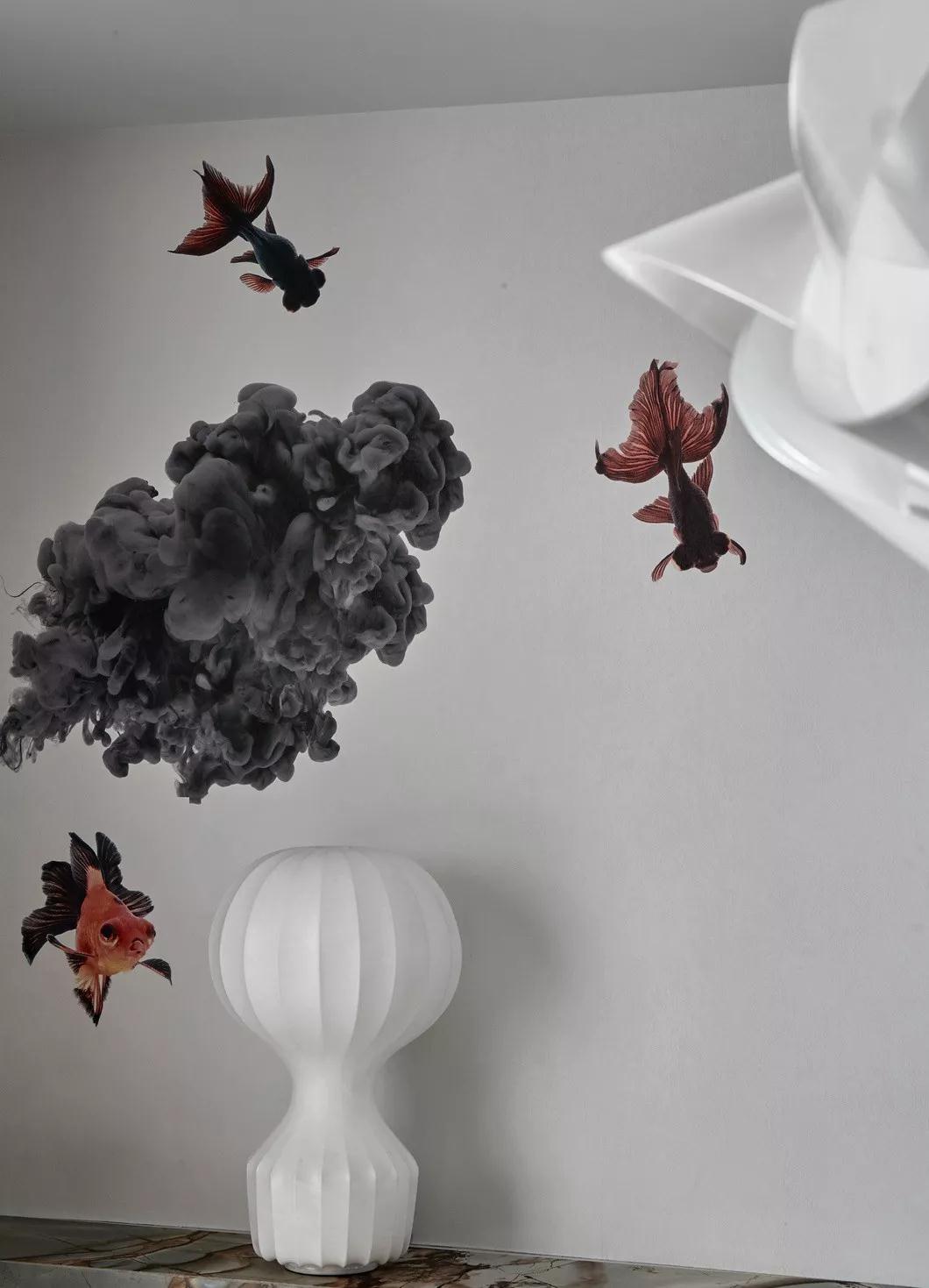 餐廳是家人齊聚時交流談心 共進(jìn)美食的區(qū)域,男主人對魚情有獨鐘,因此在餐廳墻上游戲著各式各樣的小金魚,而餐廳上方Slamp Fabula 系列的吊燈和魚兒嬉戲的場景相得益彰。
