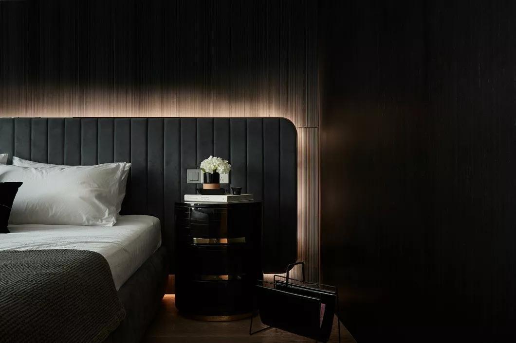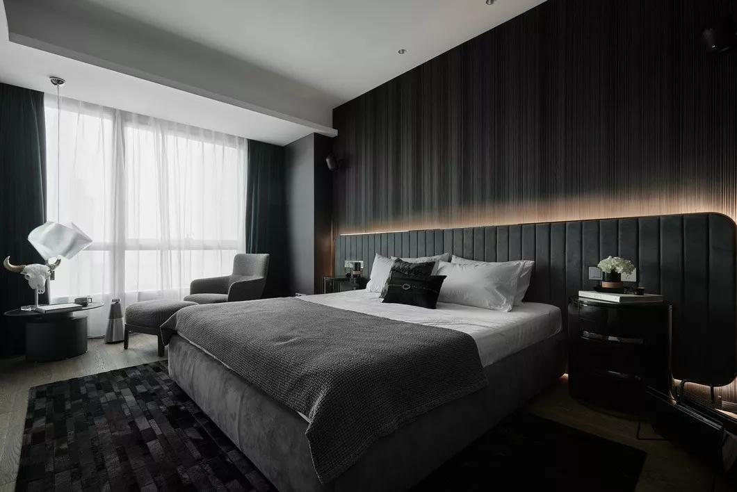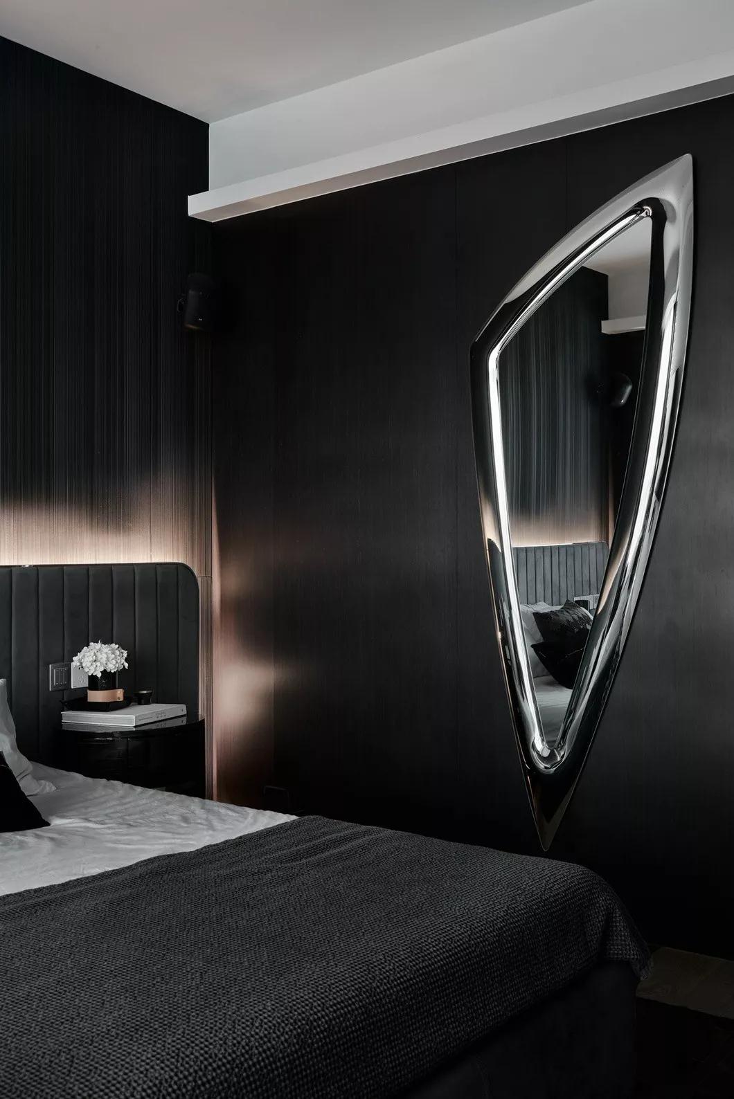 主臥以黑色為背景,加入了男主人慣用的不銹鋼、大理石和玻璃材質(zhì)。