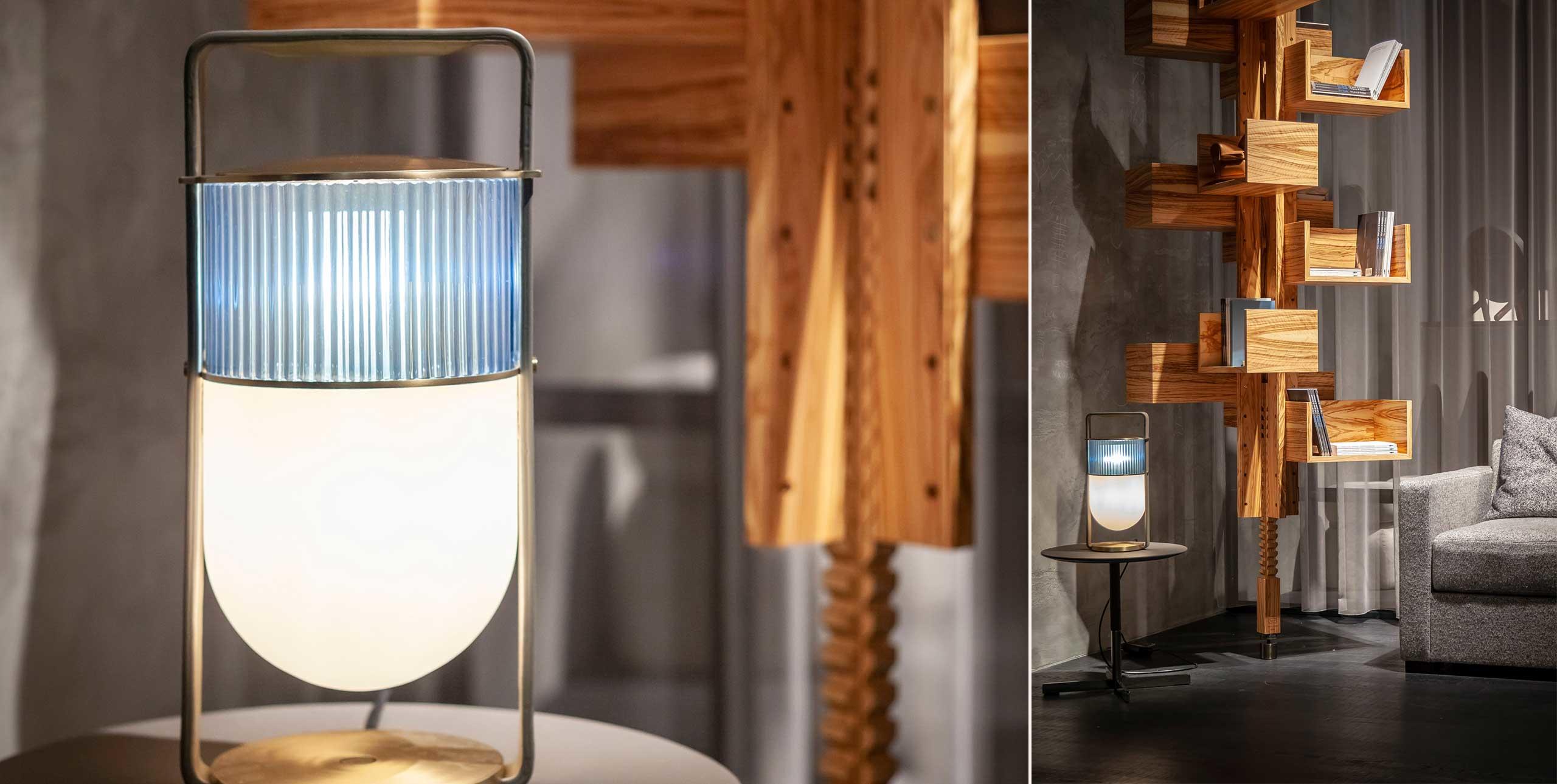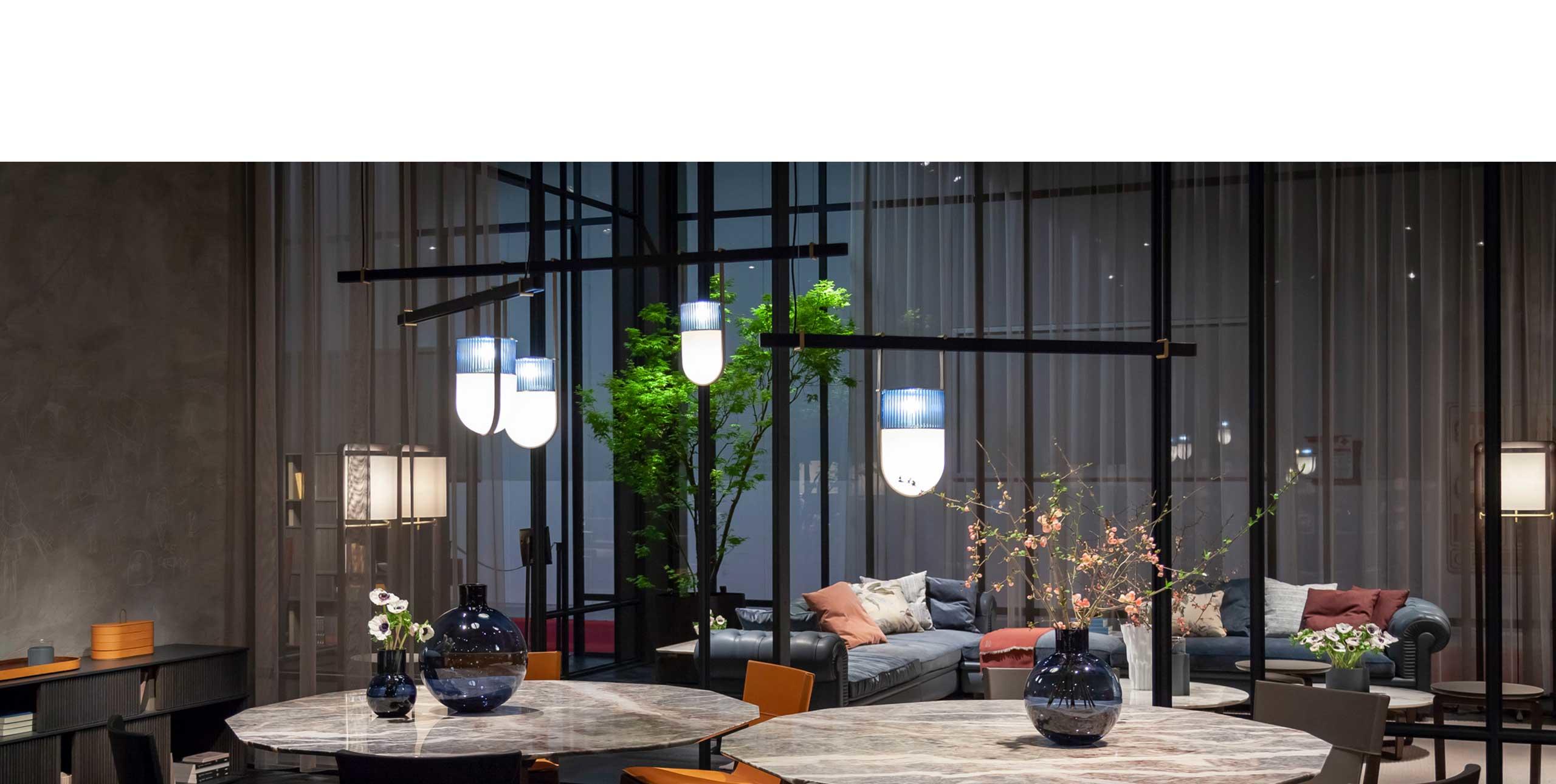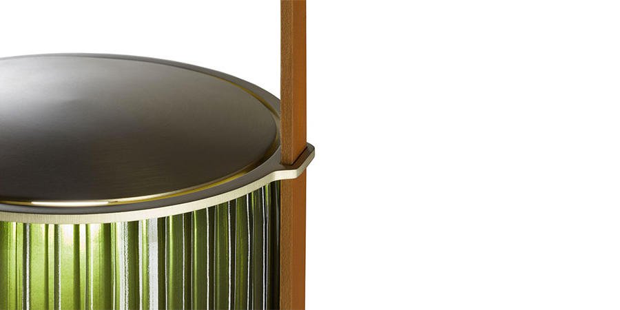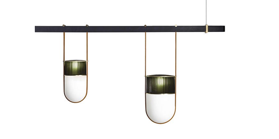 吹制的玻璃和馬鞍皮制成的燈線就像燈籠一般,使燈具的整體造型如純凈的線條和精致的材料對比,將吹制玻璃的兩種元素結(jié)合在一起,上部玻璃有一個特別均勻的表面,是透明的陰影琥珀(祖母綠、寶石或月亮石),下半部分由一部分珍珠制成,只為讓光線更溫暖更加發(fā)散!