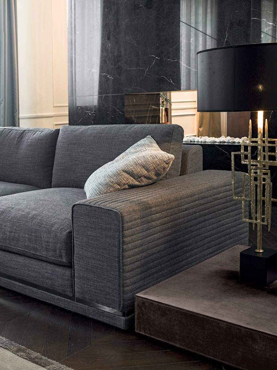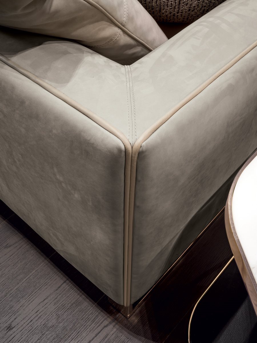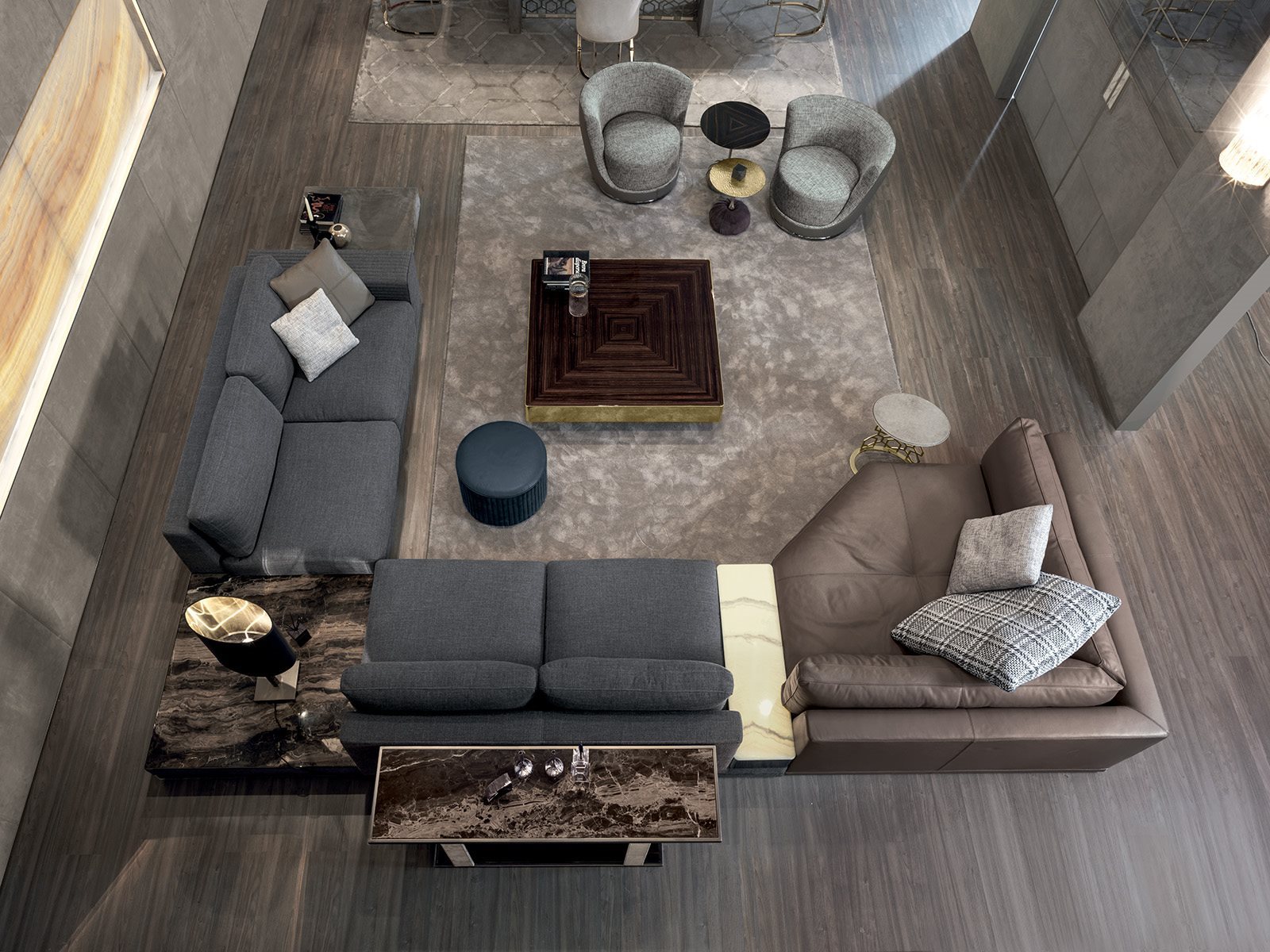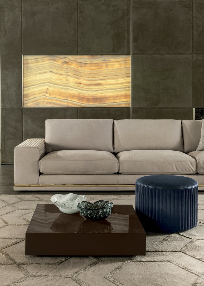該系列最大的特點(diǎn)就是有兩種不同系列的扶手,一方面是高飽和填充扶手,皮革與布質(zhì)的組合型沙發(fā)更添質(zhì)感,另一方面是瑪瑙調(diào)光石或大理石的嵌入,柔軟與剛硬的相互融合,也增加了使用感。