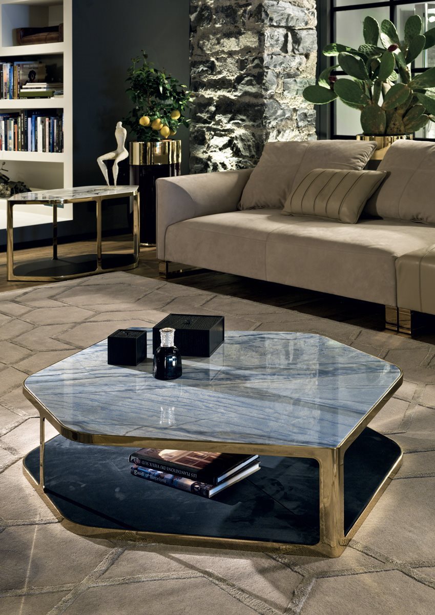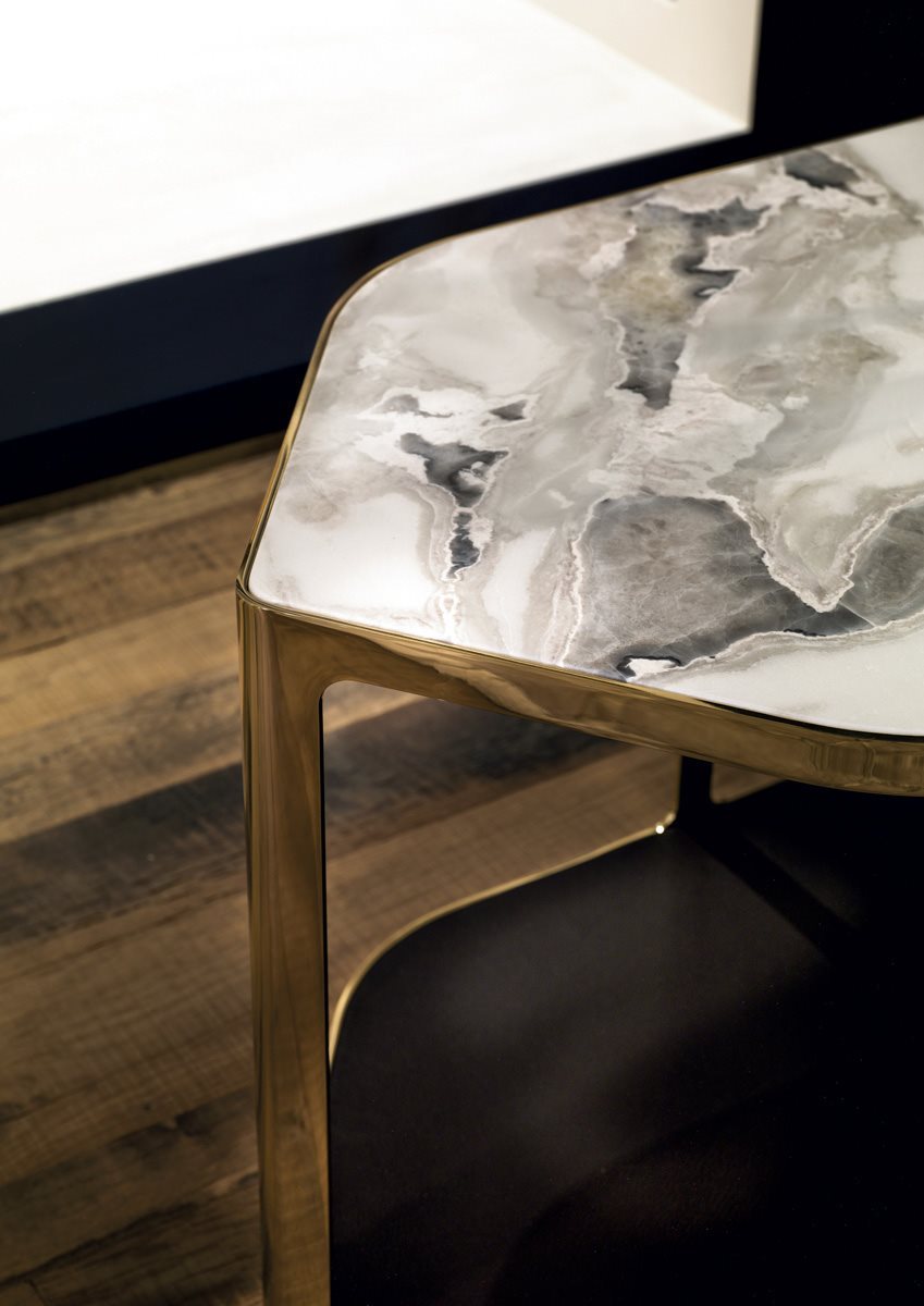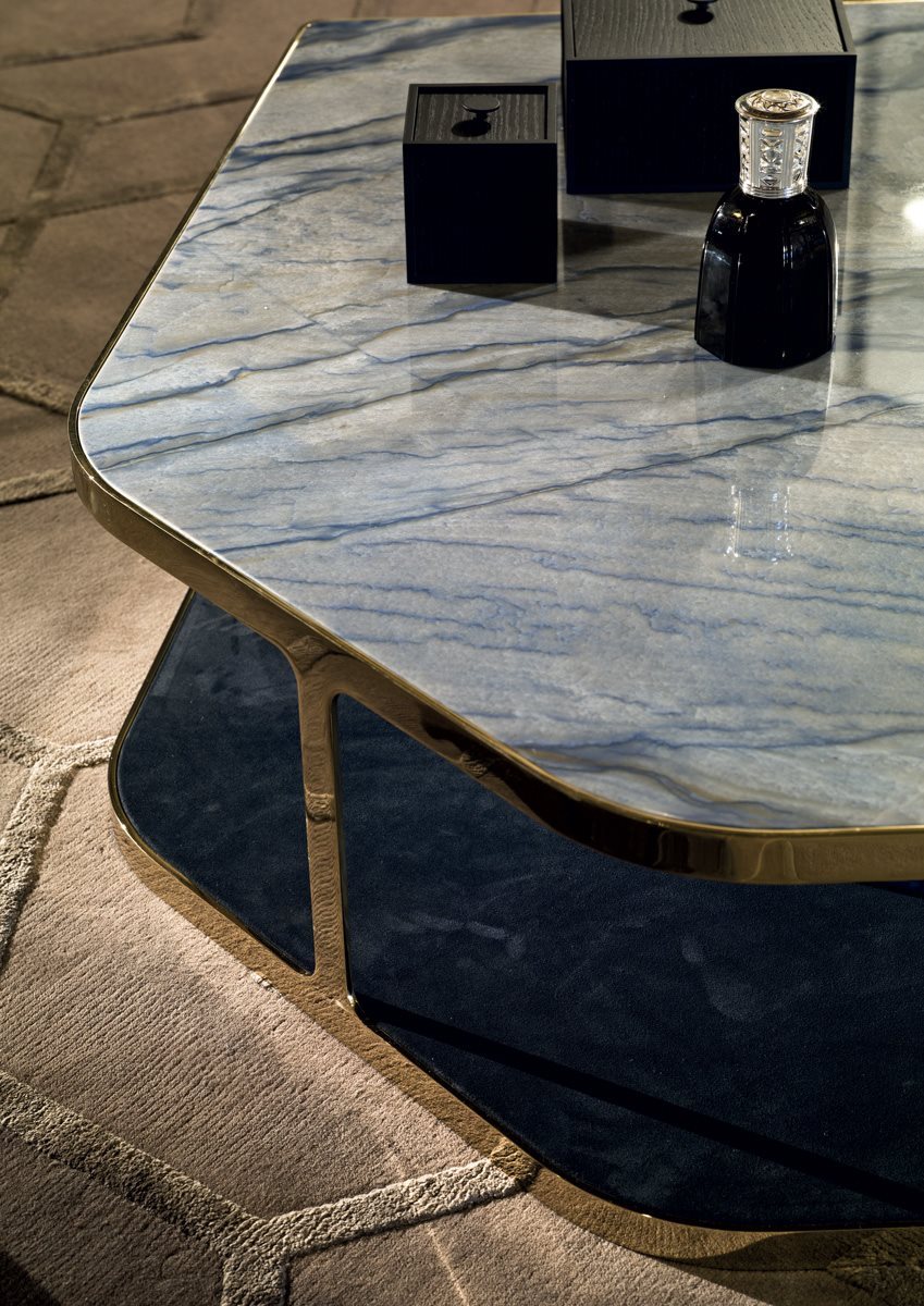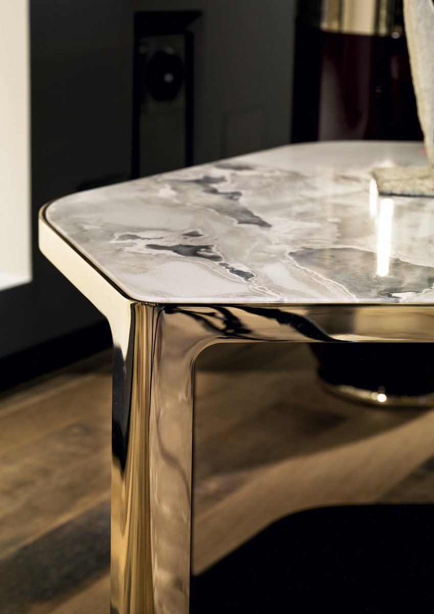 與FOLD沙發(fā)搭配的是TILES茶幾,全片鐳射切割的整鋼咖啡桌,加上整塊湛藍(lán)大理石鑲嵌,金屬的透亮加上大理石的光滑。將新古典中輕奢的風(fēng)格展露無疑。