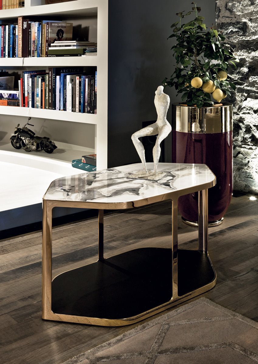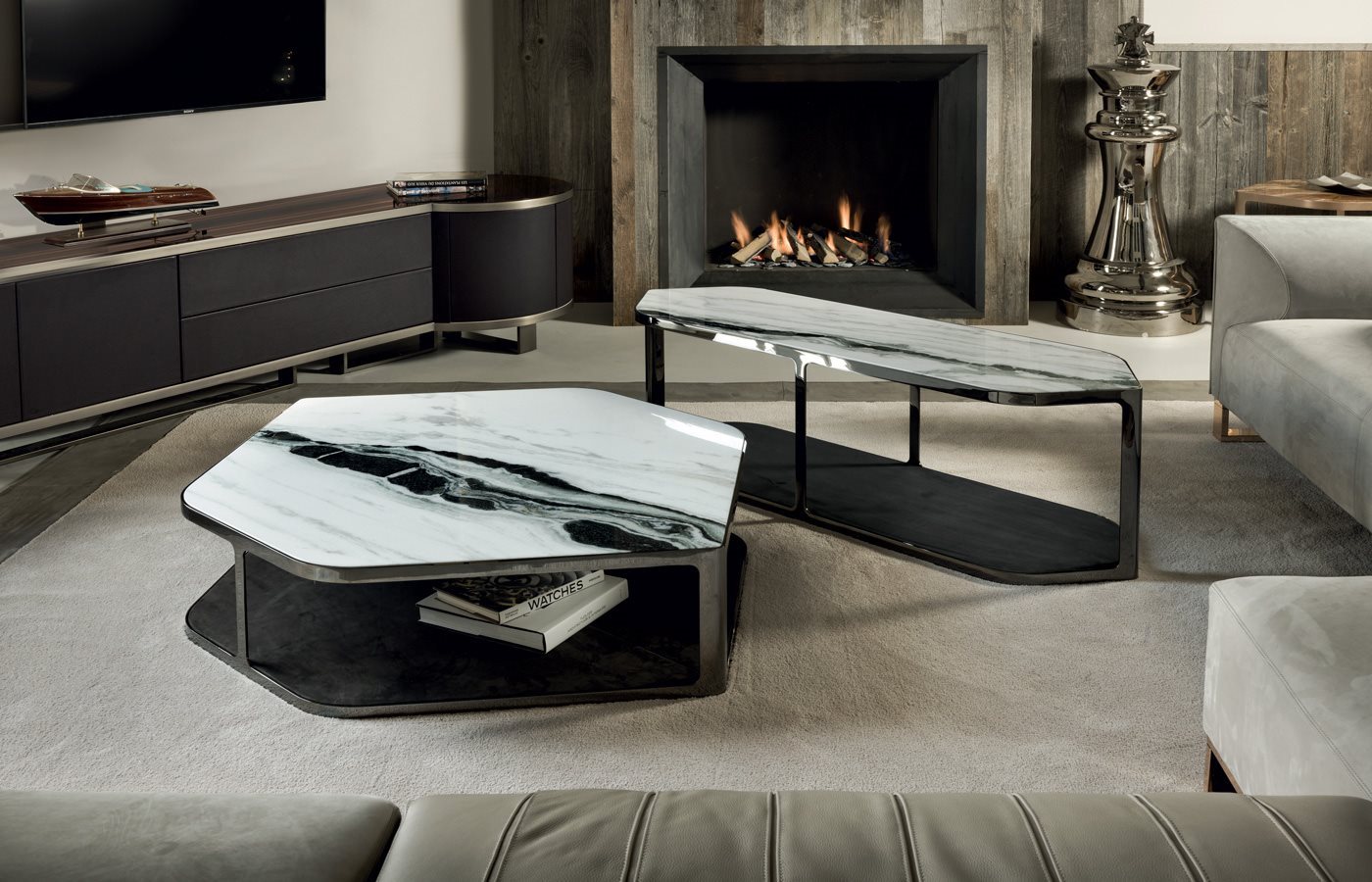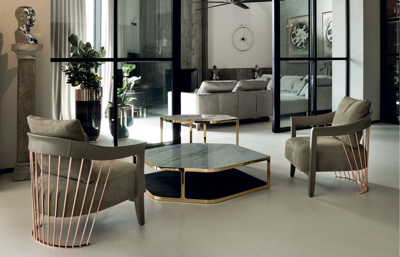 與FOLD沙發(fā)搭配的是TILES茶幾,全片鐳射切割的整鋼咖啡桌,加上整塊湛藍(lán)大理石鑲嵌,金屬的透亮加上大理石的光滑。將新古典中輕奢的風(fēng)格展露無疑。