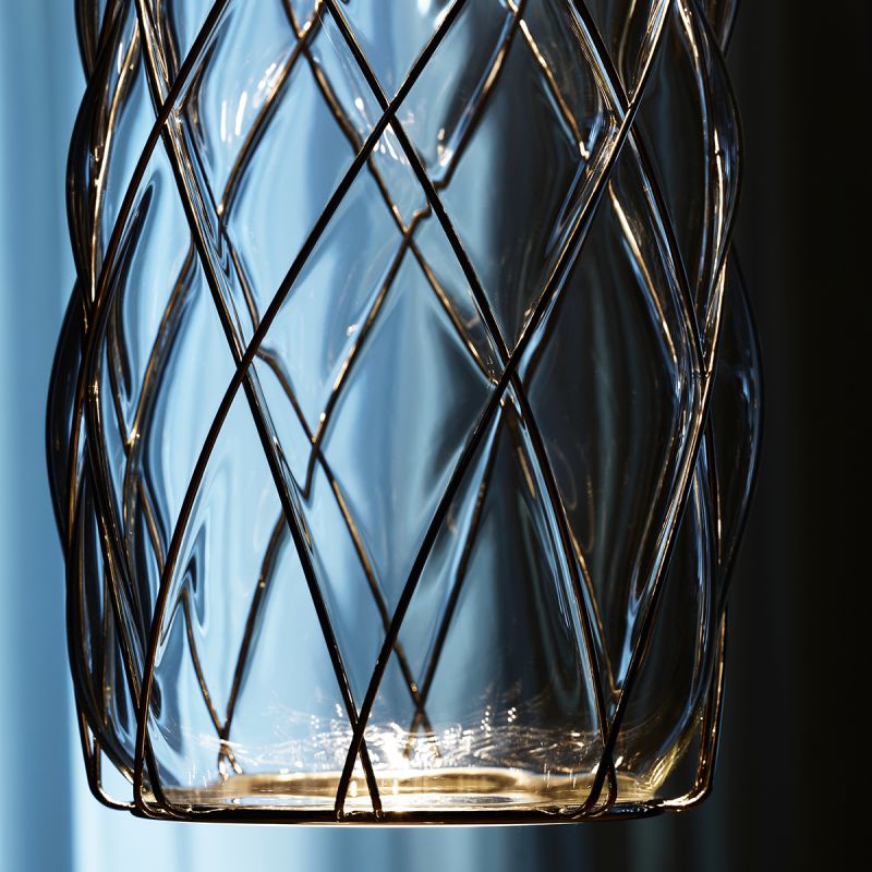 Pinecone系列的外型是一顆松果,是運(yùn)用古老的籠狀吹制玻璃技術(shù)吹制而成的。Navone在金屬籠增加透明版,呈現(xiàn)出雙重結(jié)構(gòu),增加了景觀效果,夜幕降臨時(shí)燈的圖案在周?chē)砻娉尸F(xiàn)出萬(wàn)花筒般的陰影效果。