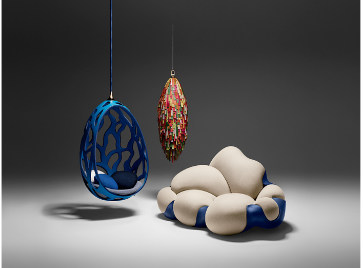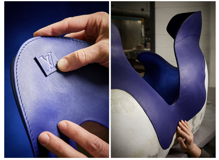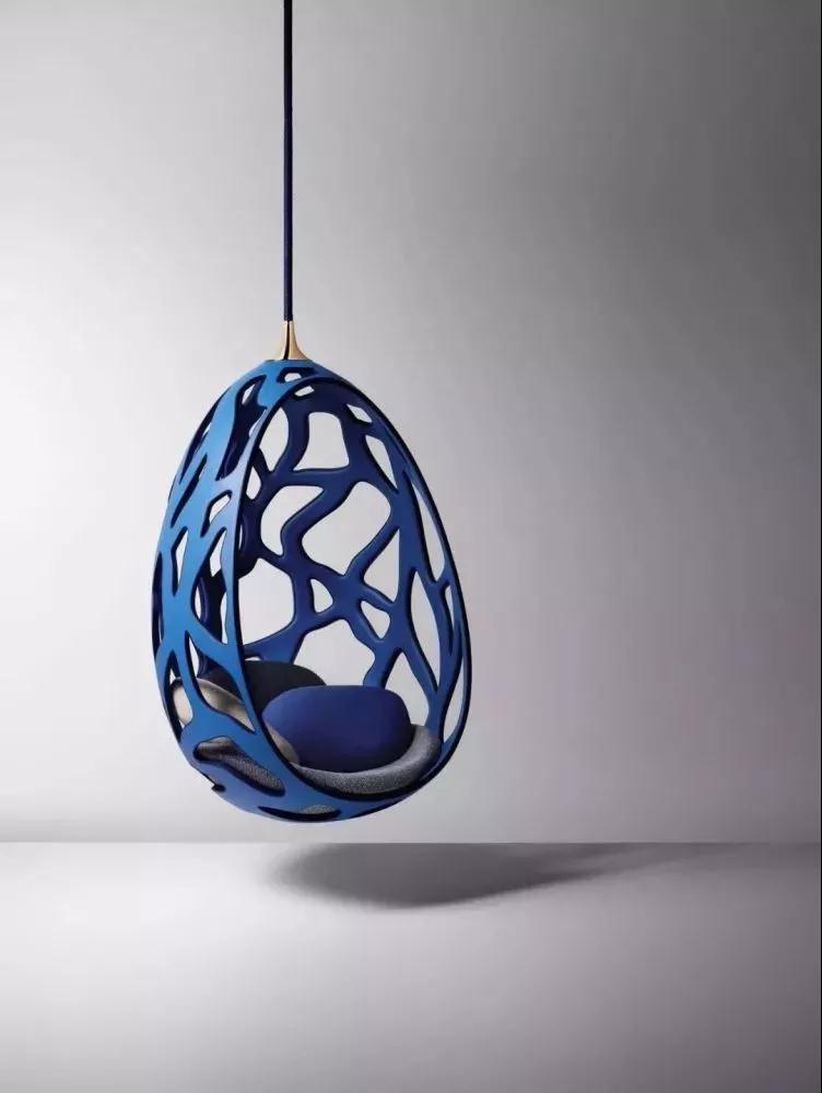 LOUIS VUITTON Cocoon蟬蛹形狀的秋千吊椅,外觀采用圓潤且鏤空的蛋殼形狀,藍(lán)色的設(shè)計(jì)更加具有夏日氣息。