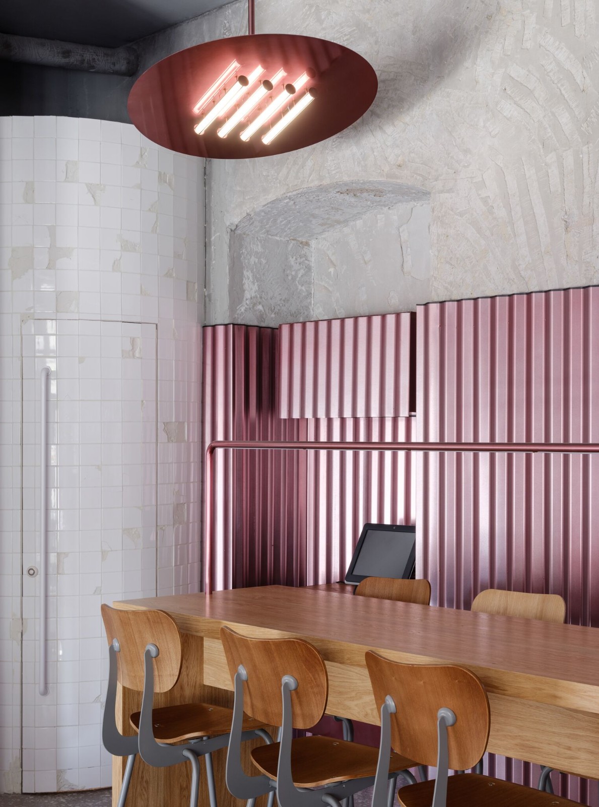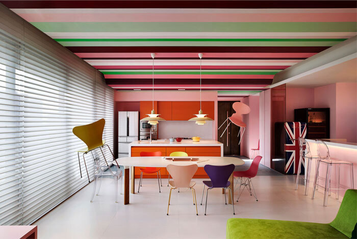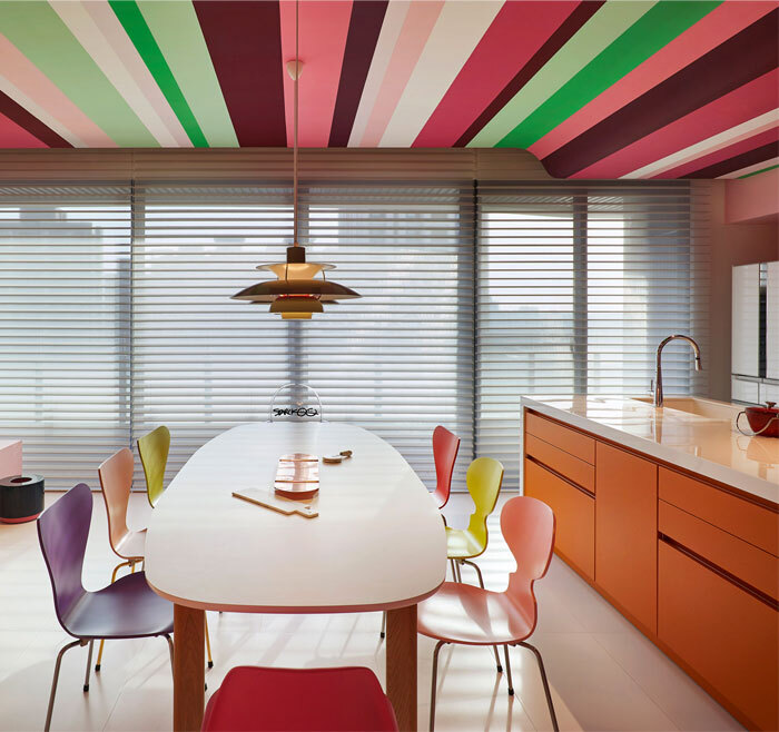 彩色的空間總是處處洋溢著生機(jī)與活力。以粉色作為底色的空間是個(gè)養(yǎng)眼的設(shè)計(jì),通過顏色飽和度的變化來增加空間的層次感,由彩色色條構(gòu)成的天花板充滿律動感。綠色與橙黃色的點(diǎn)綴又為這繽紛的空間解了“膩”。